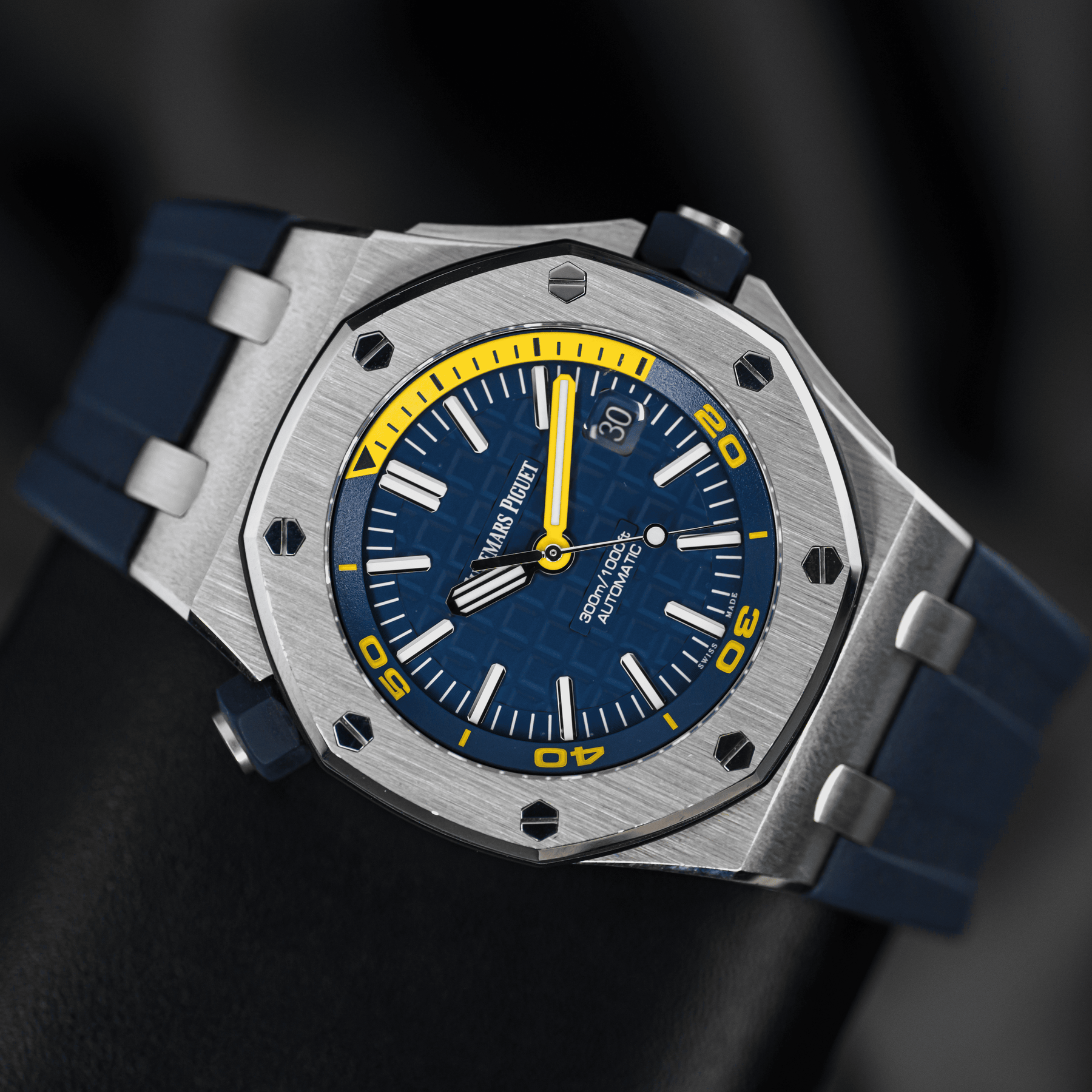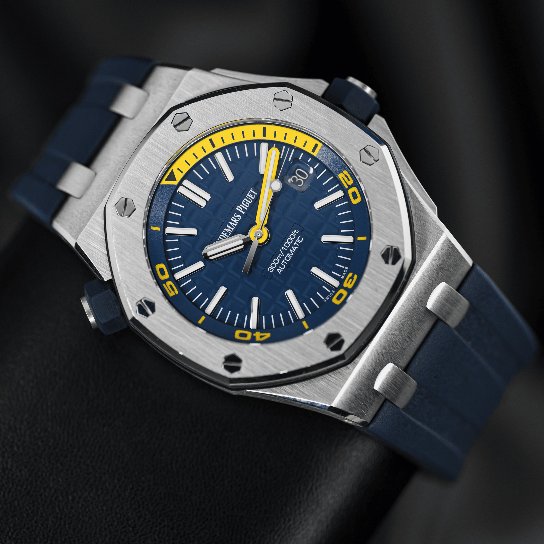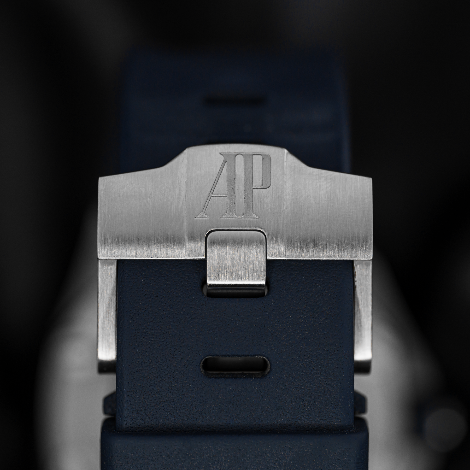The Audemars Piguet Royal Oak Offshore 15710ST "Navy Diver" is a stealth watch that flies under the radar while setting the owner apart. Designed for the depths, the 15710ST features a rugged 42mm stainless steel case, a durable silicone strap, and 300 meters of water resistance. Instead of a rotating dive bezel, this watch features an inner chapter ring bezel, controlled by a screw-down crown at 10 o'clock. Inside the "Navy Diver" is Audemars Piguet's in-house Caliber 3120 automatic movement with 60 hours of power reserve.
