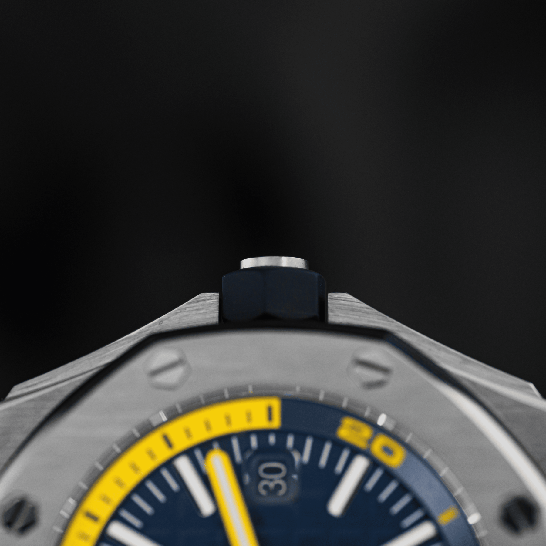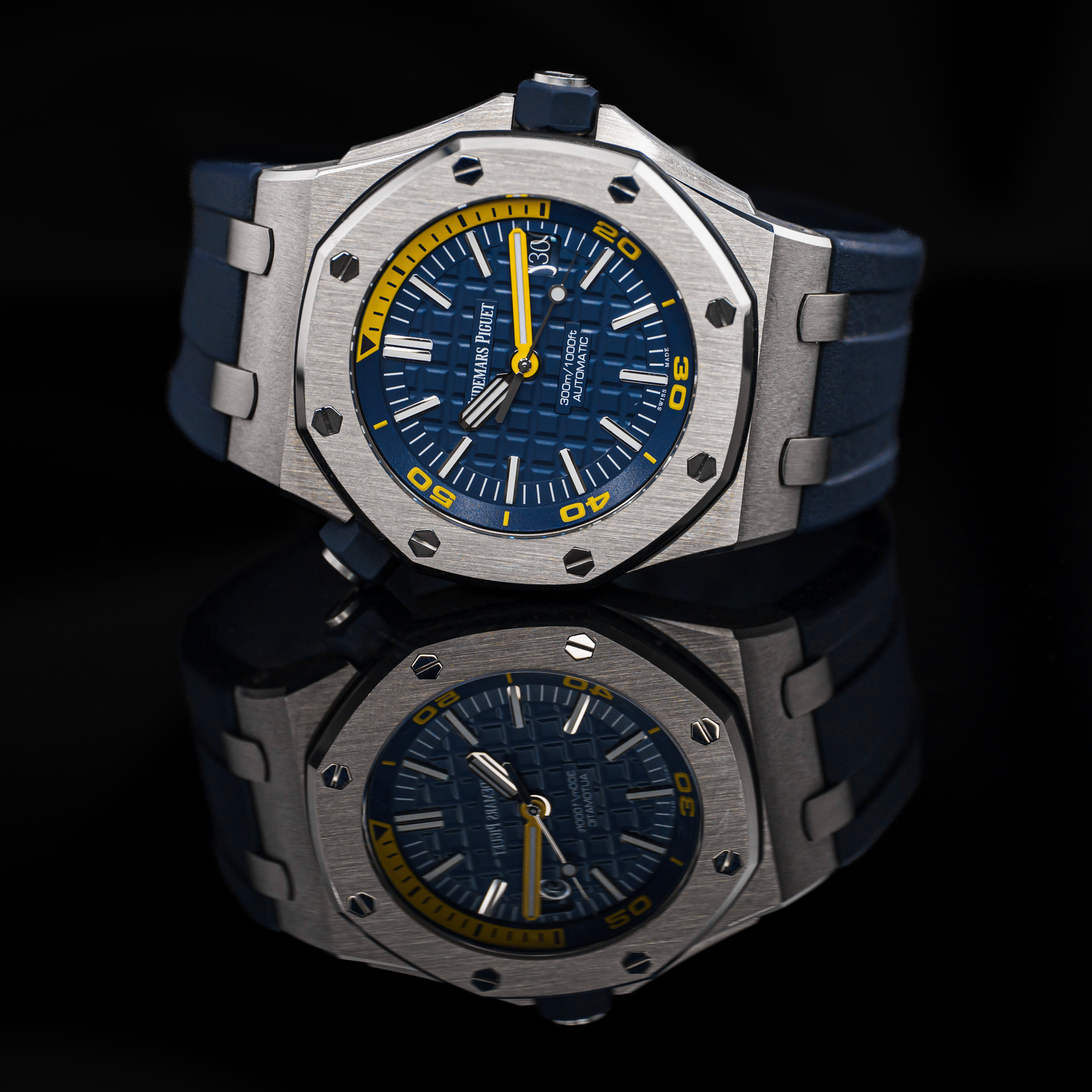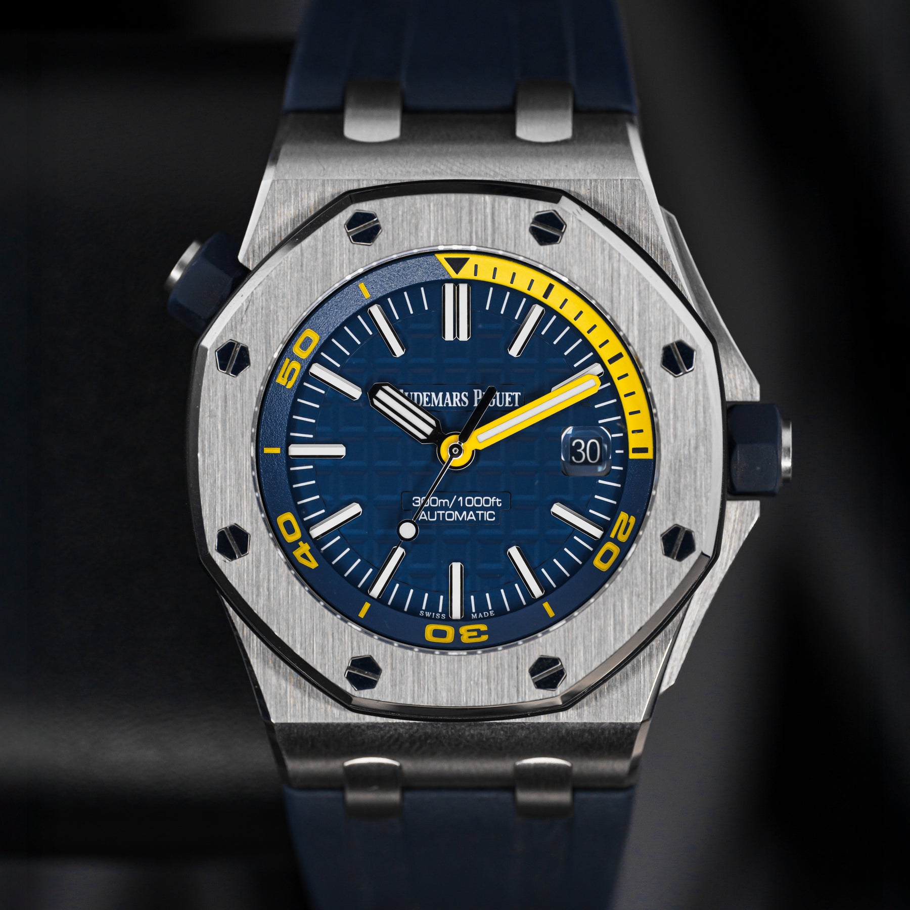 The Audemars Piguet Royal Oak Offshore 15710ST "Navy Diver" is a stealth watch that flies under the radar while setting the owner apart. Designed for the depths, the 15710ST features a rugged 42mm stainless steel case, a durable silicone strap, and 300 meters of water resistance. Instead of a rotating dive bezel, this watch features an inner chapter ring bezel, controlled by a screw-down crown at 10 o'clock. Inside the "Navy Diver" is Audemars Piguet's in-house Caliber 3120 automatic movement with 60 hours of power reserve.