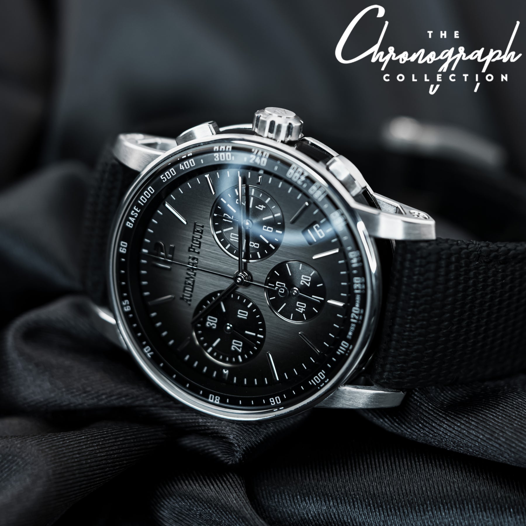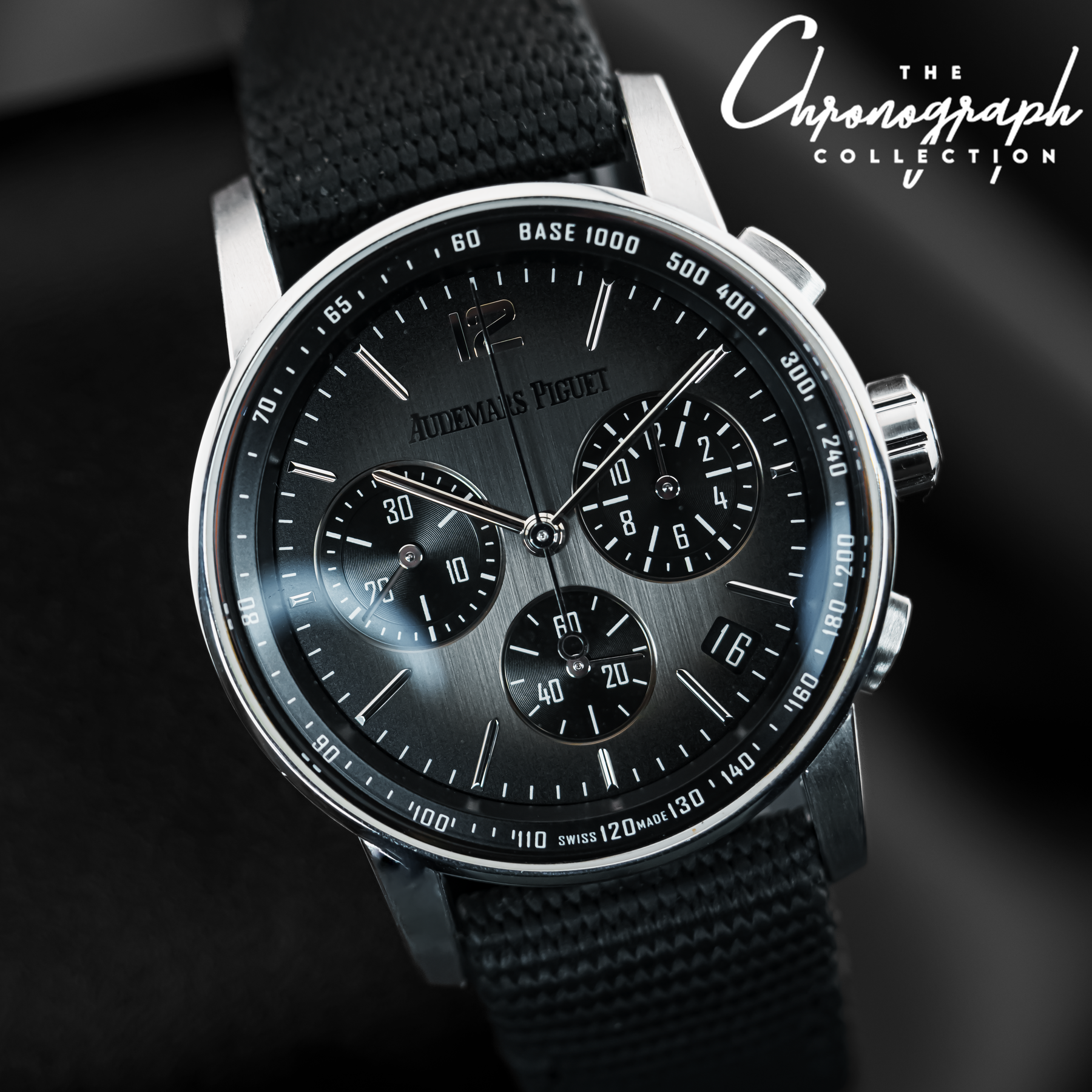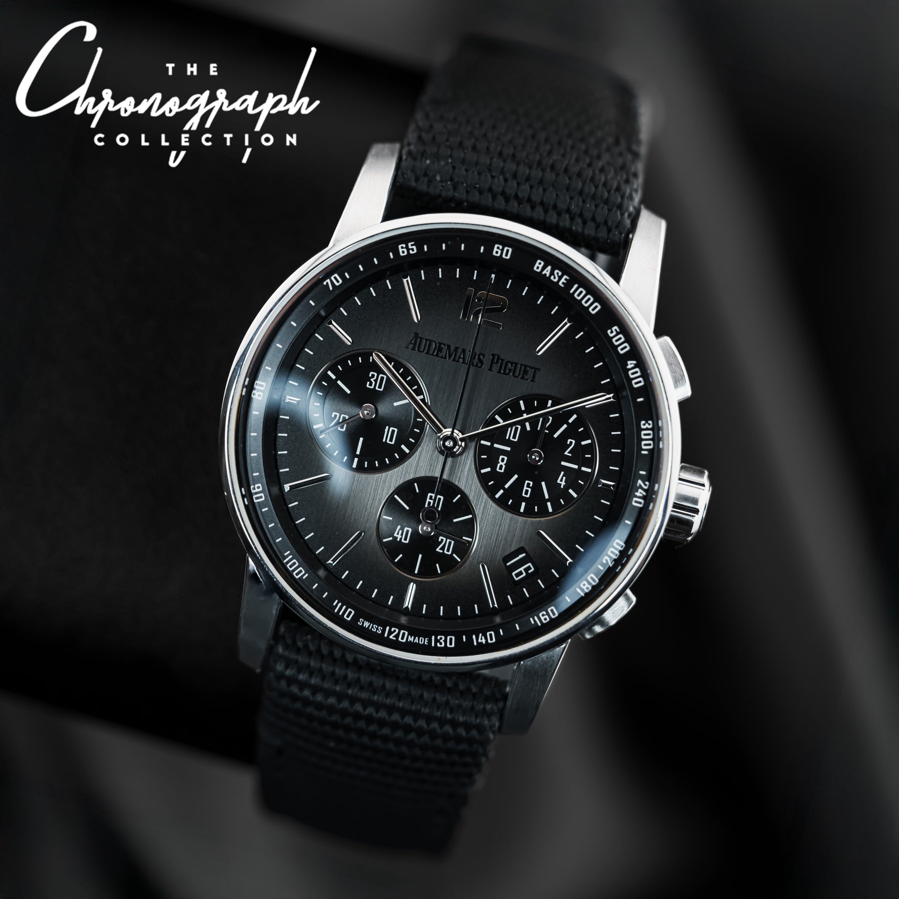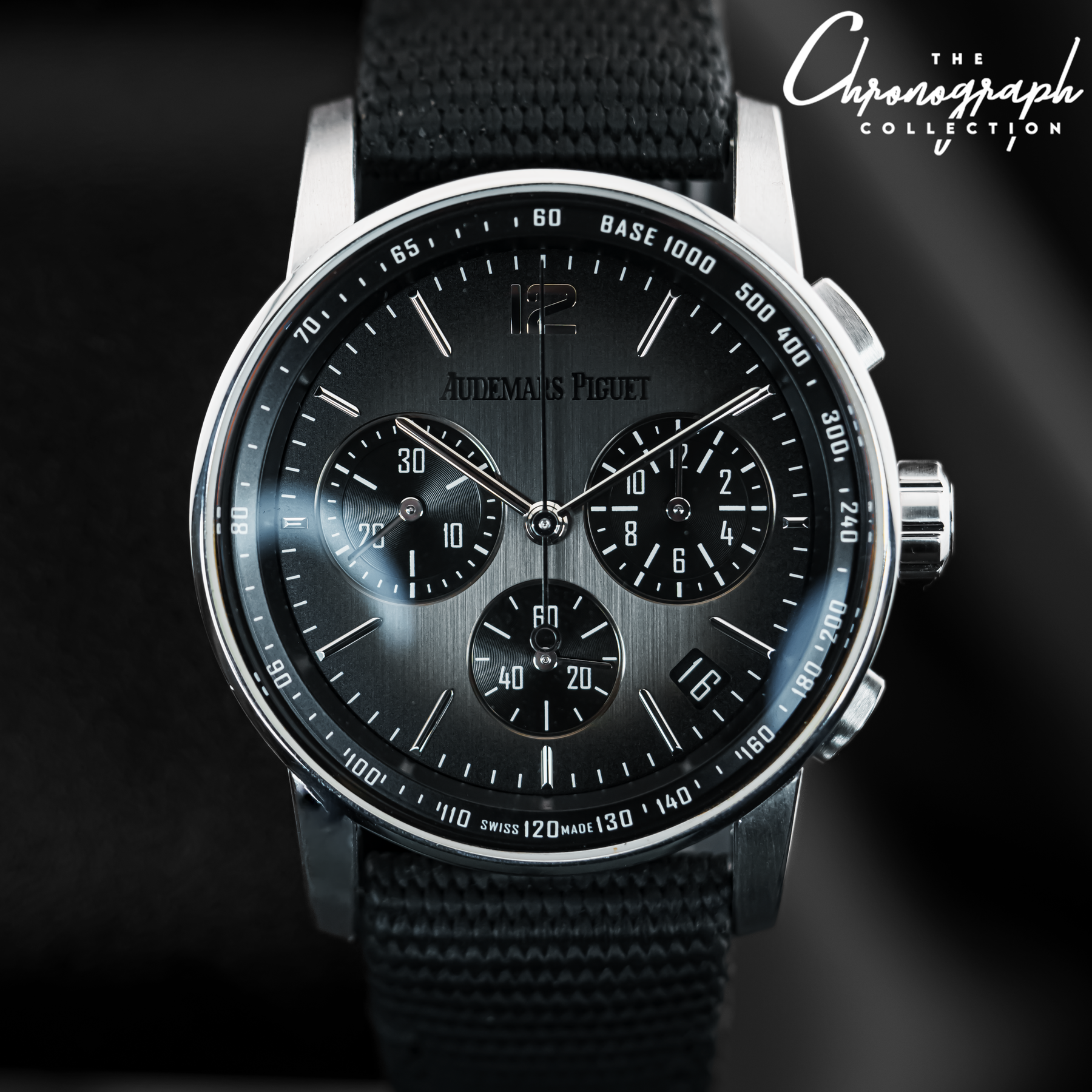 The Code 11.59 is one of Audemars Piguet's most abstract modern designs, combining timeless recognizability with experimental engineering. The case measures 41mm in diameter and is made from solid white gold, with hollow lugs and a very slightly domed sapphire crystal. The "smoke dial" has a stunning vertical brushed finish, with a small seconds subdial and two chronograph subdials, and a date window at 4:30. Powering the Code 11.59 is Audemars Piguet's in-house Caliber AP 4401 automatic movement (a column wheel flyback chronograph movement) with 70 hours of power reserve.