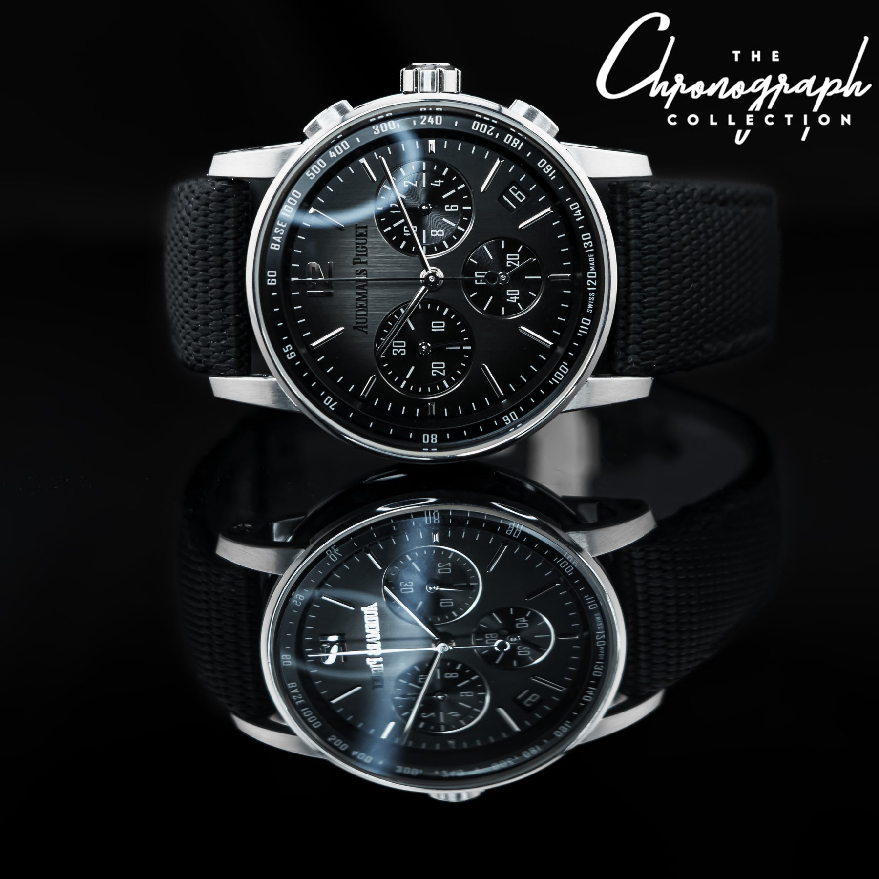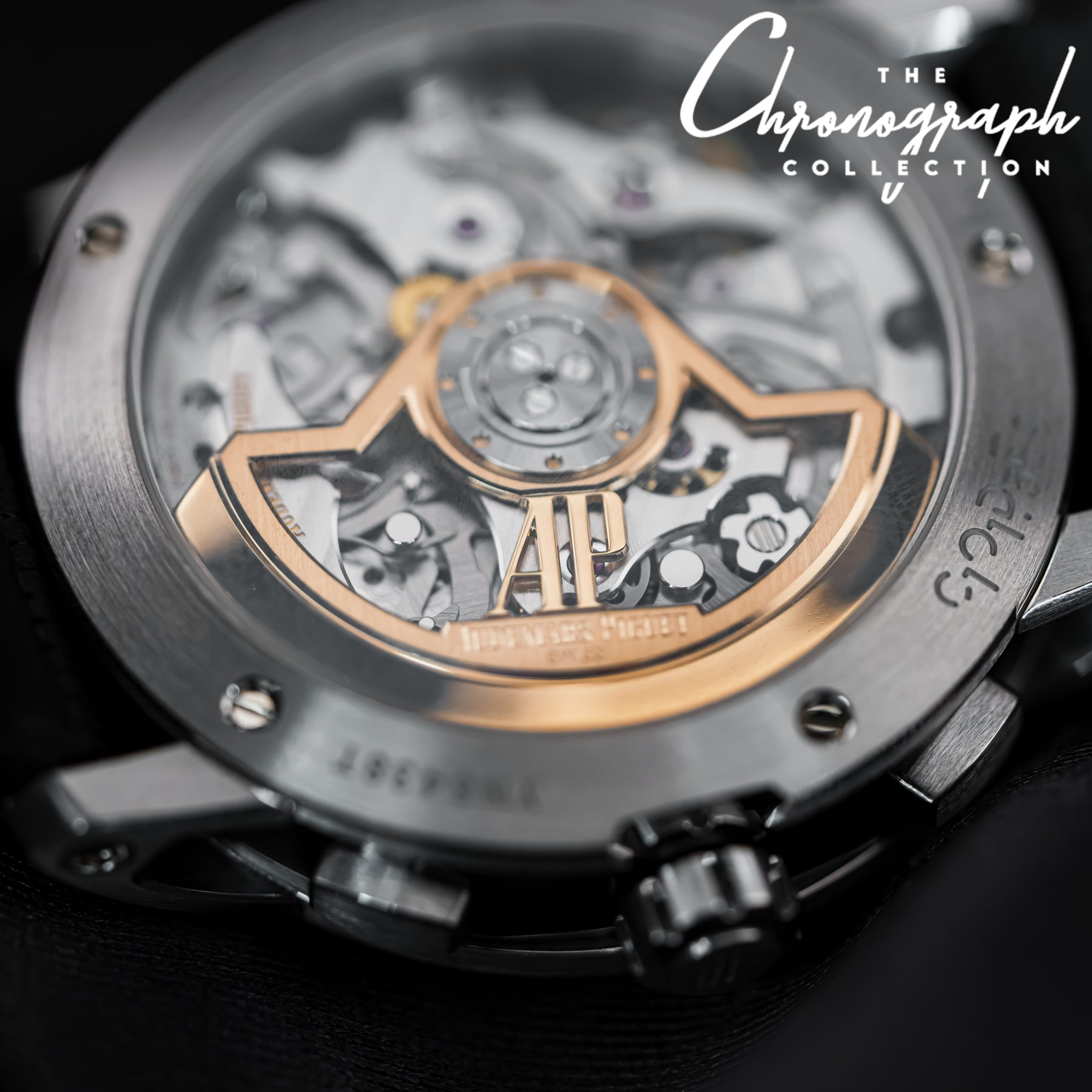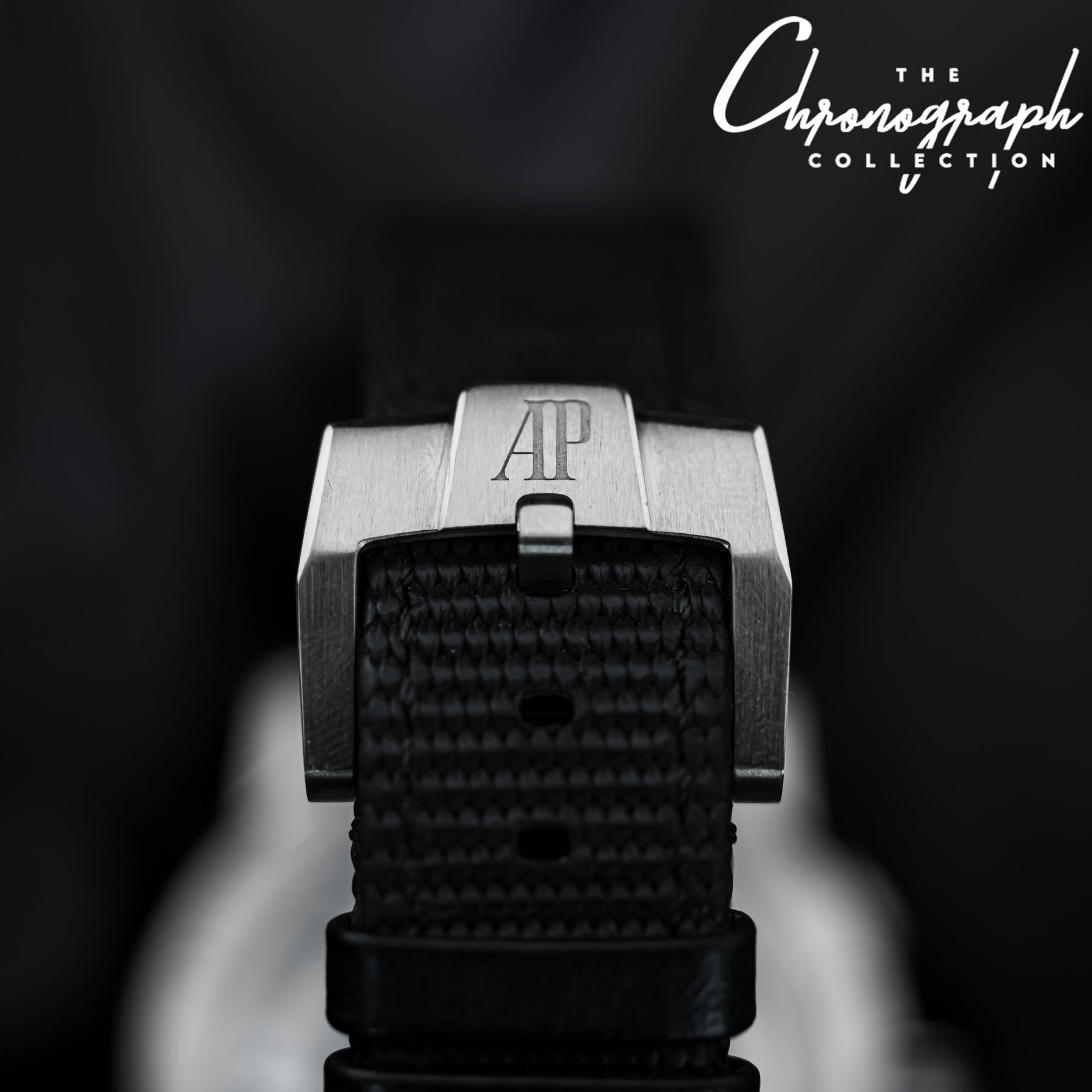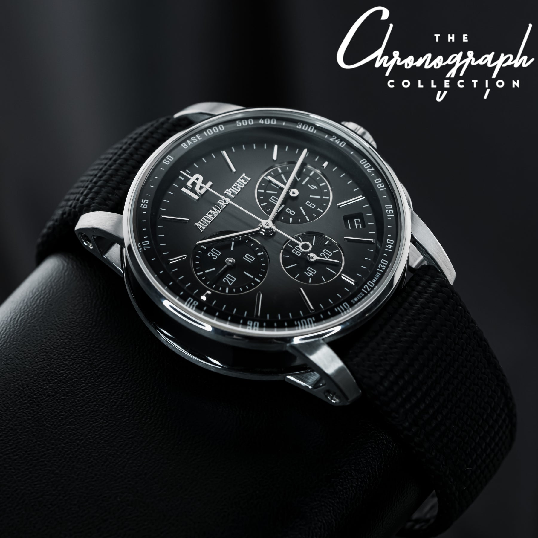 The Code 11.59 is one of Audemars Piguet's most abstract modern designs, combining timeless recognizability with experimental engineering. The case measures 41mm in diameter and is made from solid white gold, with hollow lugs and a very slightly domed sapphire crystal. The "smoke dial" has a stunning vertical brushed finish, with a small seconds subdial and two chronograph subdials, and a date window at 4:30. Powering the Code 11.59 is Audemars Piguet's in-house Caliber AP 4401 automatic movement (a column wheel flyback chronograph movement) with 70 hours of power reserve.