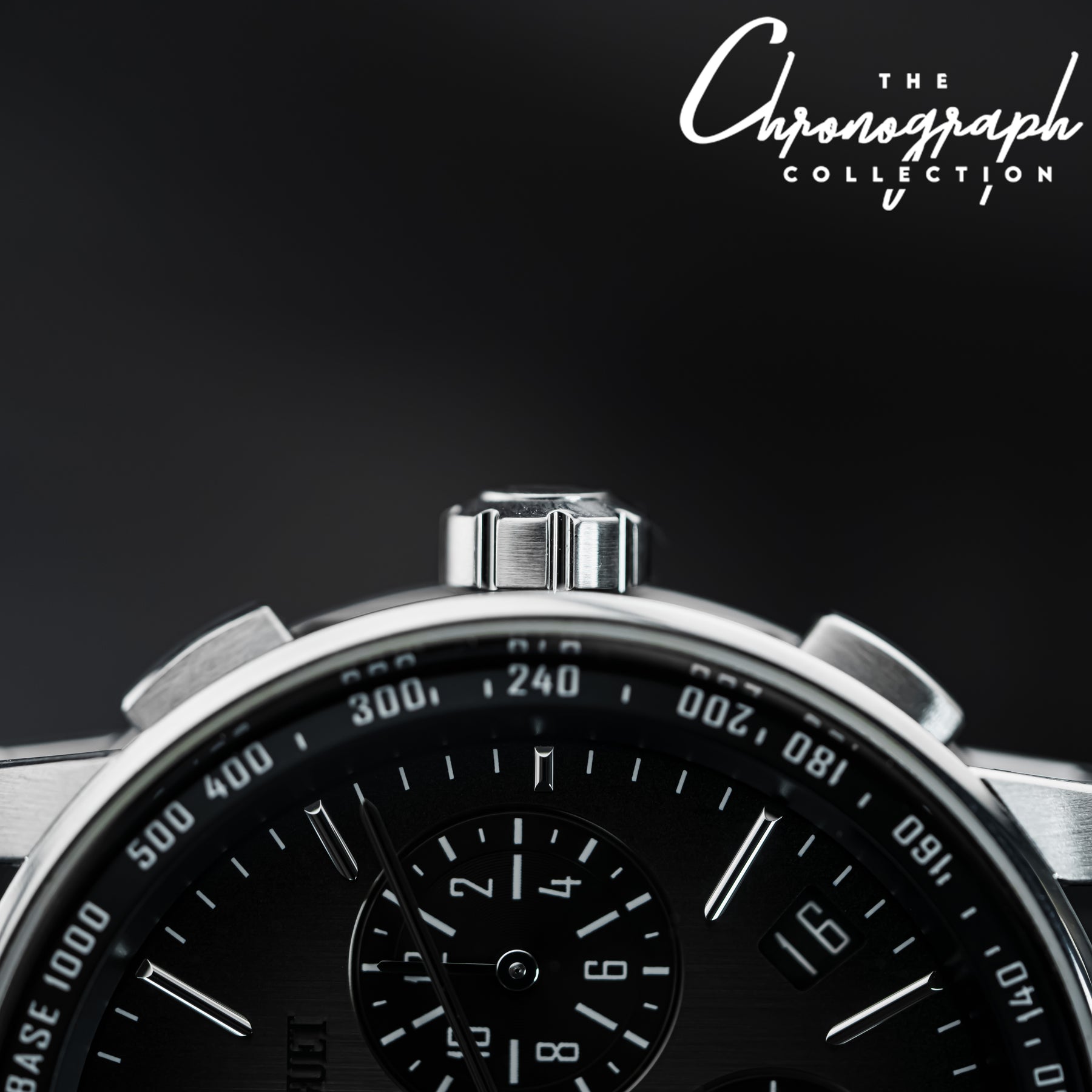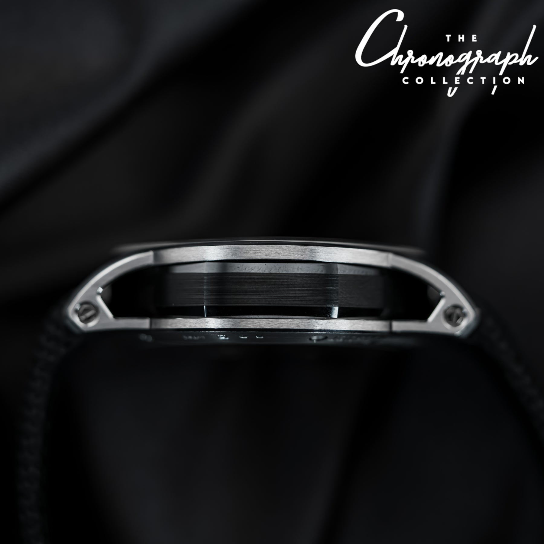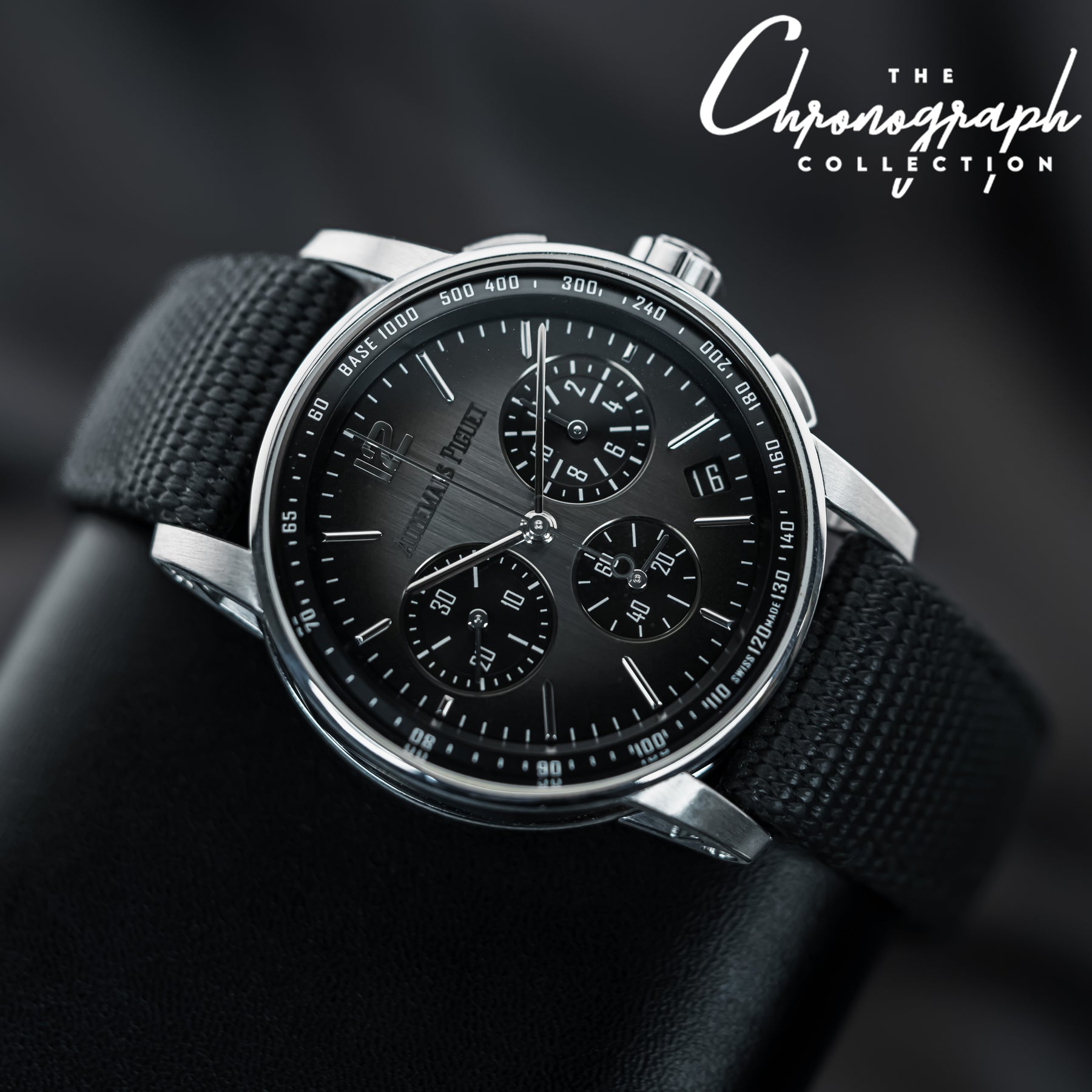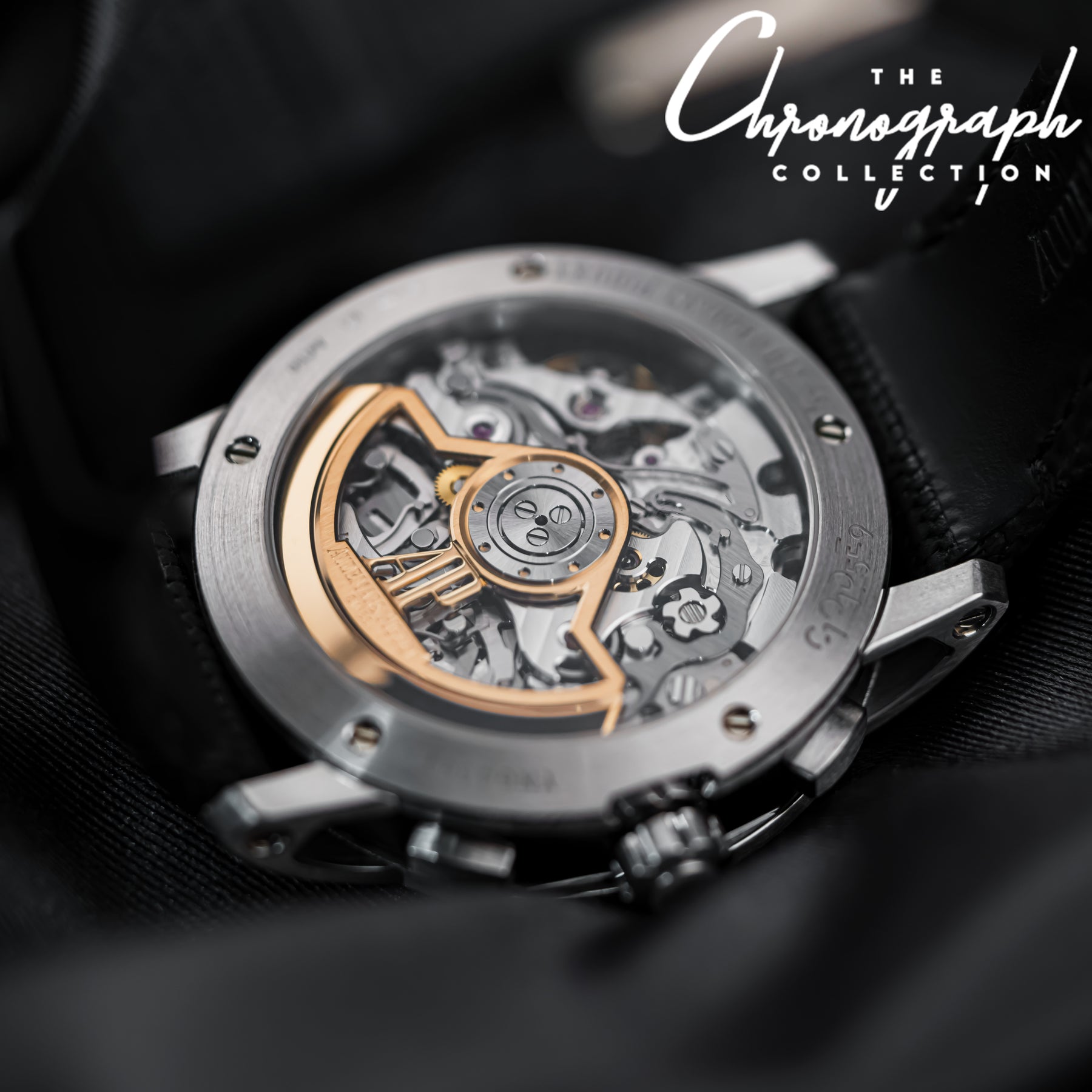 The Code 11.59 is one of Audemars Piguet's most abstract modern designs, combining timeless recognizability with experimental engineering. The case measures 41mm in diameter and is made from solid white gold, with hollow lugs and a very slightly domed sapphire crystal. The "smoke dial" has a stunning vertical brushed finish, with a small seconds subdial and two chronograph subdials, and a date window at 4:30. Powering the Code 11.59 is Audemars Piguet's in-house Caliber AP 4401 automatic movement (a column wheel flyback chronograph movement) with 70 hours of power reserve.