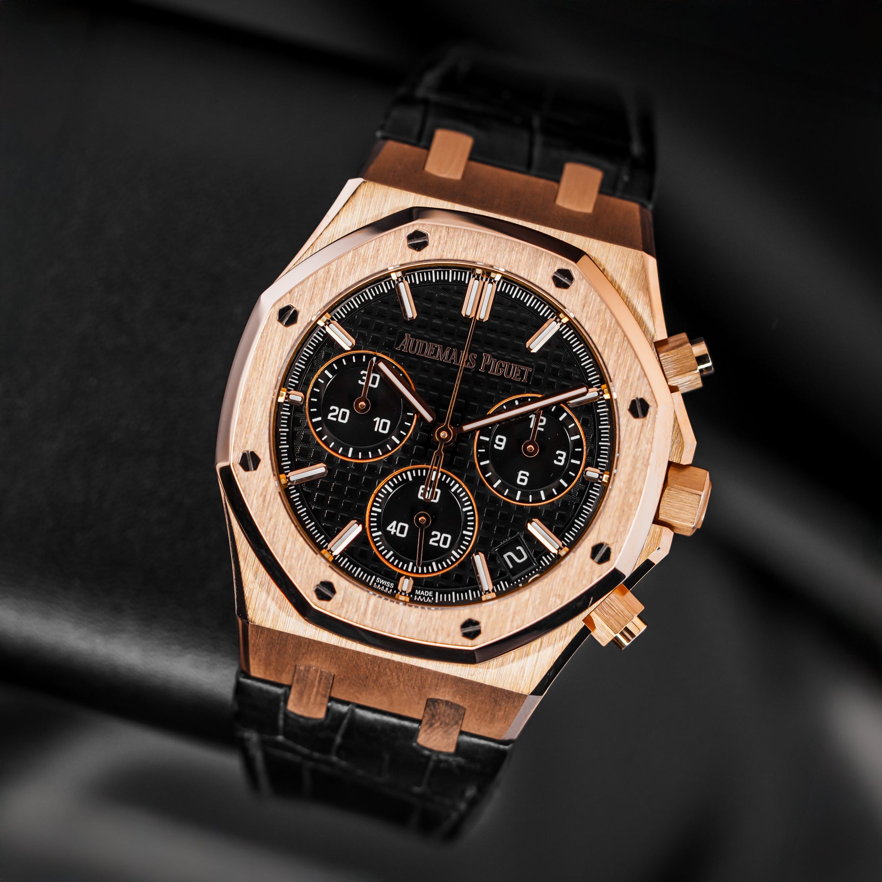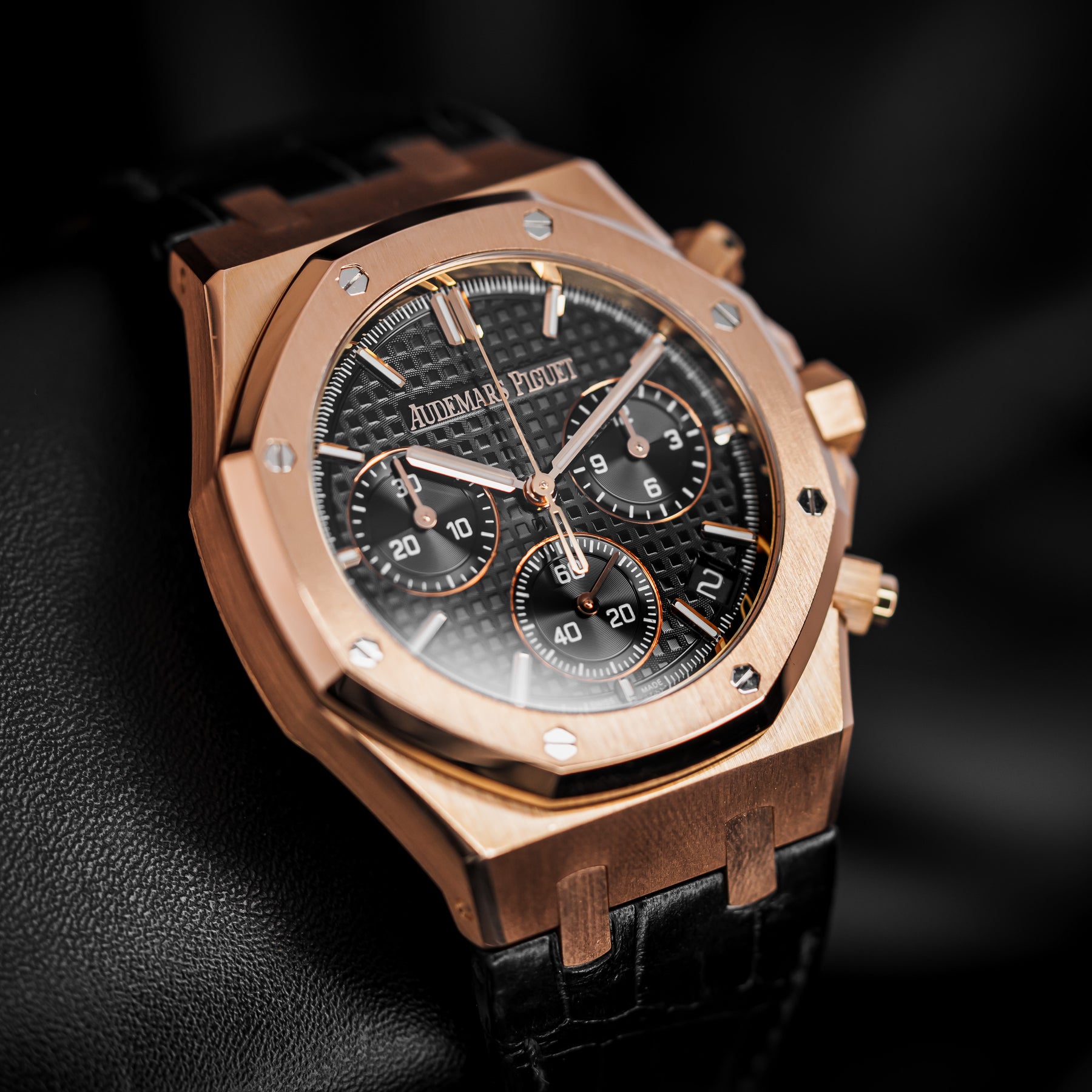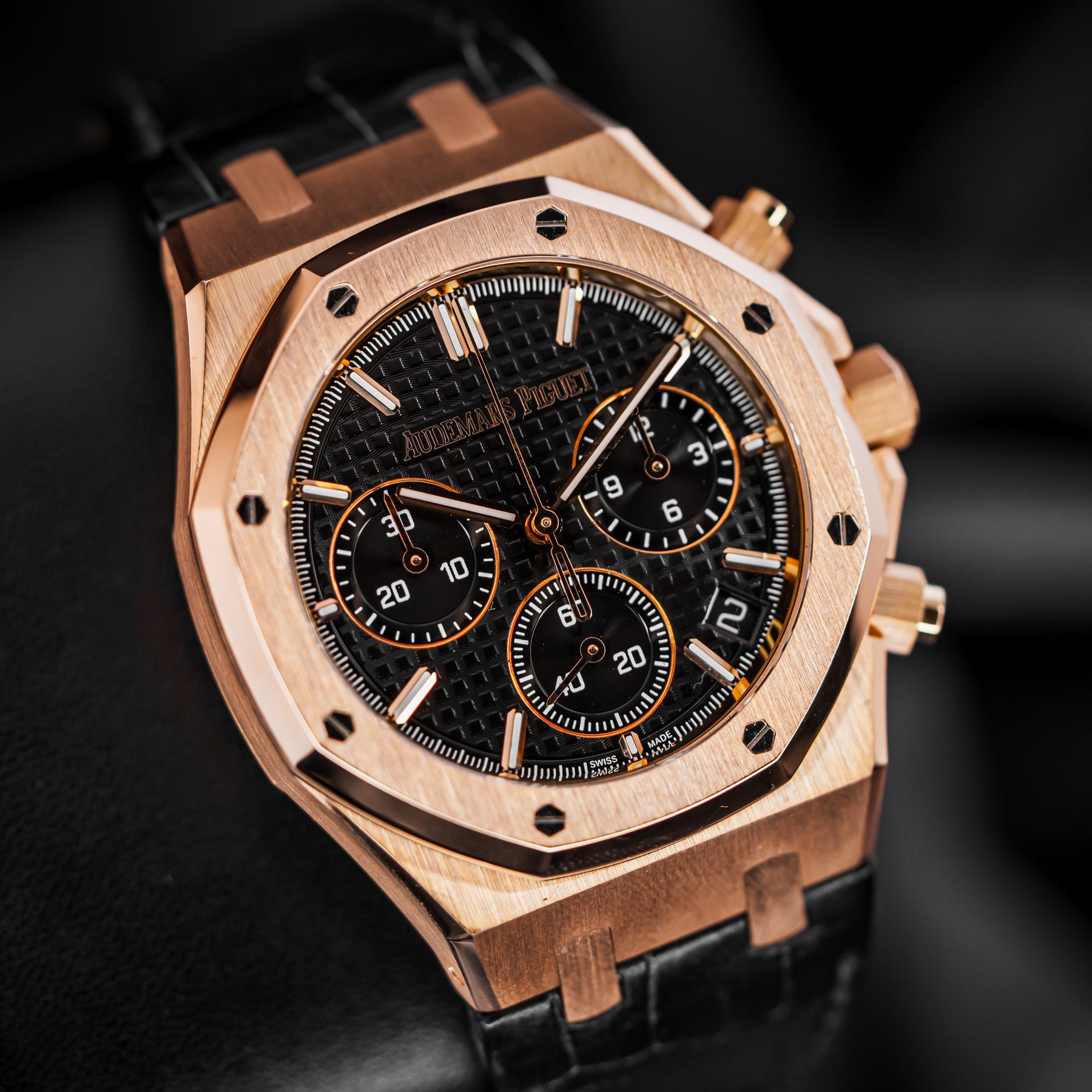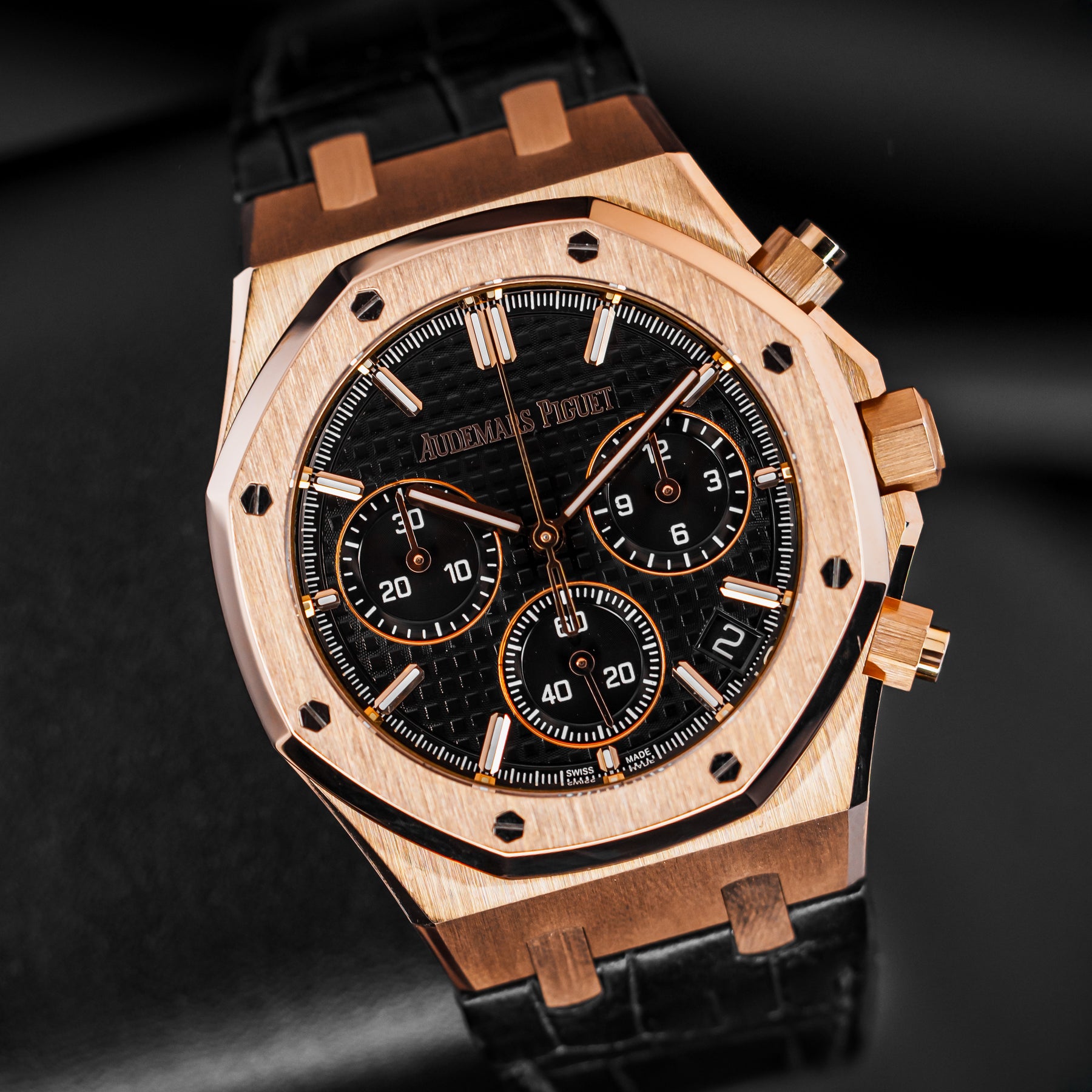 The 26240OR is a beautiful rendition of the Royal Oak Chronograph, one of Audemars Piguet's most iconic and popular models of all time. This watch in particular features a 41mm pink gold case paired with a stunning and timeless black crocodile leather strap with an updated deployment clasp design – more secure, more streamlined. The dial features the classic Tapisserie pattern, with an hour chronograph subdial at 3 o'clock, a small seconds subdial at 6 o'clock, a minute chronograph subdial at 9 o'clock, and a date window at 4:30. Powering the 26240OR is Audemars Piguet's in-house Caliber AP 4401 automatic column wheel flyback chronograph movement with 70 hours of power reserve.