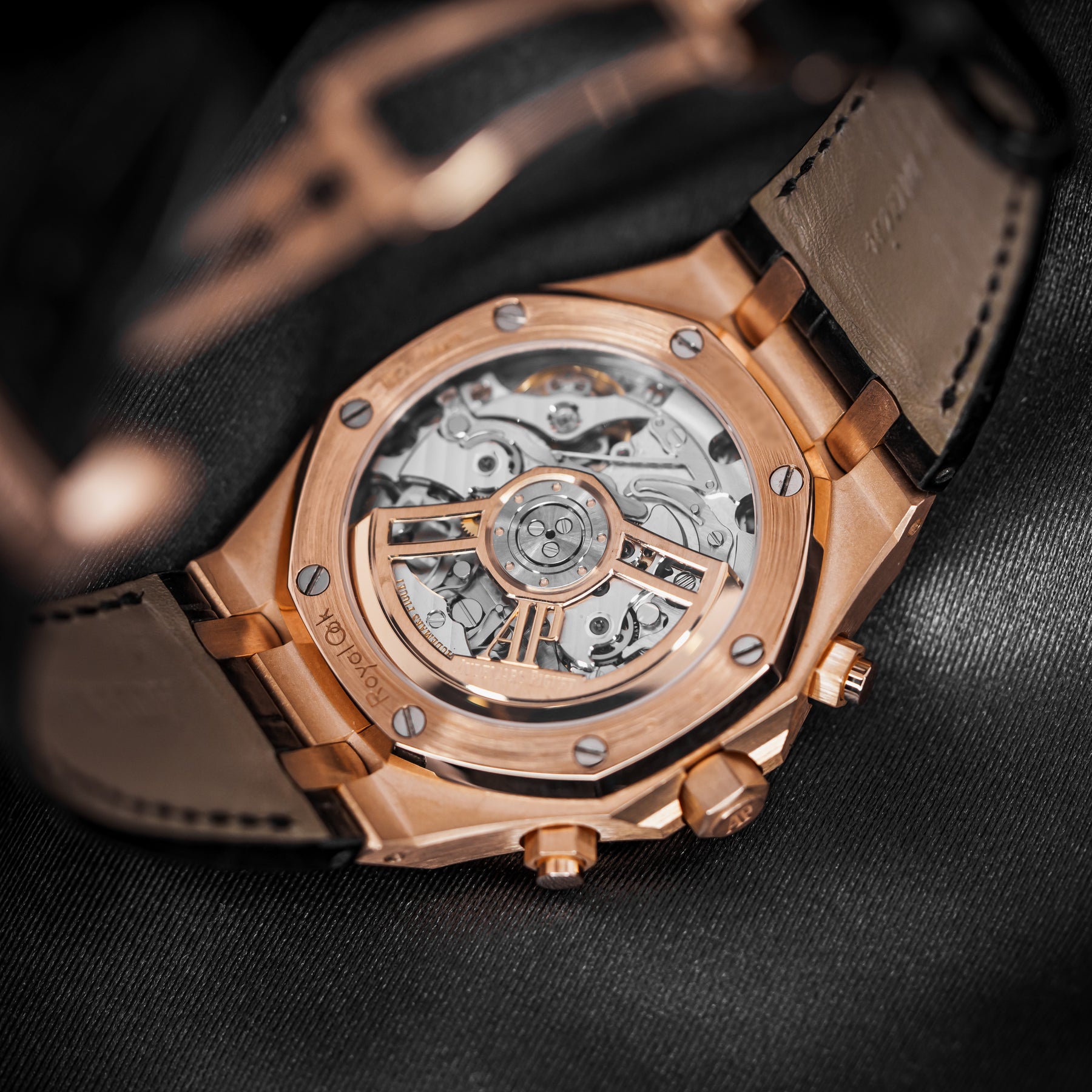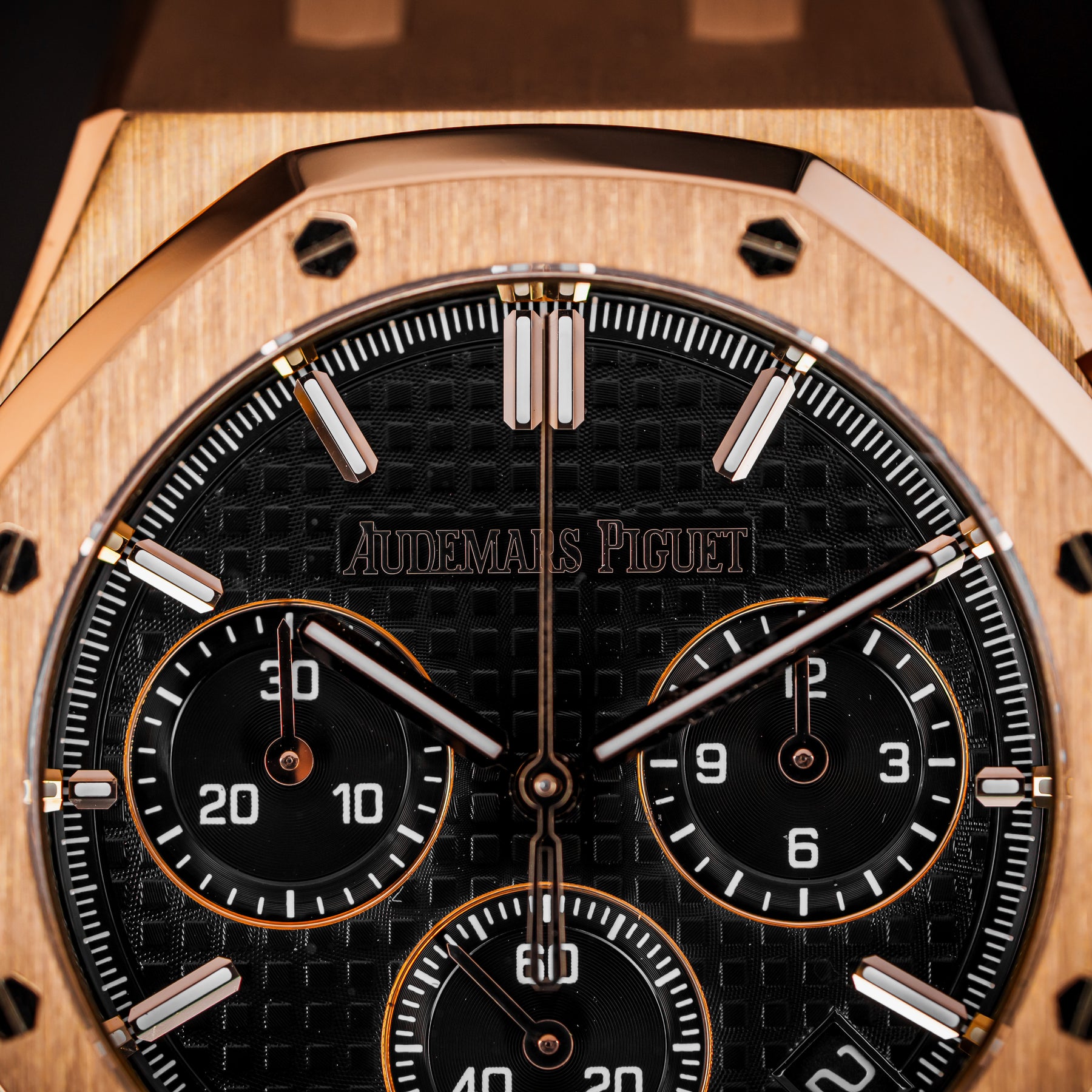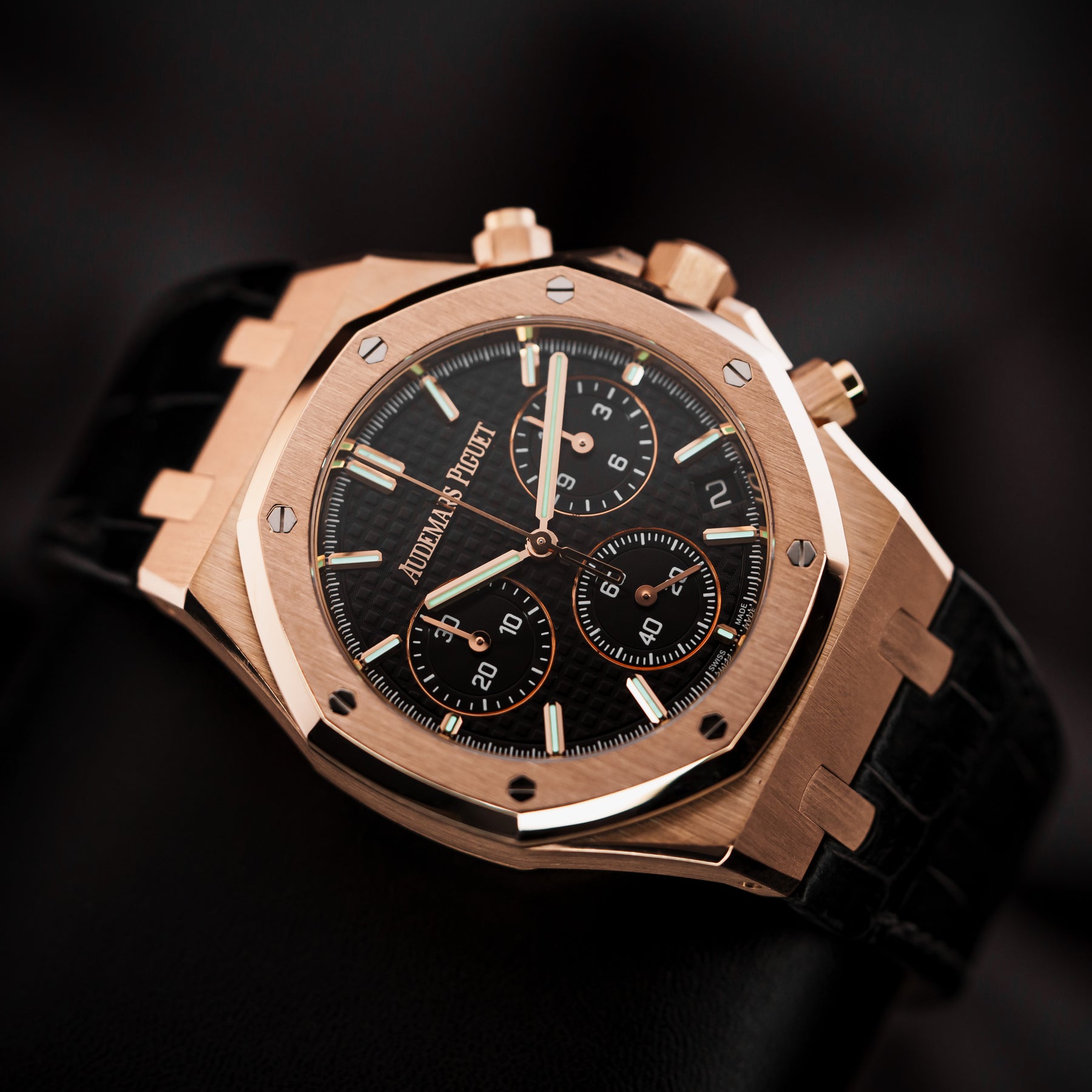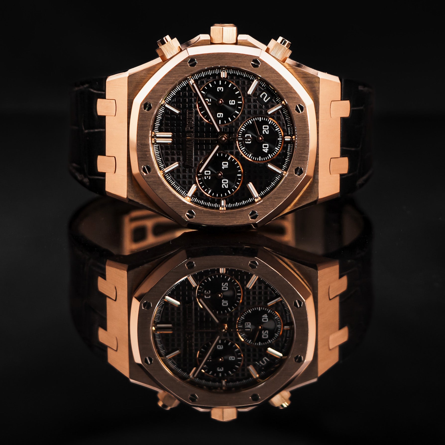 The 26240OR is a beautiful rendition of the Royal Oak Chronograph, one of Audemars Piguet's most iconic and popular models of all time. This watch in particular features a 41mm pink gold case paired with a stunning and timeless black crocodile leather strap with an updated deployment clasp design – more secure, more streamlined. The dial features the classic Tapisserie pattern, with an hour chronograph subdial at 3 o'clock, a small seconds subdial at 6 o'clock, a minute chronograph subdial at 9 o'clock, and a date window at 4:30. Powering the 26240OR is Audemars Piguet's in-house Caliber AP 4401 automatic column wheel flyback chronograph movement with 70 hours of power reserve.