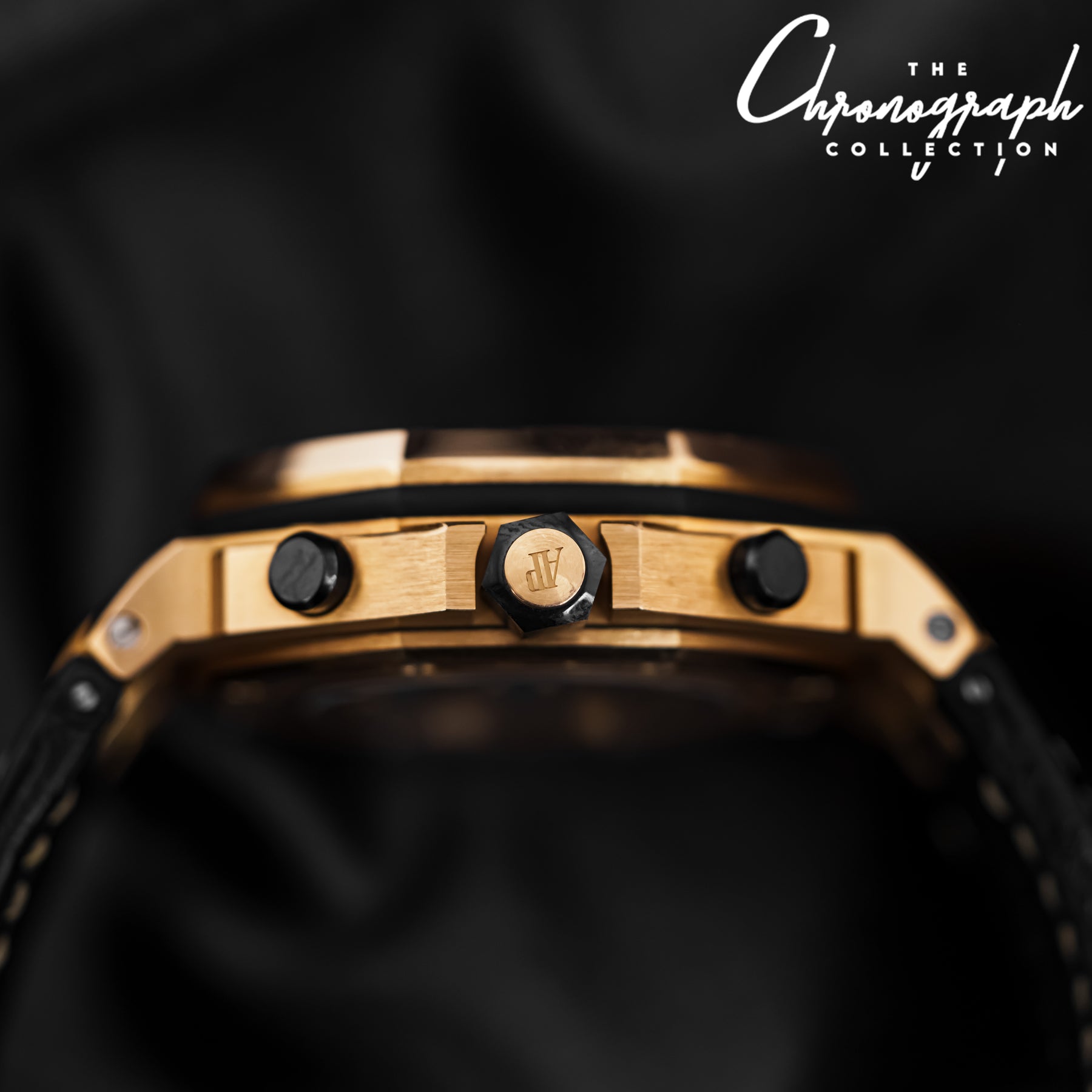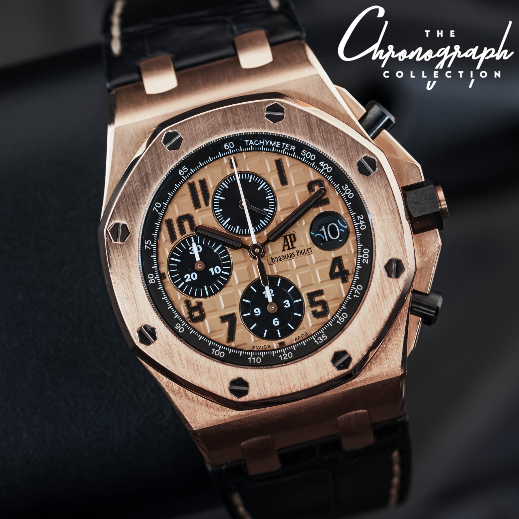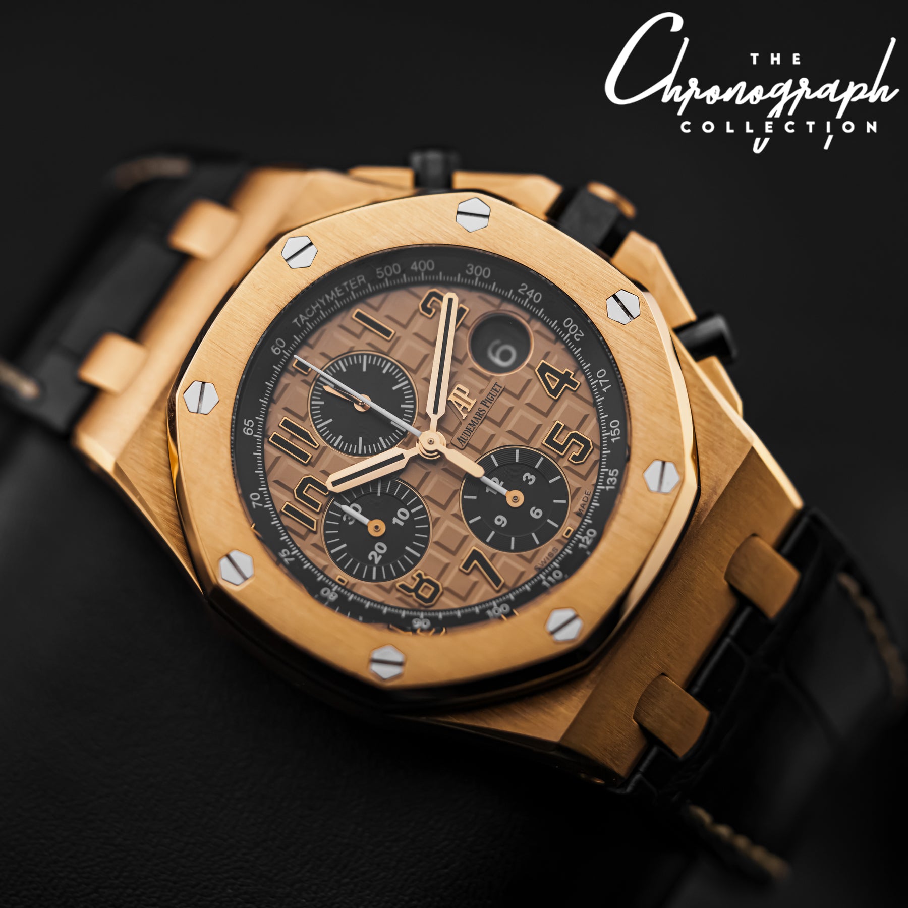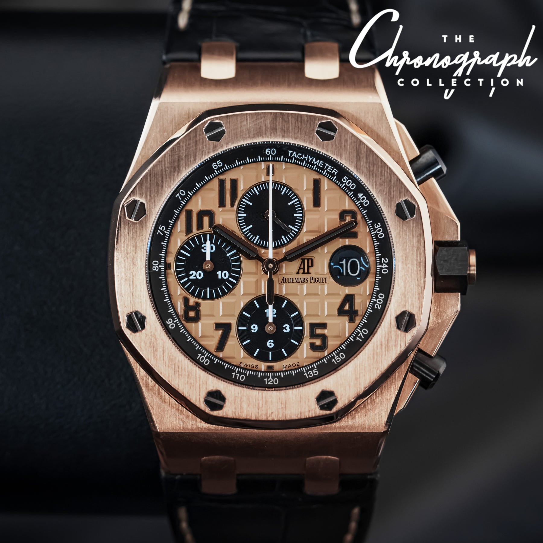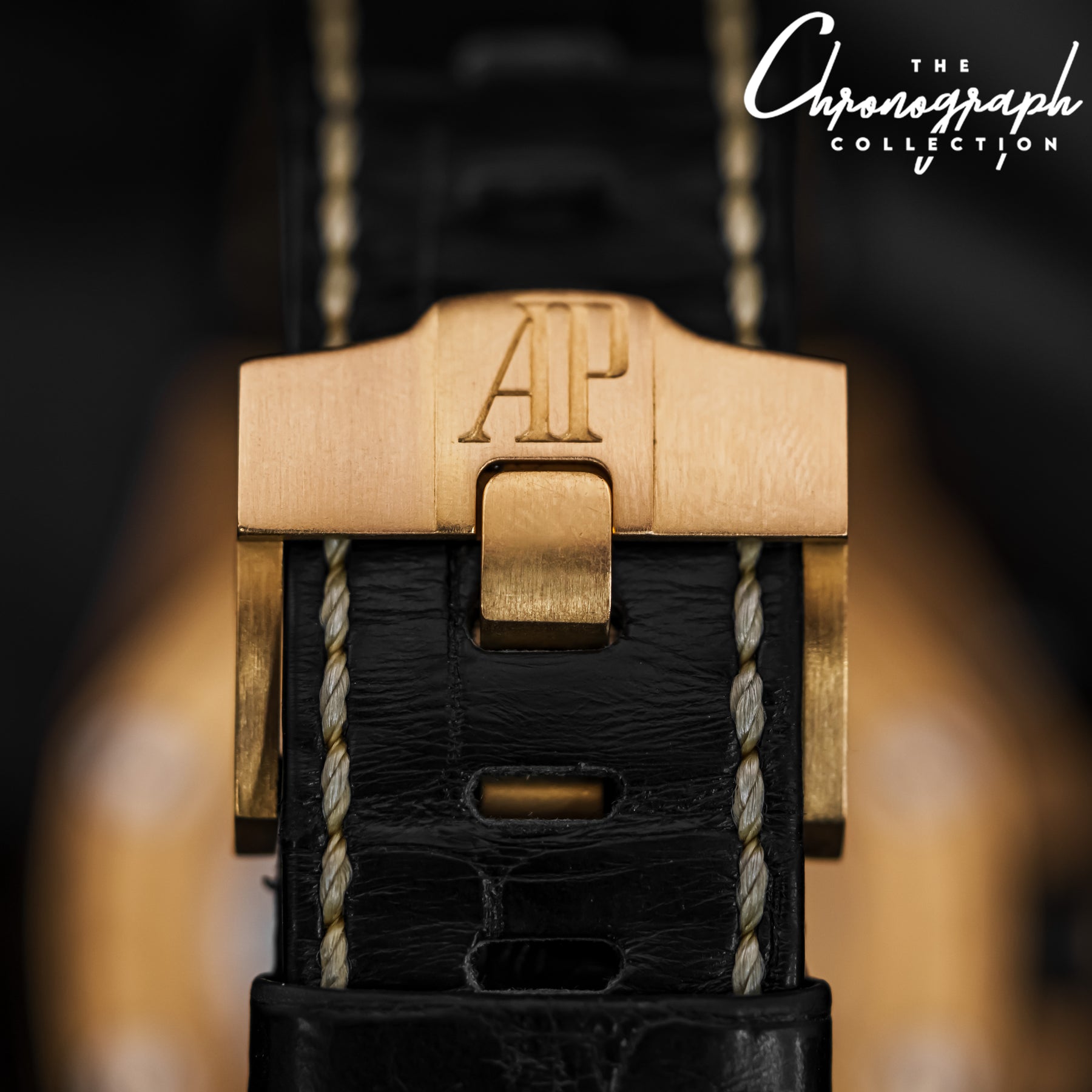The Audemars Piguet Royal Oak Offshore 26470OR "Halfbrick" is one of the most luxurious offerings from the Offshore lineup. This watch features a solid pink gold case and bezel, with a matching champagne dial and set of subdials. Despite being made entirely from precious metal, the Halfbrick is just as capable as any of its sister models, boasting 100 meters of water resistance. The watch also features a classic black crocodile strap, but can be switched to a silicone strap at any time for use in the water. The 42mm case houses the in-house Caliber 3126/3840 automatic movement with 50 hours of power reserve. The watch received a $3,000 service in August of this year.