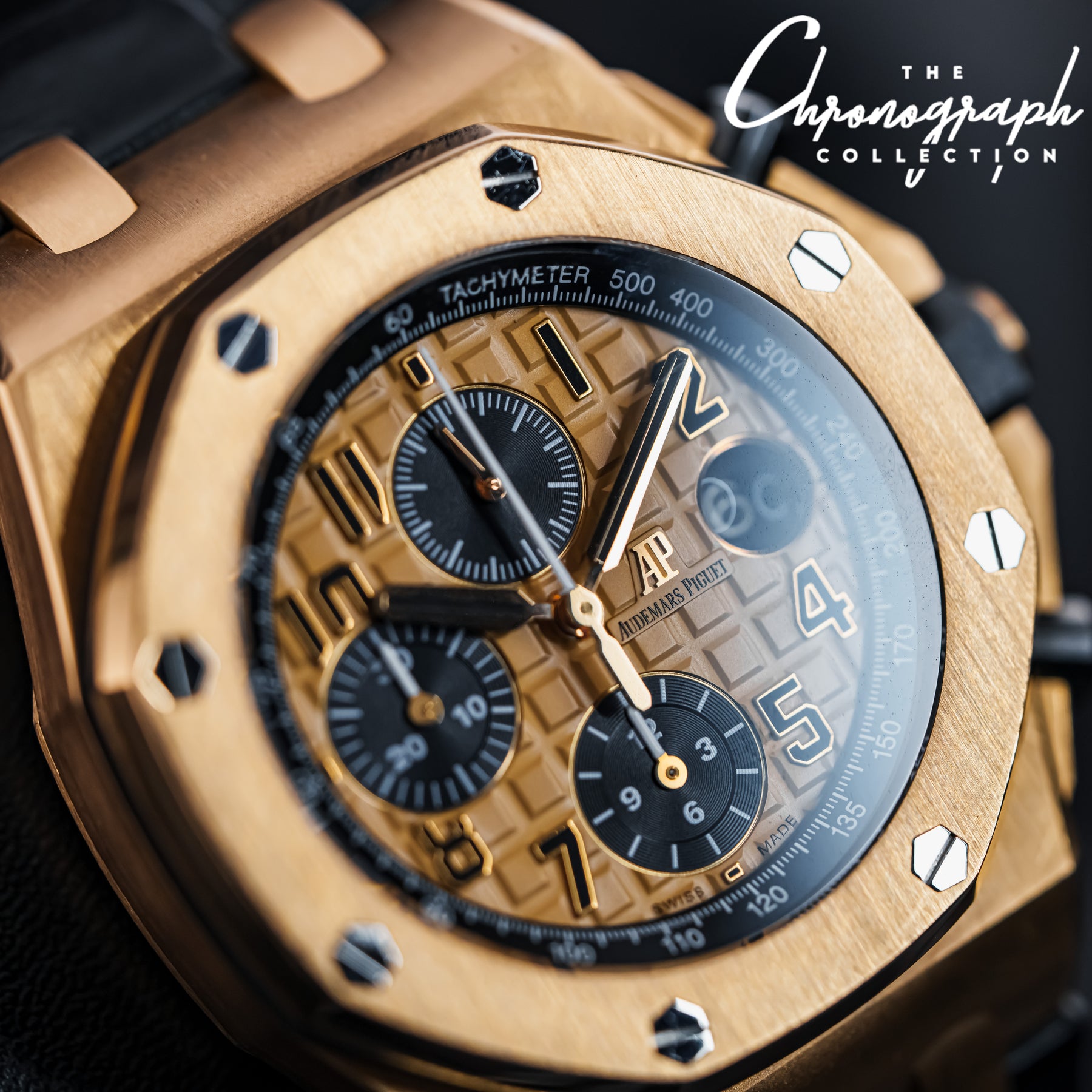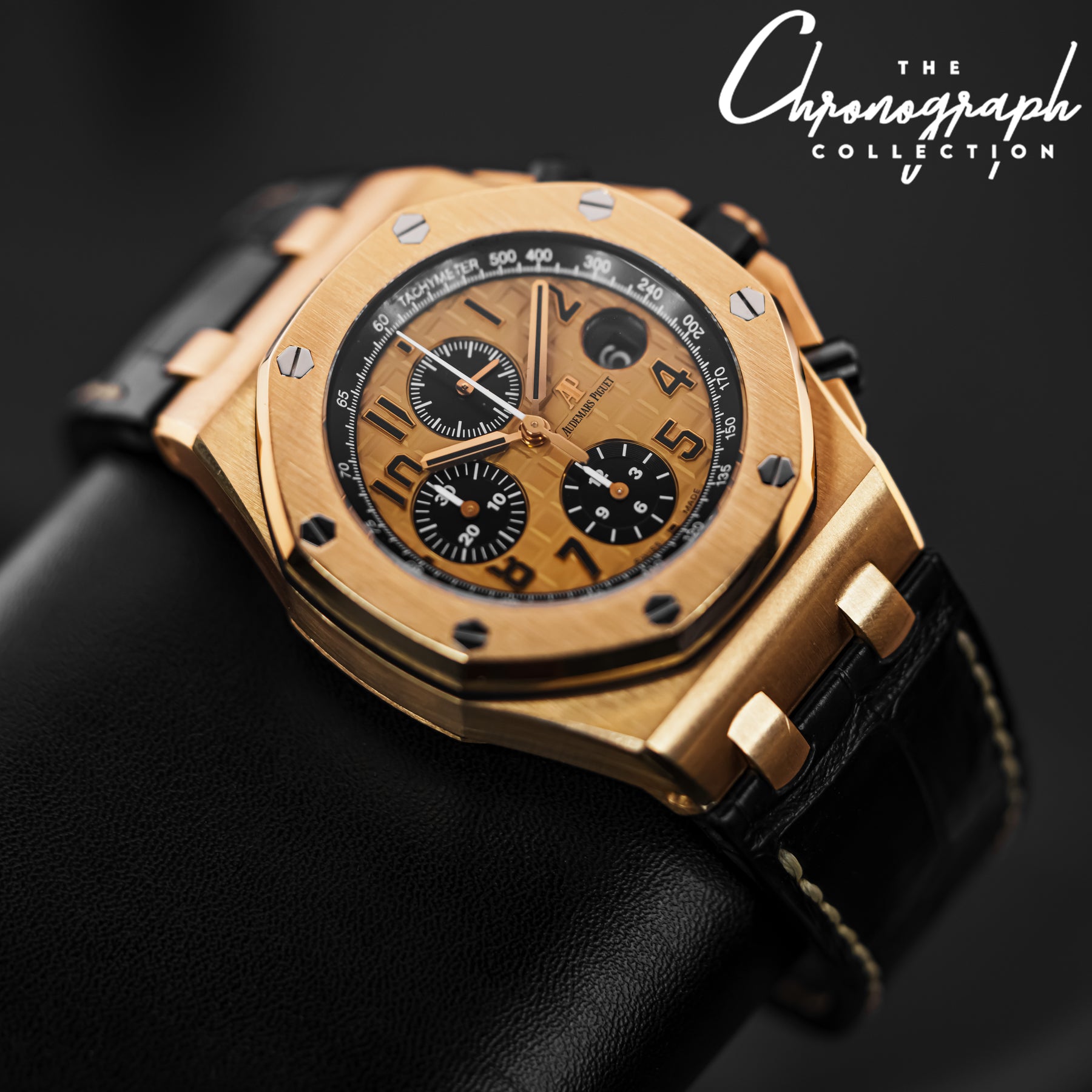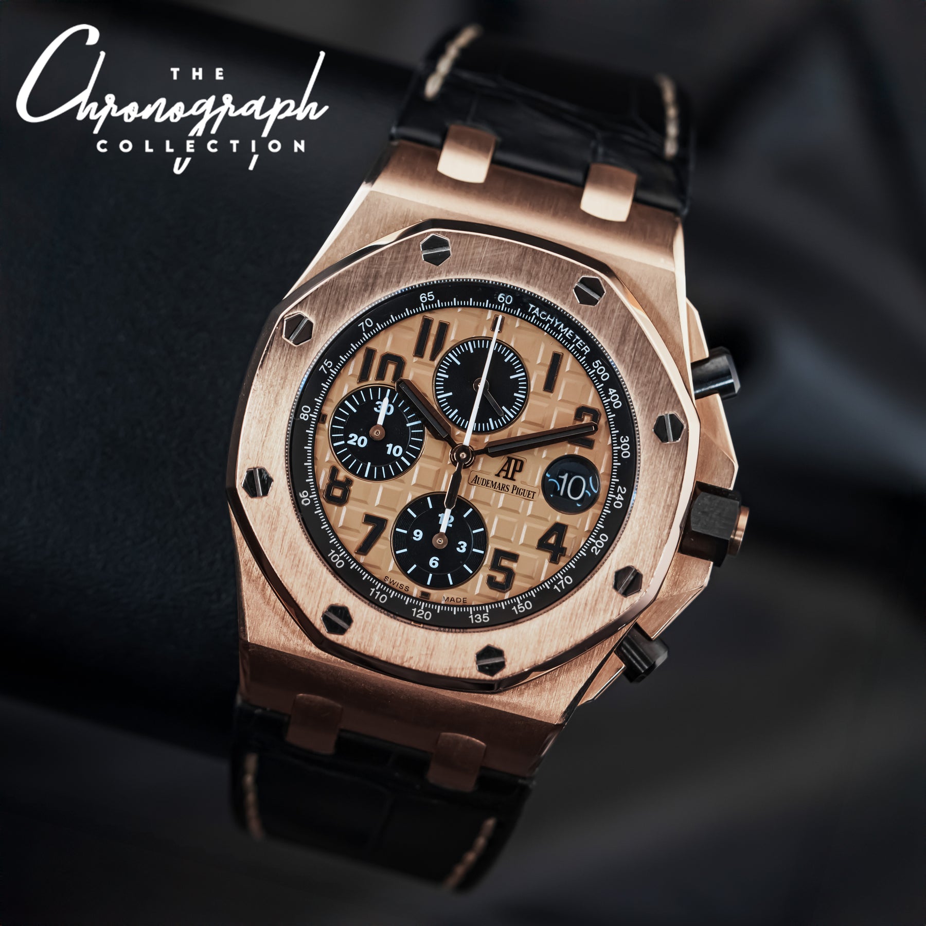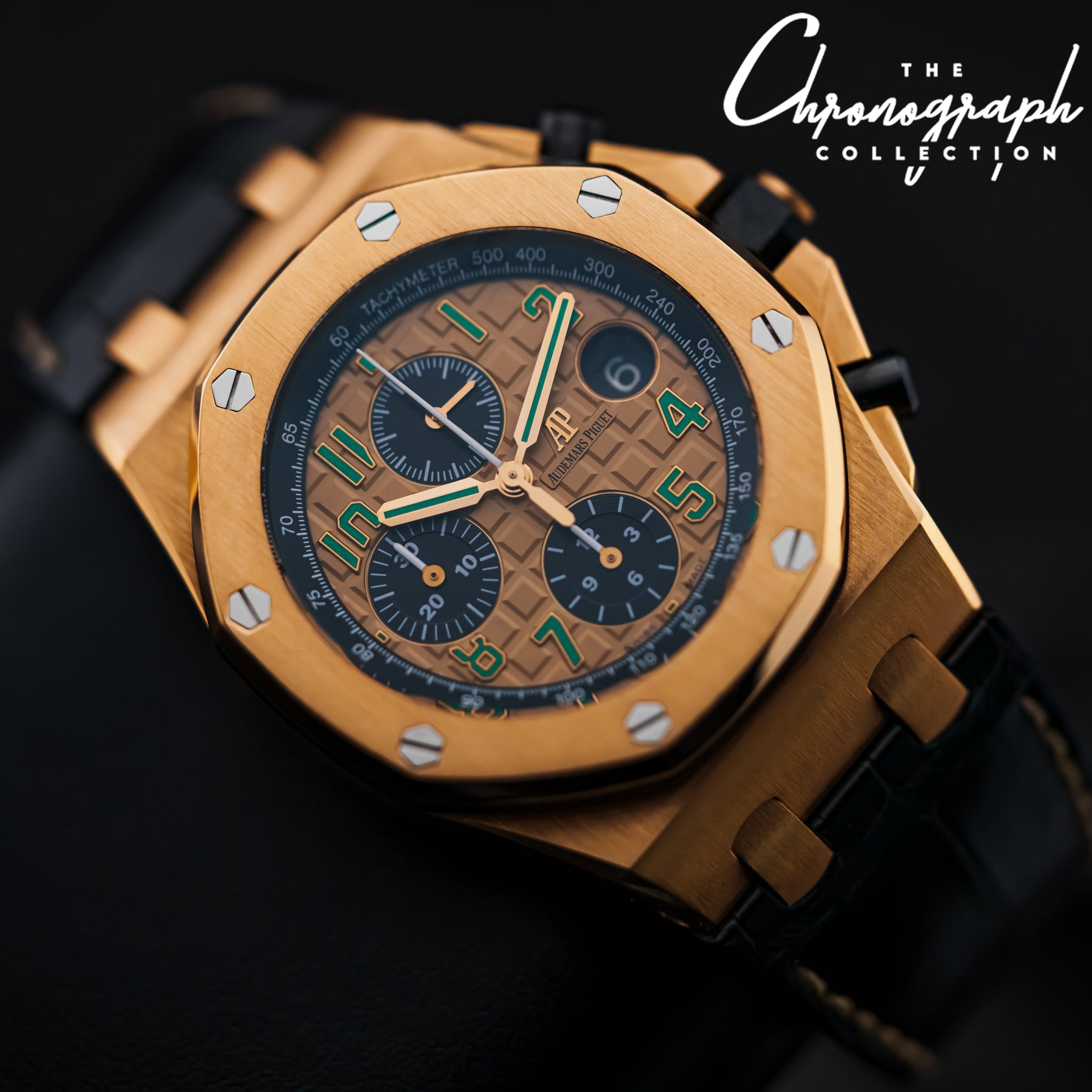 The Audemars Piguet Royal Oak Offshore 26470OR "Halfbrick" is one of the most luxurious offerings from the Offshore lineup. This watch features a solid pink gold case and bezel, with a matching champagne dial and set of subdials. Despite being made entirely from precious metal, the Halfbrick is just as capable as any of its sister models, boasting 100 meters of water resistance. The watch also features a classic black crocodile strap, but can be switched to a silicone strap at any time for use in the water. The 42mm case houses the in-house Caliber 3126/3840 automatic movement with 50 hours of power reserve. The watch received a $3,000 service in August of this year.
