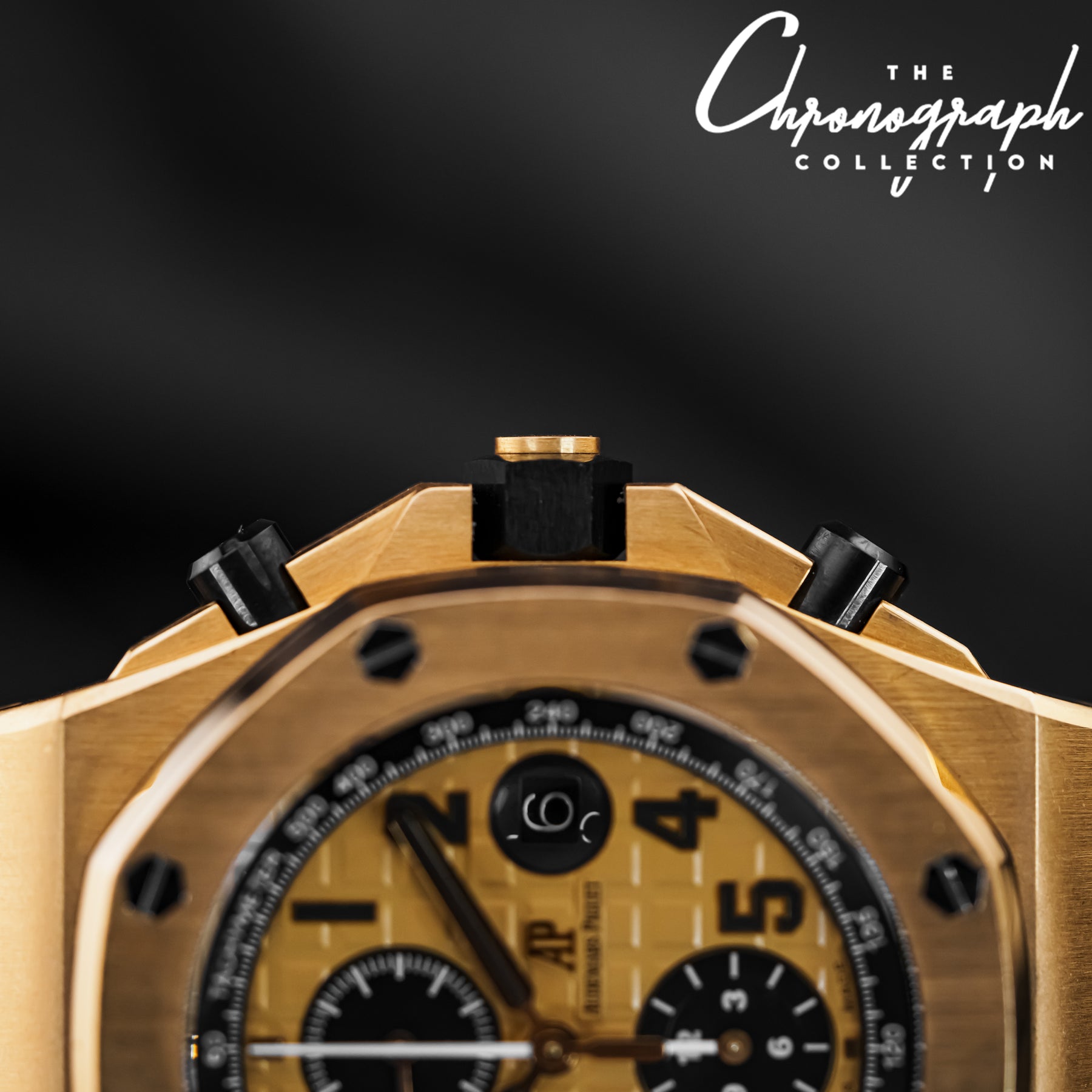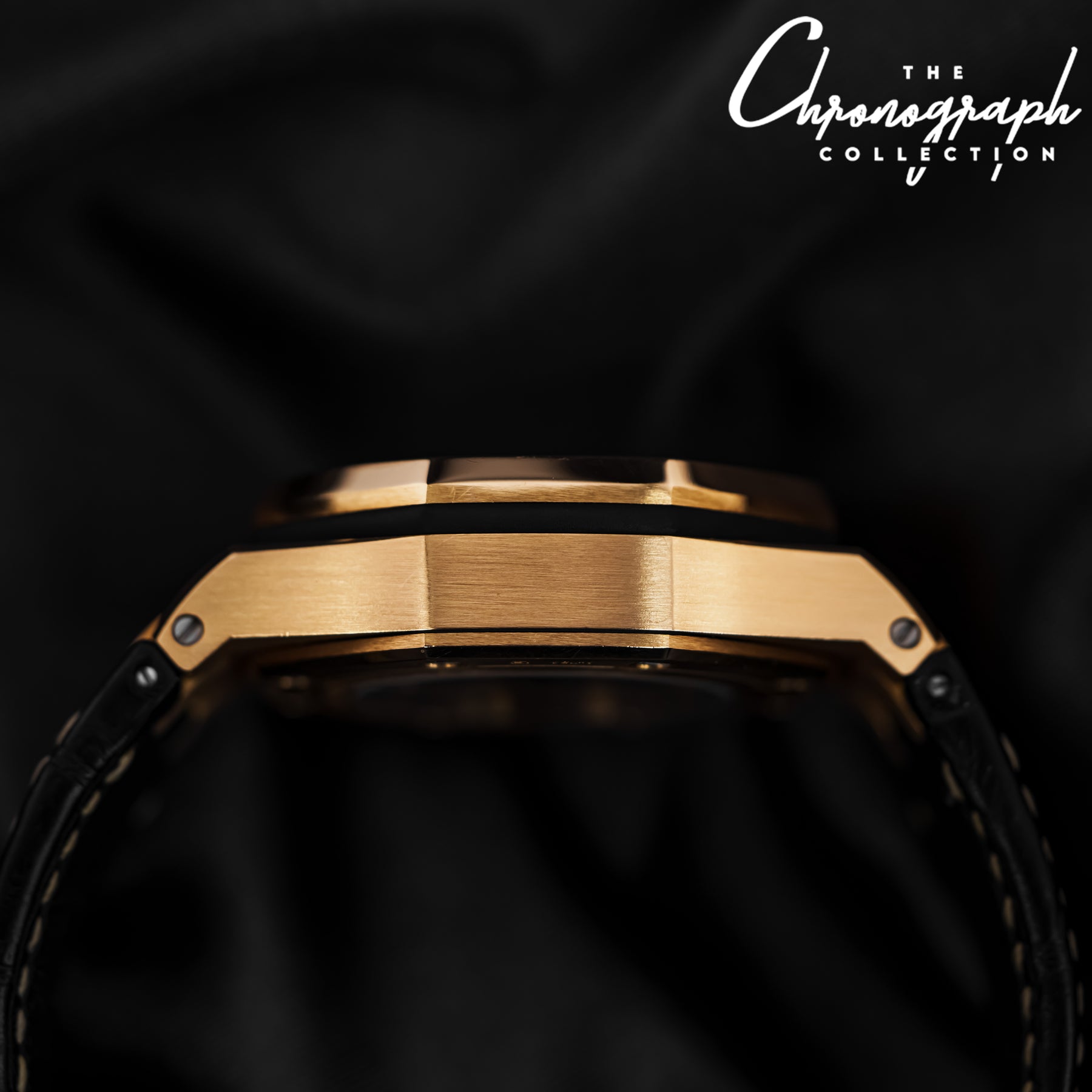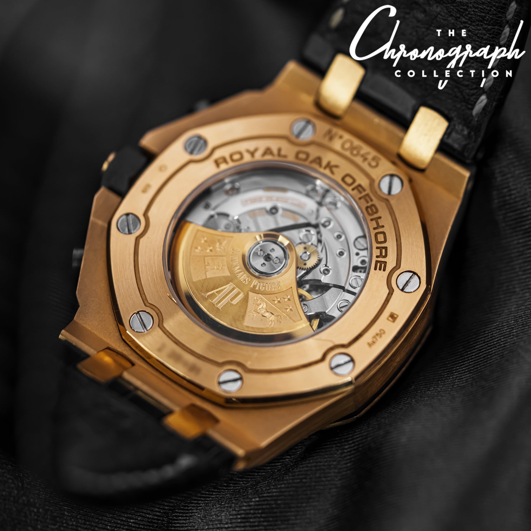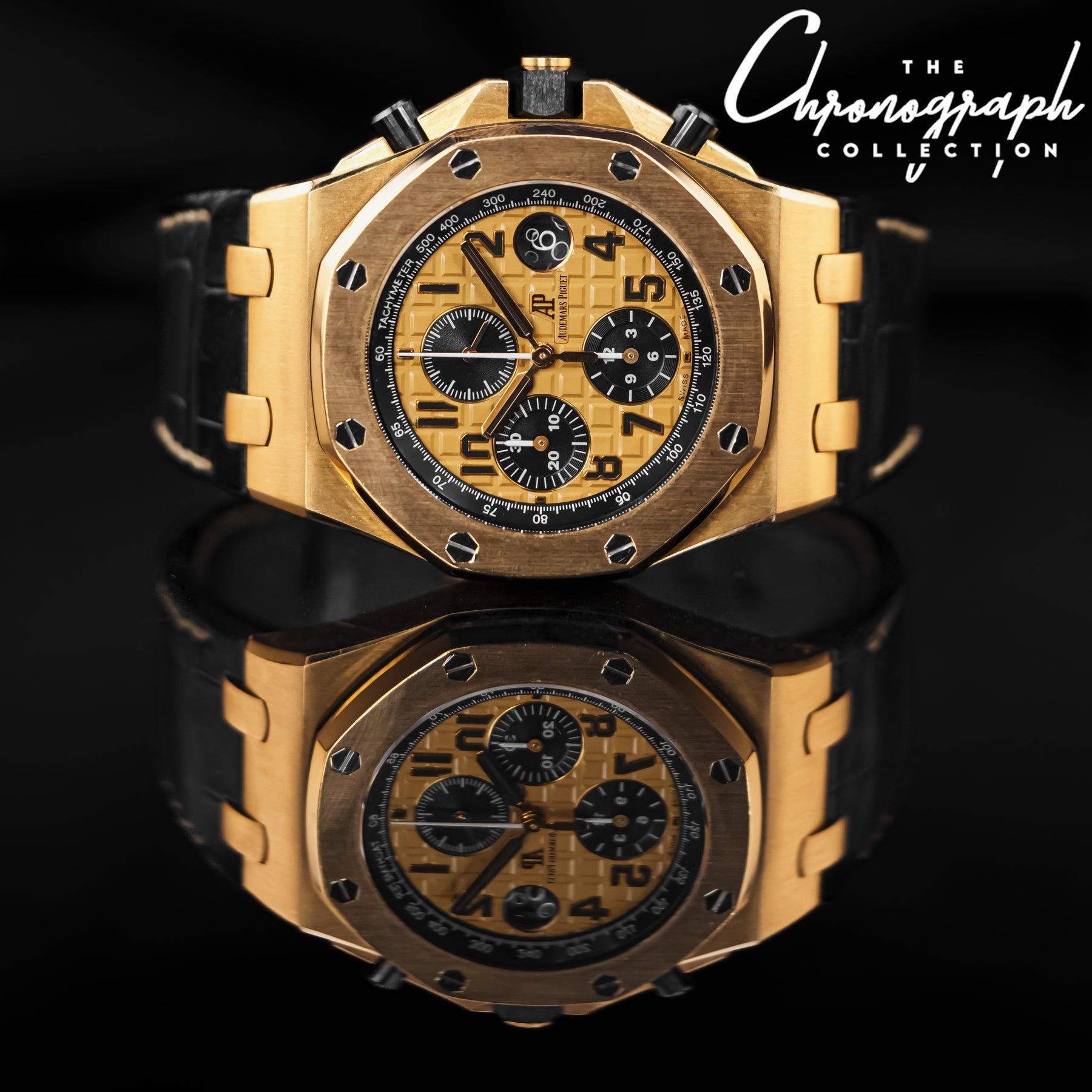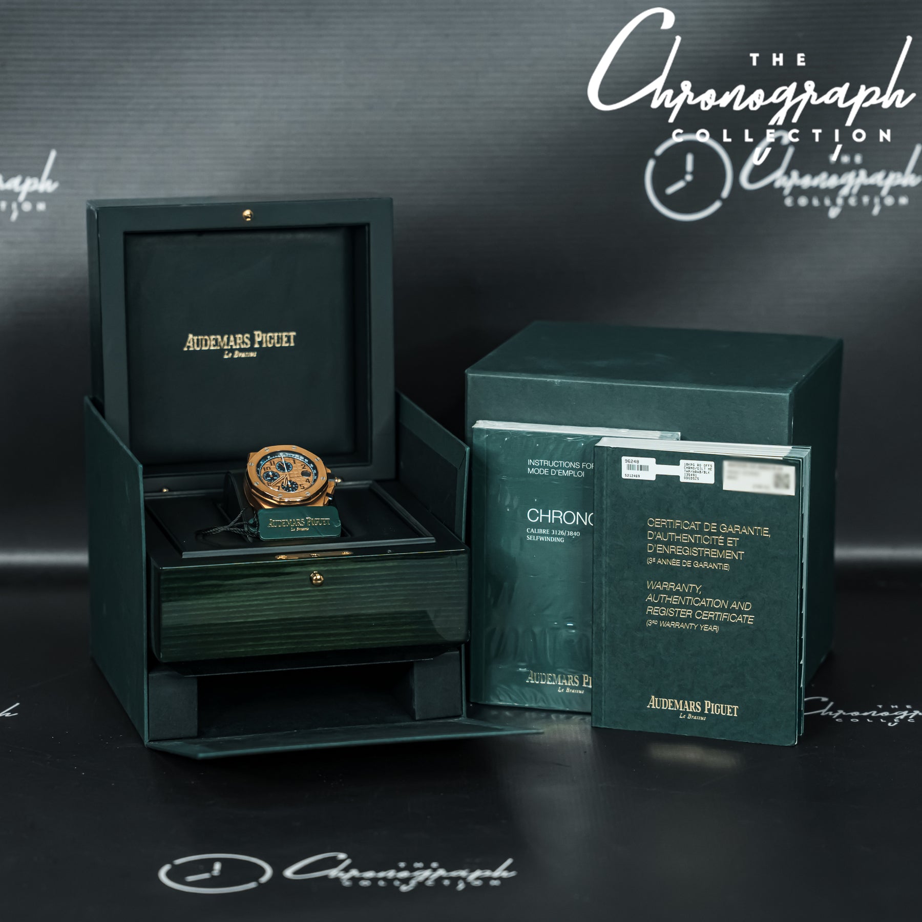 The Audemars Piguet Royal Oak Offshore 26470OR "Halfbrick" is one of the most luxurious offerings from the Offshore lineup. This watch features a solid pink gold case and bezel, with a matching champagne dial and set of subdials. Despite being made entirely from precious metal, the Halfbrick is just as capable as any of its sister models, boasting 100 meters of water resistance. The watch also features a classic black crocodile strap, but can be switched to a silicone strap at any time for use in the water. The 42mm case houses the in-house Caliber 3126/3840 automatic movement with 50 hours of power reserve. The watch received a $3,000 service in August of this year.