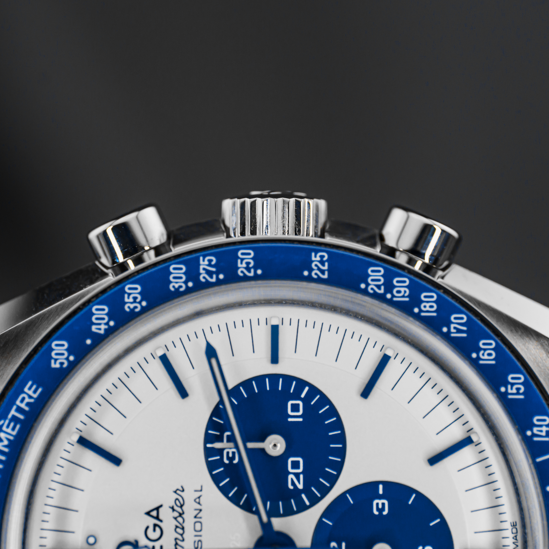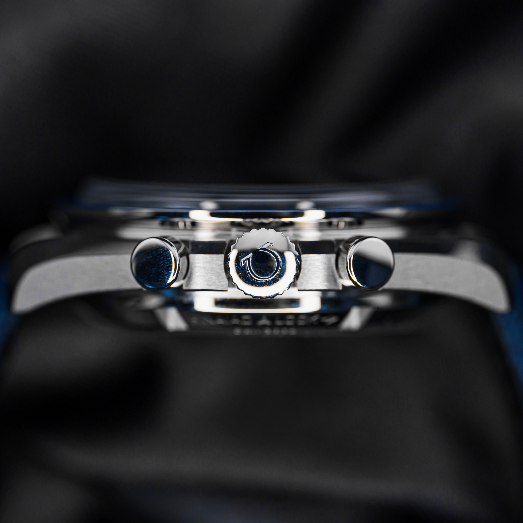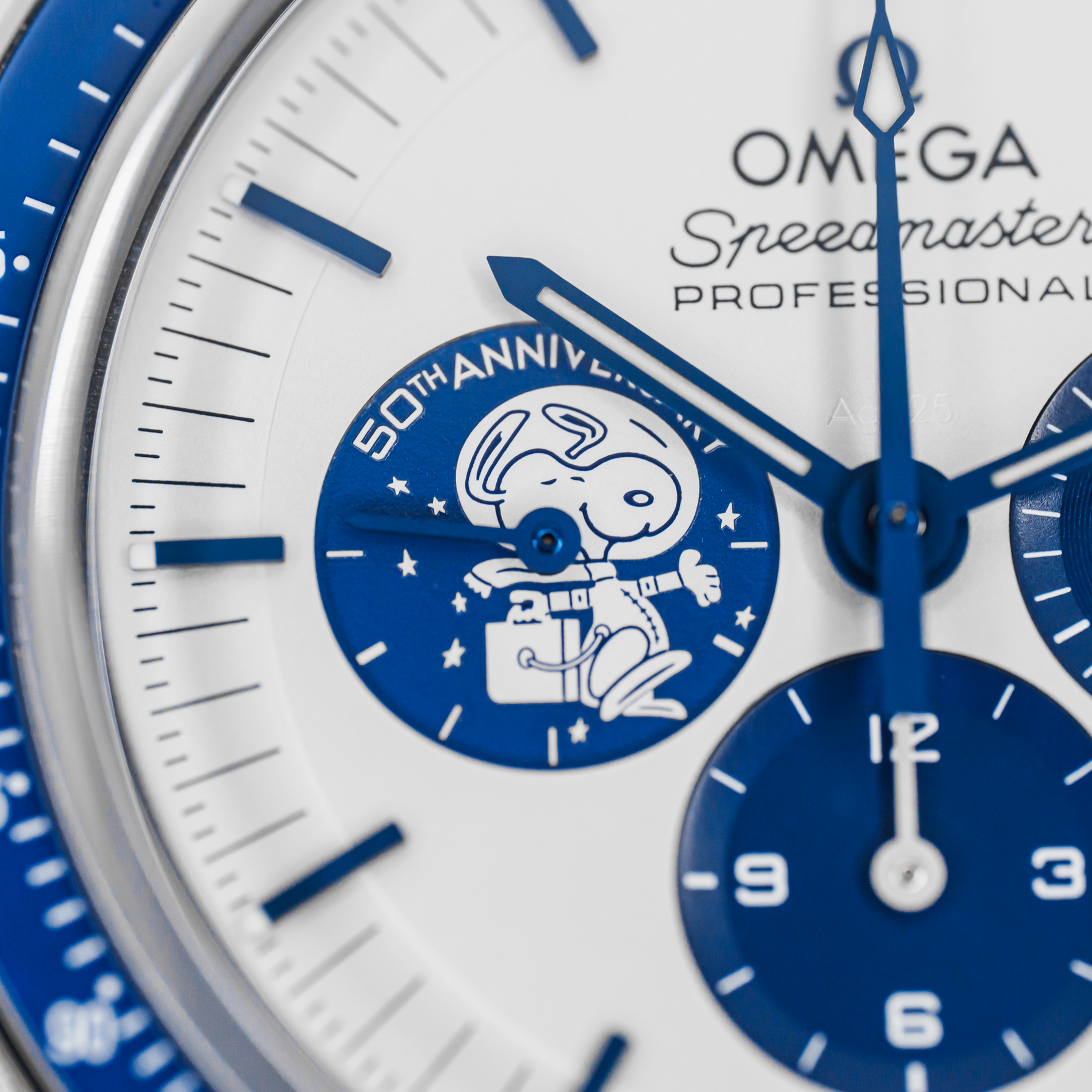 The Omega Speedmaster Silver Snoopy is a stunning 50th Anniversary tribute to the Apollo 13 mission in 1970. As one of the most desirable Omegas to date, the Snoopy features a stainless steel case with a ceramic bezel insert and a white dial with contrasting blue indices and matching subdials. Both the 9 o'clock subdial and sapphire caseback feature images of Snoopy as a tribute to the Silver Snoopy Award. This model comes on Omega's high quality fabric strap, making it durable and comfortable. Powering the Snoopy is Omega's in-house Caliber 3861 mechanical movement with 50 hours of power reserve.