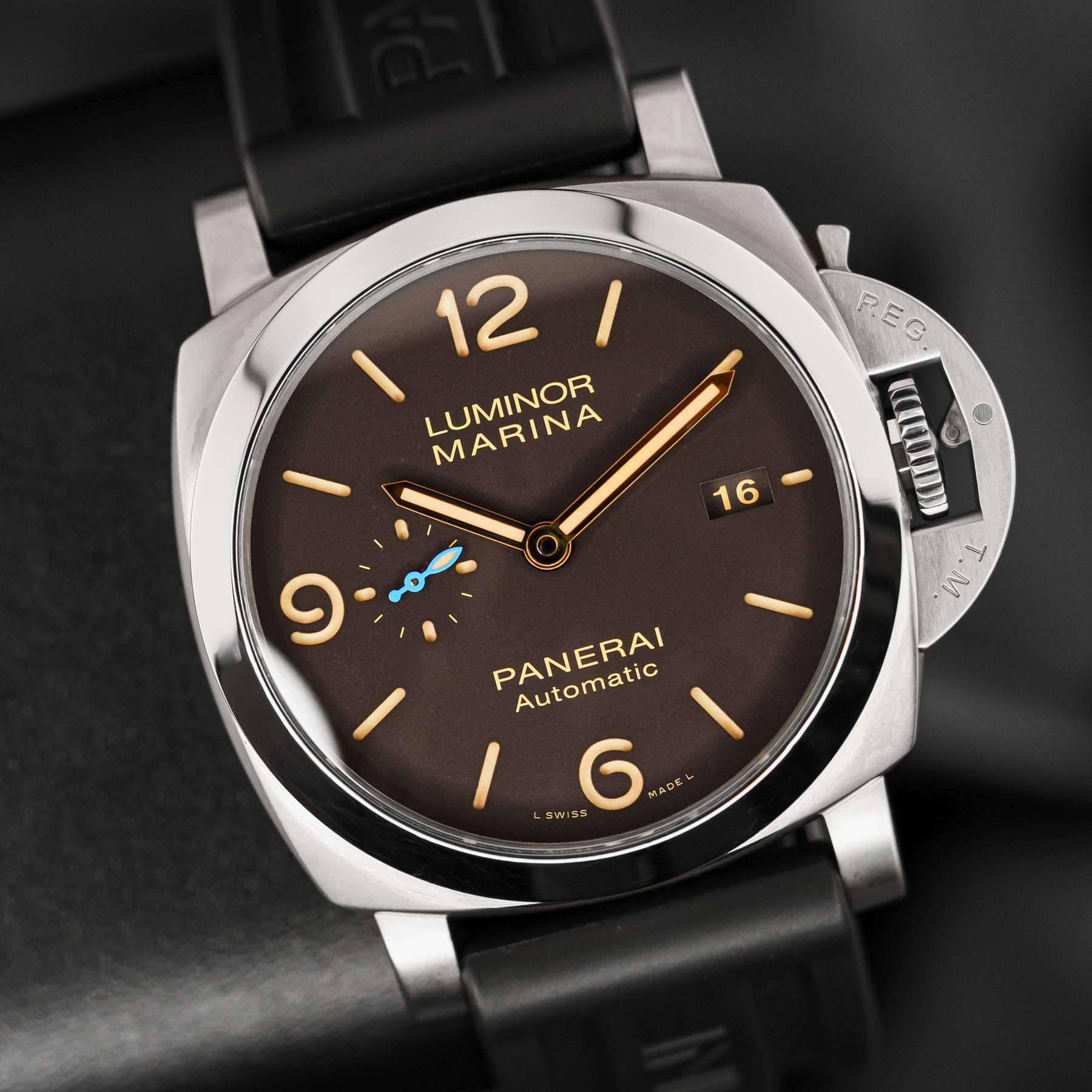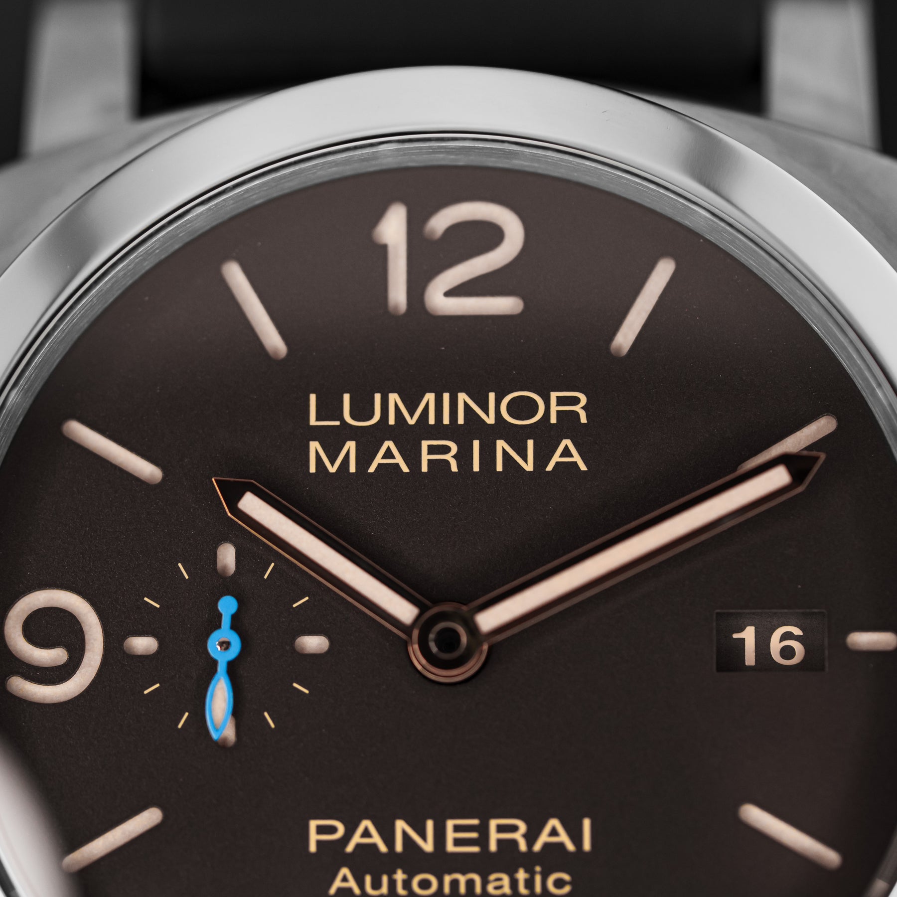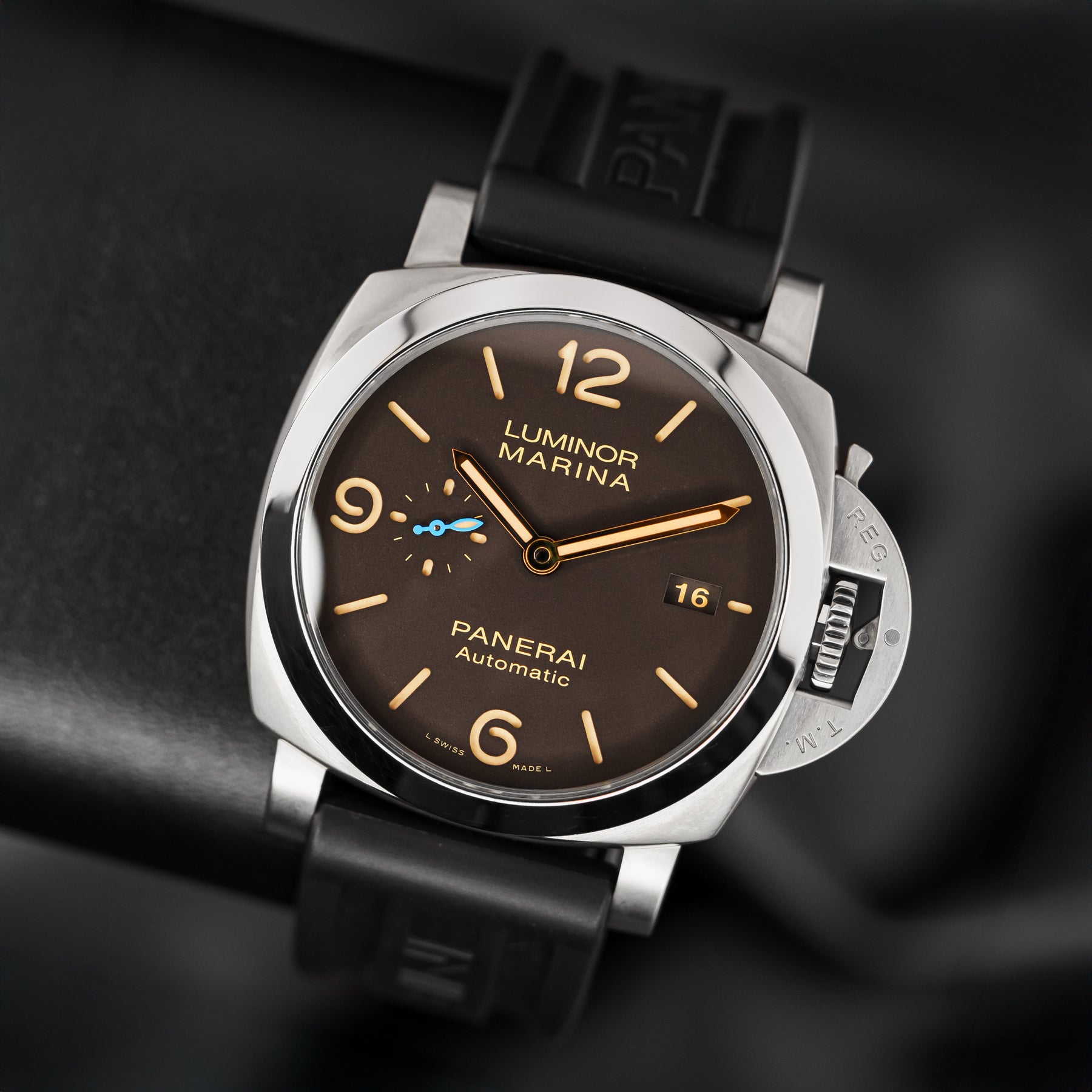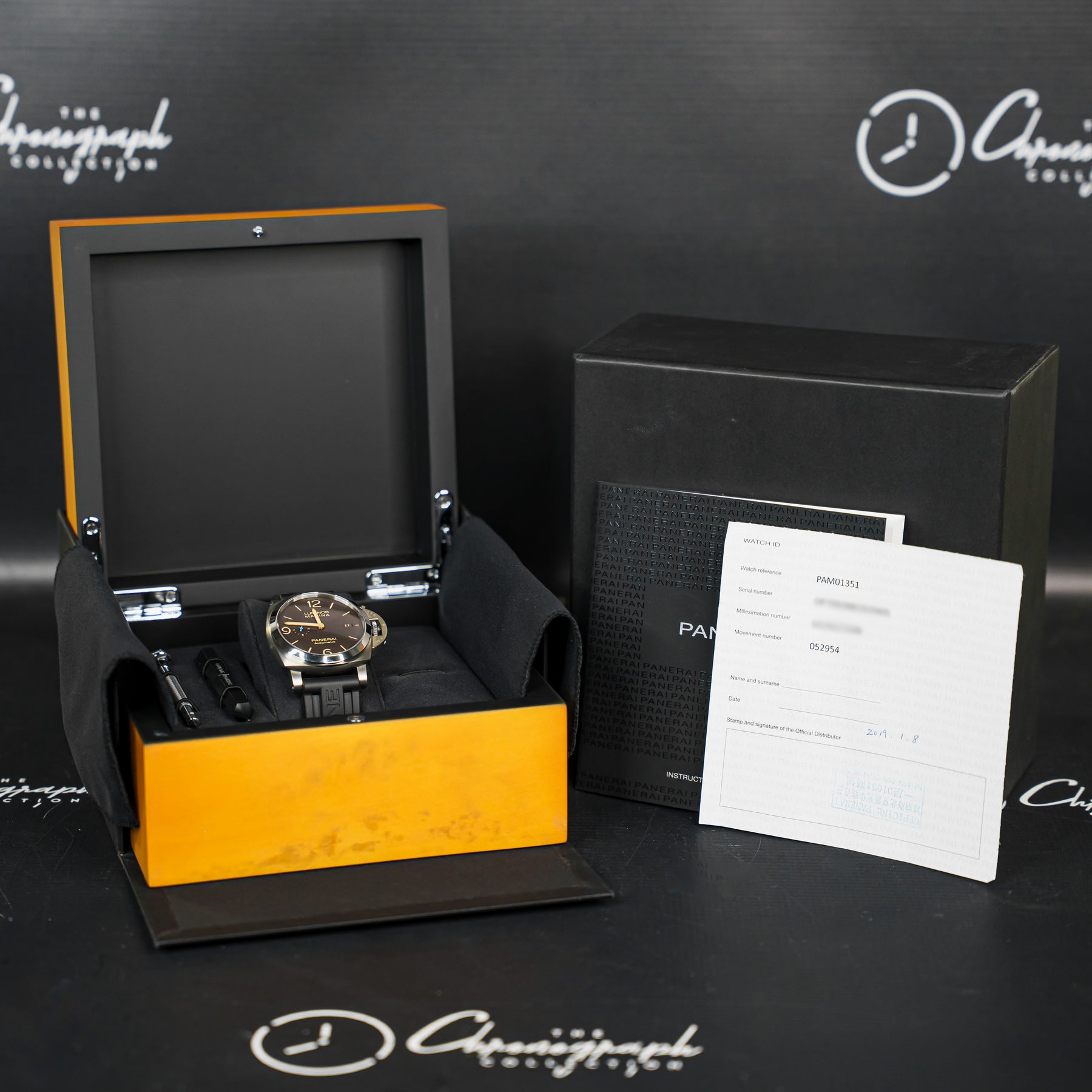 The PAM01351 is a perfect combination of sport and style. It has a more uncommon brown dal that compliments its beige sandwich indices and gold handset beautifully. The small seconds subdial at 9 o'clock also brings a flash of color with its blue hand, standing out strongly against the other darker tones. Also featured on the dial is a date window at 3 o'clock, making the PAM01351 more practical for daily wear. 300 meters of water resistance completes the package of this watch and makes it ready for anything. Powering this watch is Panerai's in-house Caliber P.9010 automatic watch with 72 hours of power reserve.
