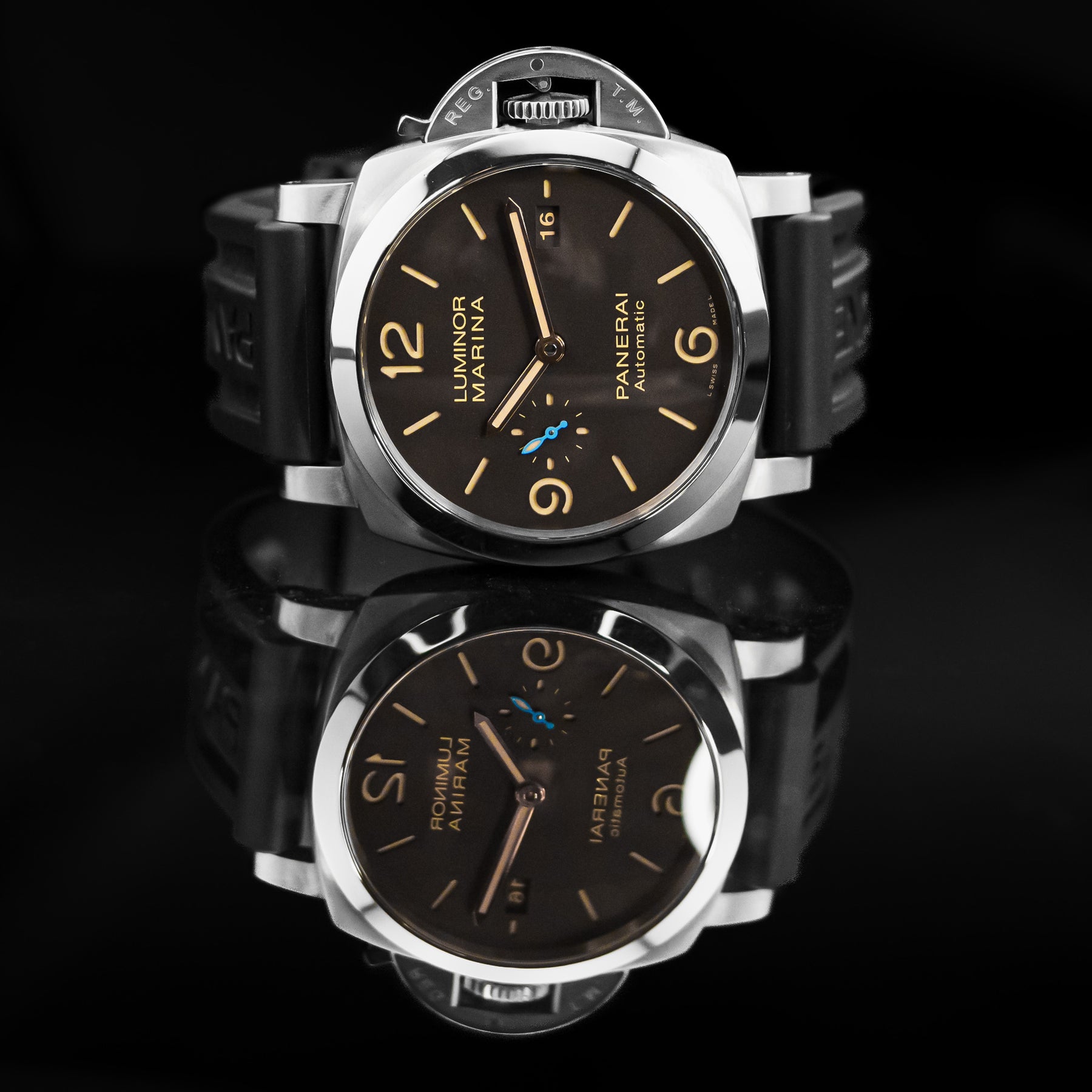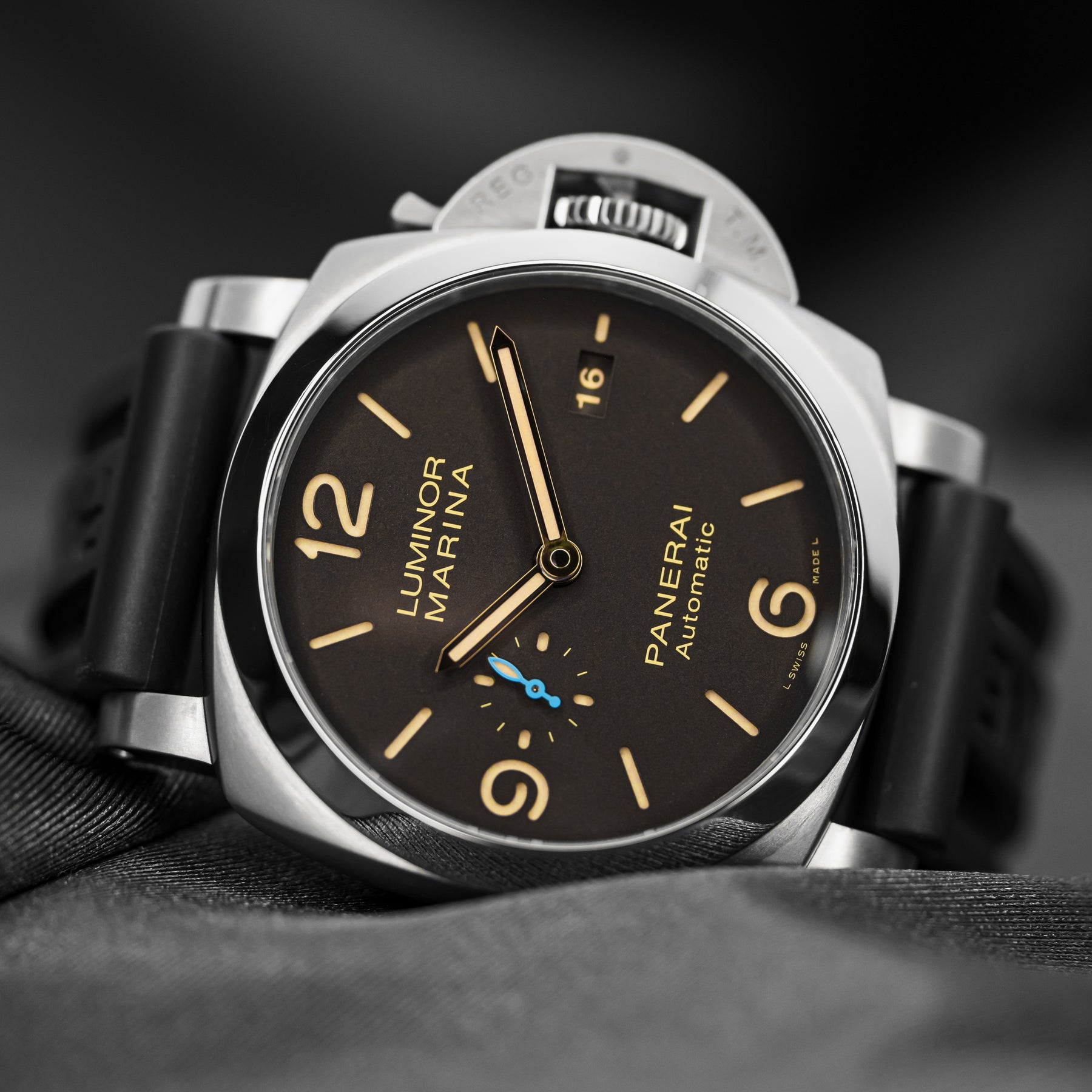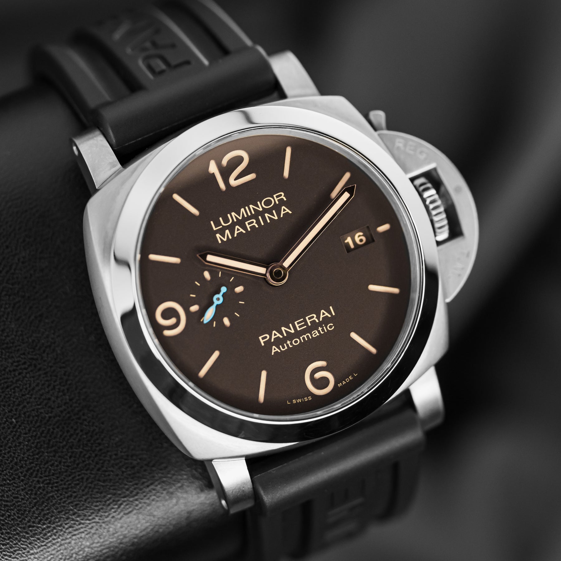 The PAM01351 is a perfect combination of sport and style. It has a more uncommon brown dal that compliments its beige sandwich indices and gold handset beautifully. The small seconds subdial at 9 o'clock also brings a flash of color with its blue hand, standing out strongly against the other darker tones. Also featured on the dial is a date window at 3 o'clock, making the PAM01351 more practical for daily wear. 300 meters of water resistance completes the package of this watch and makes it ready for anything. Powering this watch is Panerai's in-house Caliber P.9010 automatic watch with 72 hours of power reserve.