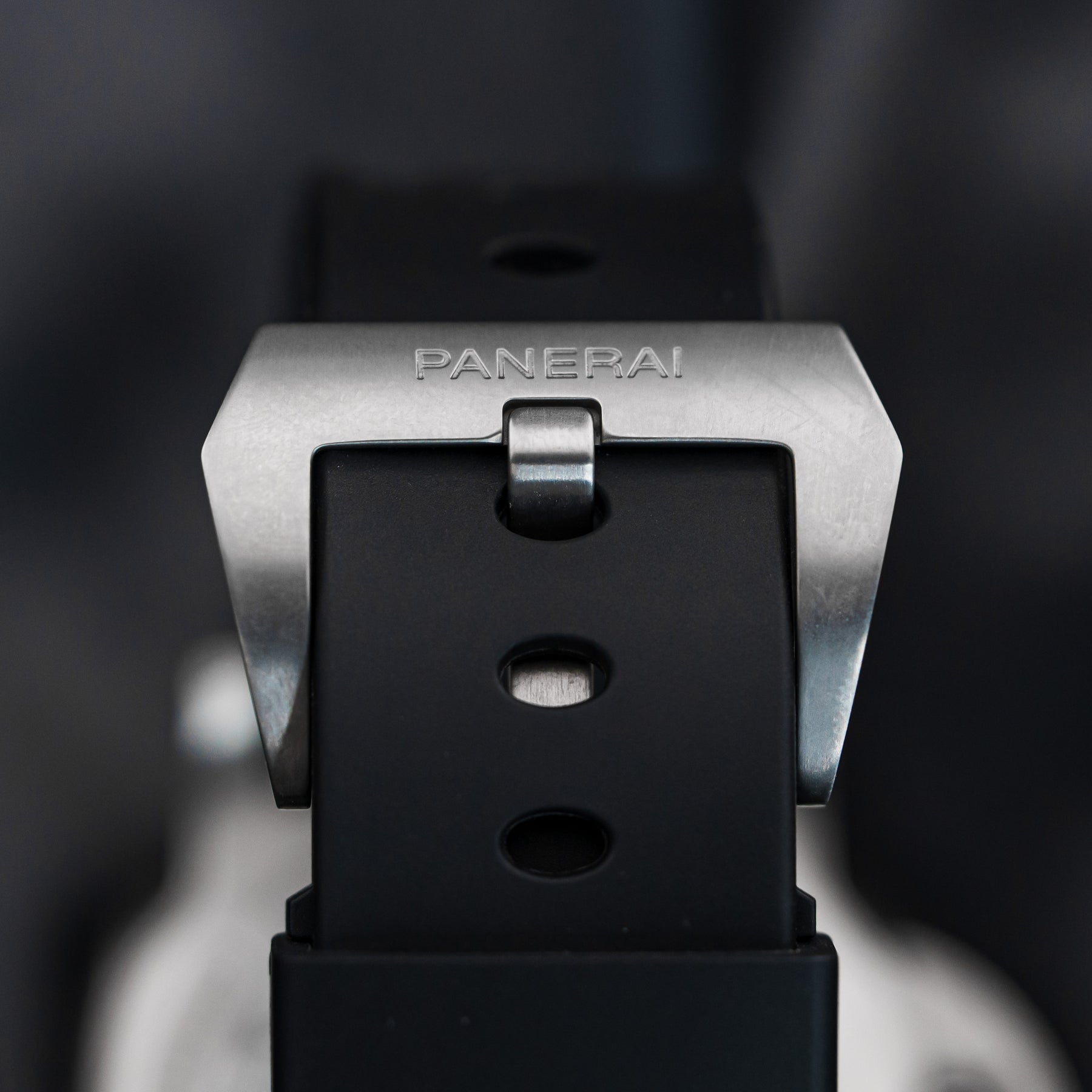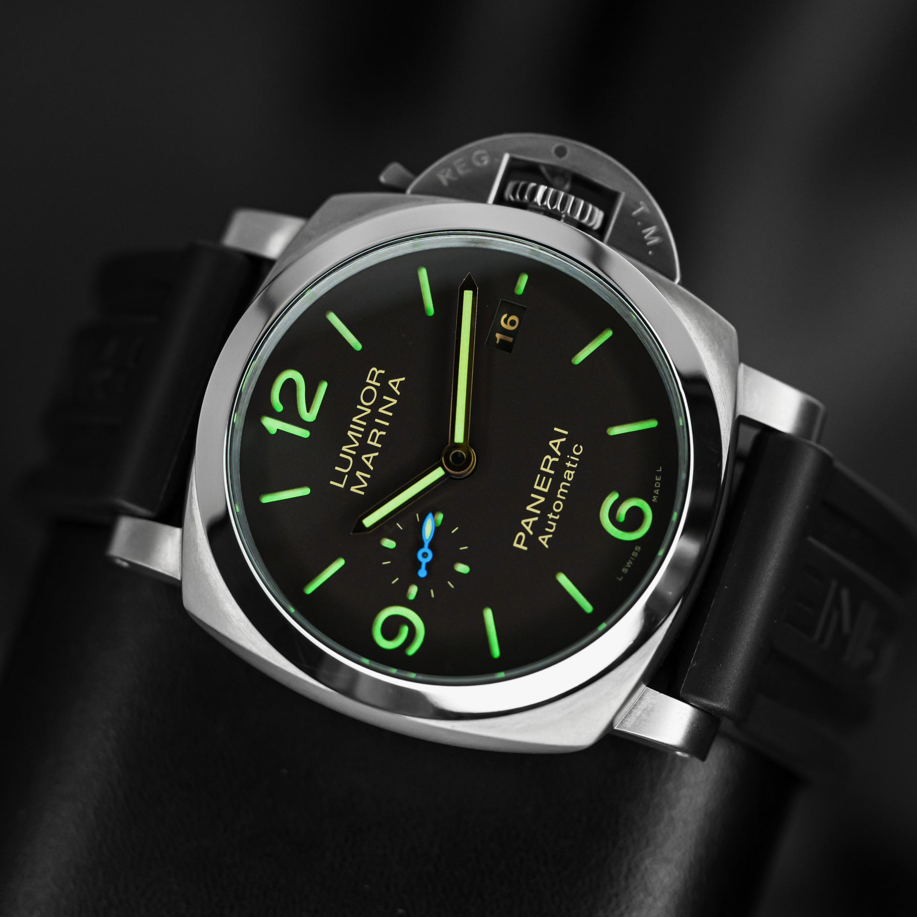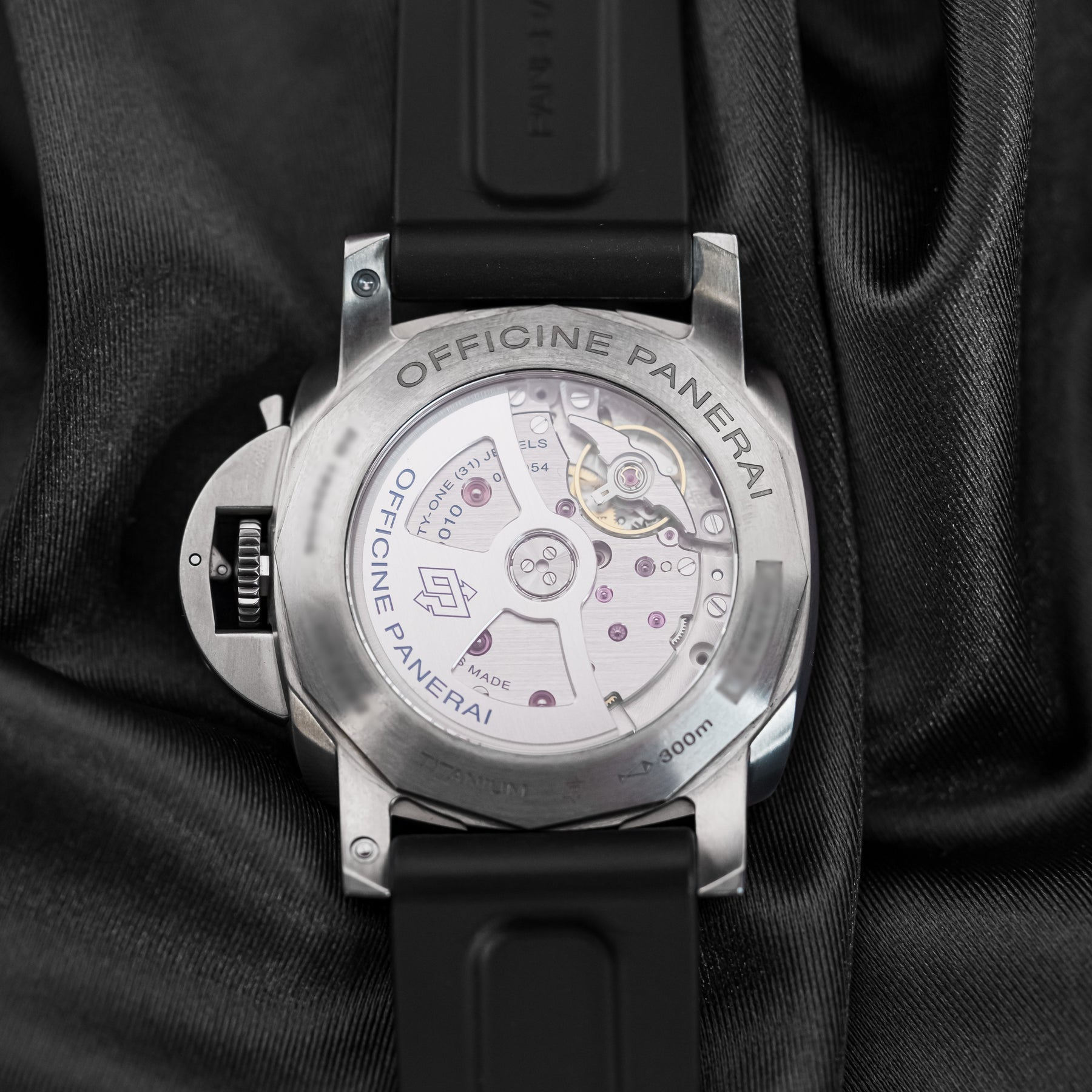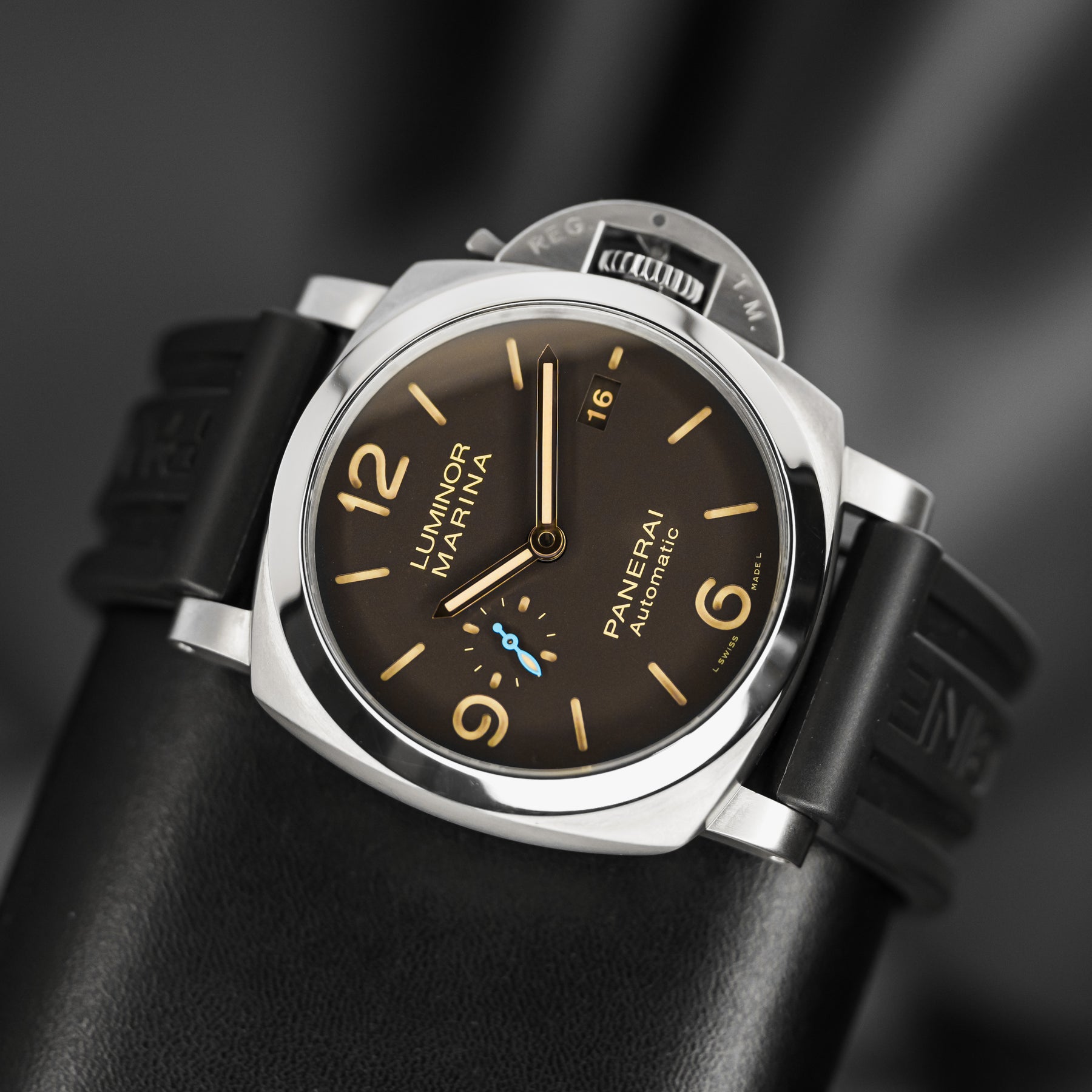The PAM01351 is a perfect combination of sport and style. It has a more uncommon brown dal that compliments its beige sandwich indices and gold handset beautifully. The small seconds subdial at 9 o'clock also brings a flash of color with its blue hand, standing out strongly against the other darker tones. Also featured on the dial is a date window at 3 o'clock, making the PAM01351 more practical for daily wear. 300 meters of water resistance completes the package of this watch and makes it ready for anything. Powering this watch is Panerai's in-house Caliber P.9010 automatic watch with 72 hours of power reserve.