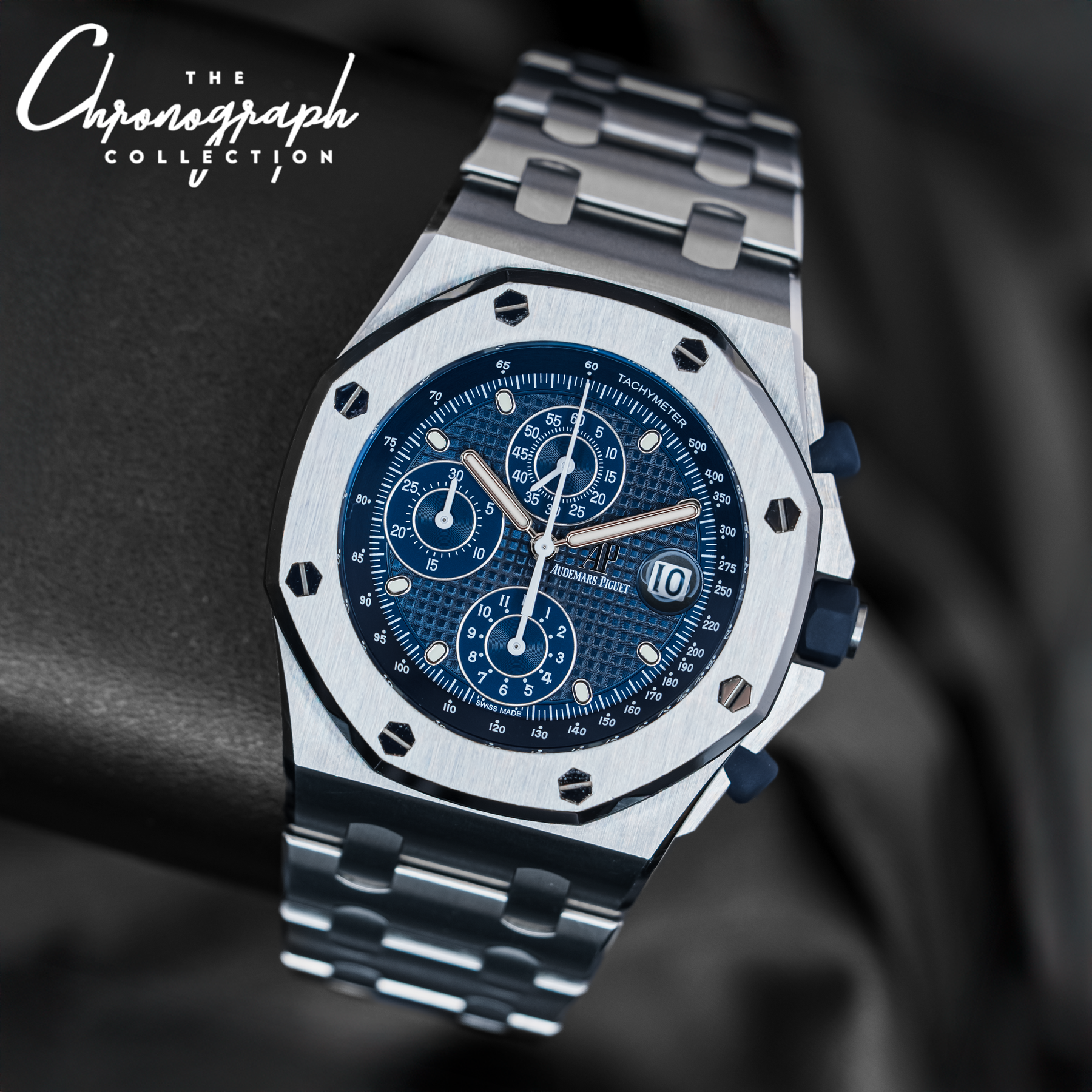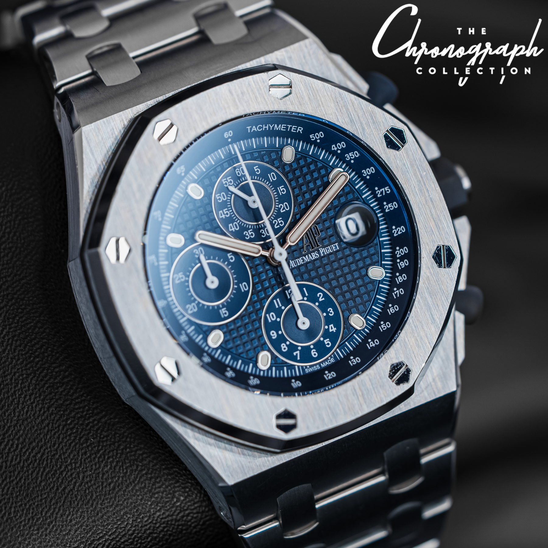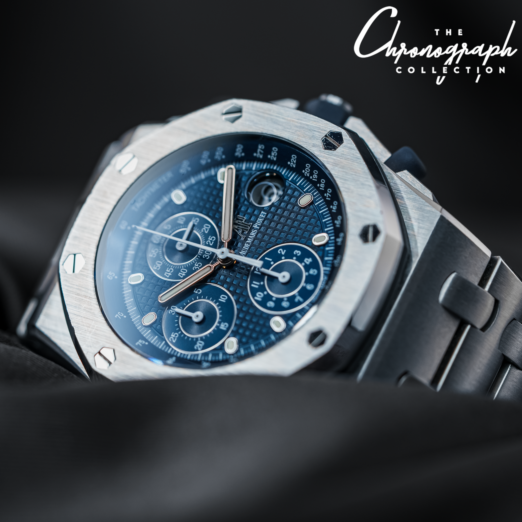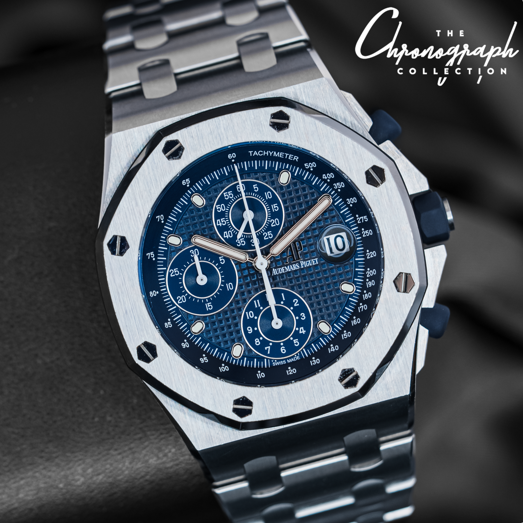 The Royal Oak Offshore “Blue Beast” is a wonderful tribute to Audemars Piguet’s 25 years of Offshore models. Introduced in 2017 to commemorate this milestone, the 26237ST features the newer Offshore bracelet, which is more rounded and comfortable on wrist, a blue Tapisserie dial with sundials at 6, 9, and 12 o’clock, a date window at 3 o’clock, and a rubber set of crown and pushers. Powering the Blue Beast is Audemars Piguet’s in-house Caliber 3126/3840 automatic movement with 50 hours of power reserve.