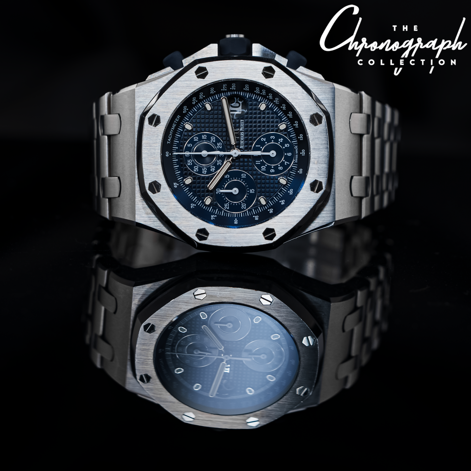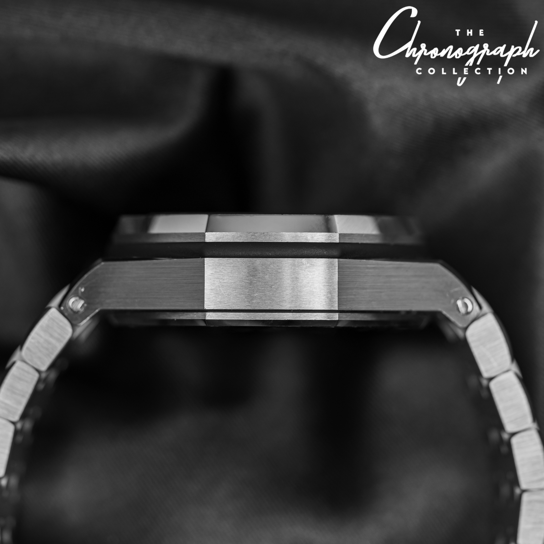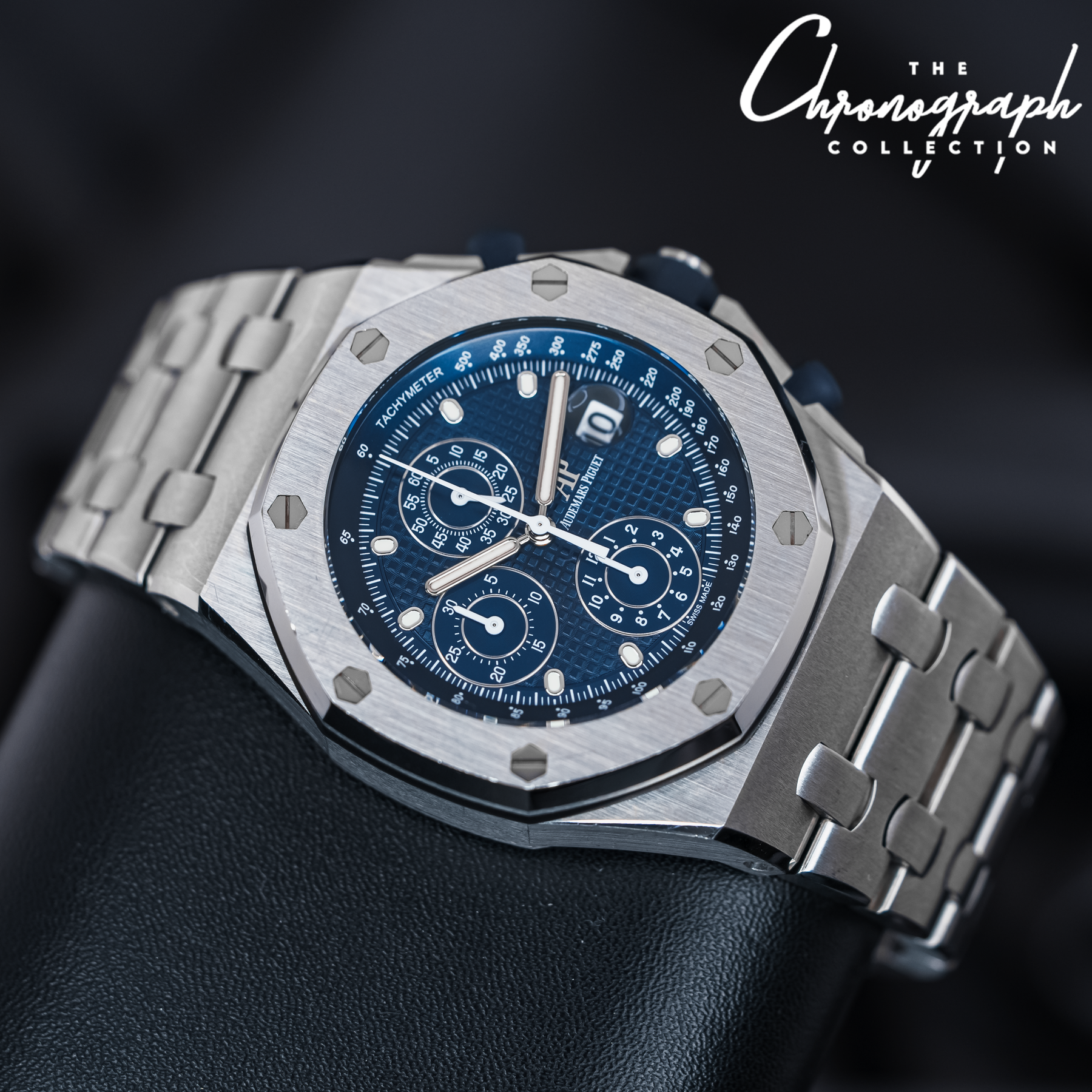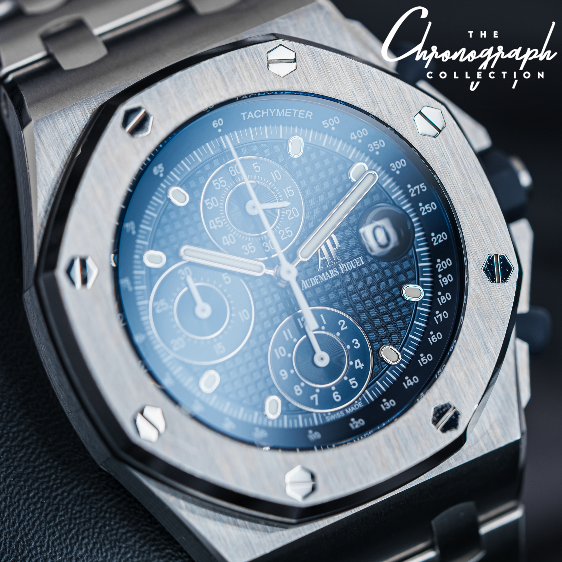 The Royal Oak Offshore “Blue Beast” is a wonderful tribute to Audemars Piguet’s 25 years of Offshore models. Introduced in 2017 to commemorate this milestone, the 26237ST features the newer Offshore bracelet, which is more rounded and comfortable on wrist, a blue Tapisserie dial with sundials at 6, 9, and 12 o’clock, a date window at 3 o’clock, and a rubber set of crown and pushers. Powering the Blue Beast is Audemars Piguet’s in-house Caliber 3126/3840 automatic movement with 50 hours of power reserve.