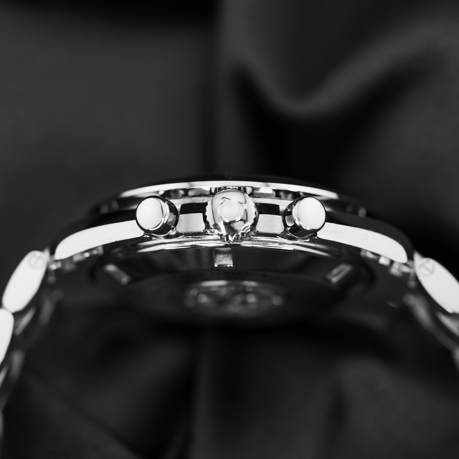 The Speedmaster Professional Moonwatch is quite literally the watch that made Omega what it is today, a household name in Swiss watchmaking. With a rich history dating back to the 1960s and the iconic Space Race, this Speedmaster is deliberately made to be as close to the original as possible. It sacrifices the modern and common sapphire crystal for a more period-correct and highly domed hesalite acrylic crystal. It also features a thicker and more robust, utilitarian bracelet, as opposed to the slimmer and more classic bracelets from the sapphire crystal models. This ethos is continued even with the clasp, which is thicker, bulkier, and more rugged. The differences in watch details stop here, but the Moonwatch is famous for its large box set with a plethora of memorabilia and accessories (including the iconic Speedmaster medallion, a NATO strap, NASA spacesuit strap, and Speedmaster history book. Powering this legendary watch is Omega’s in-house Caliber 1861 mechanical movement with 48 hours of power reserve.