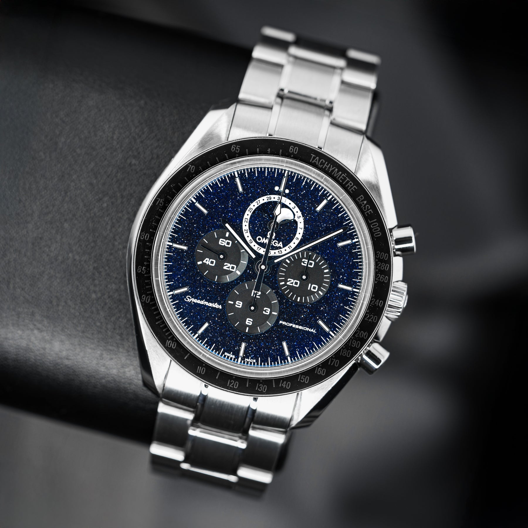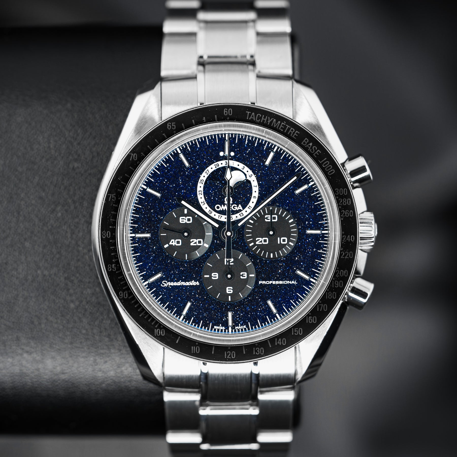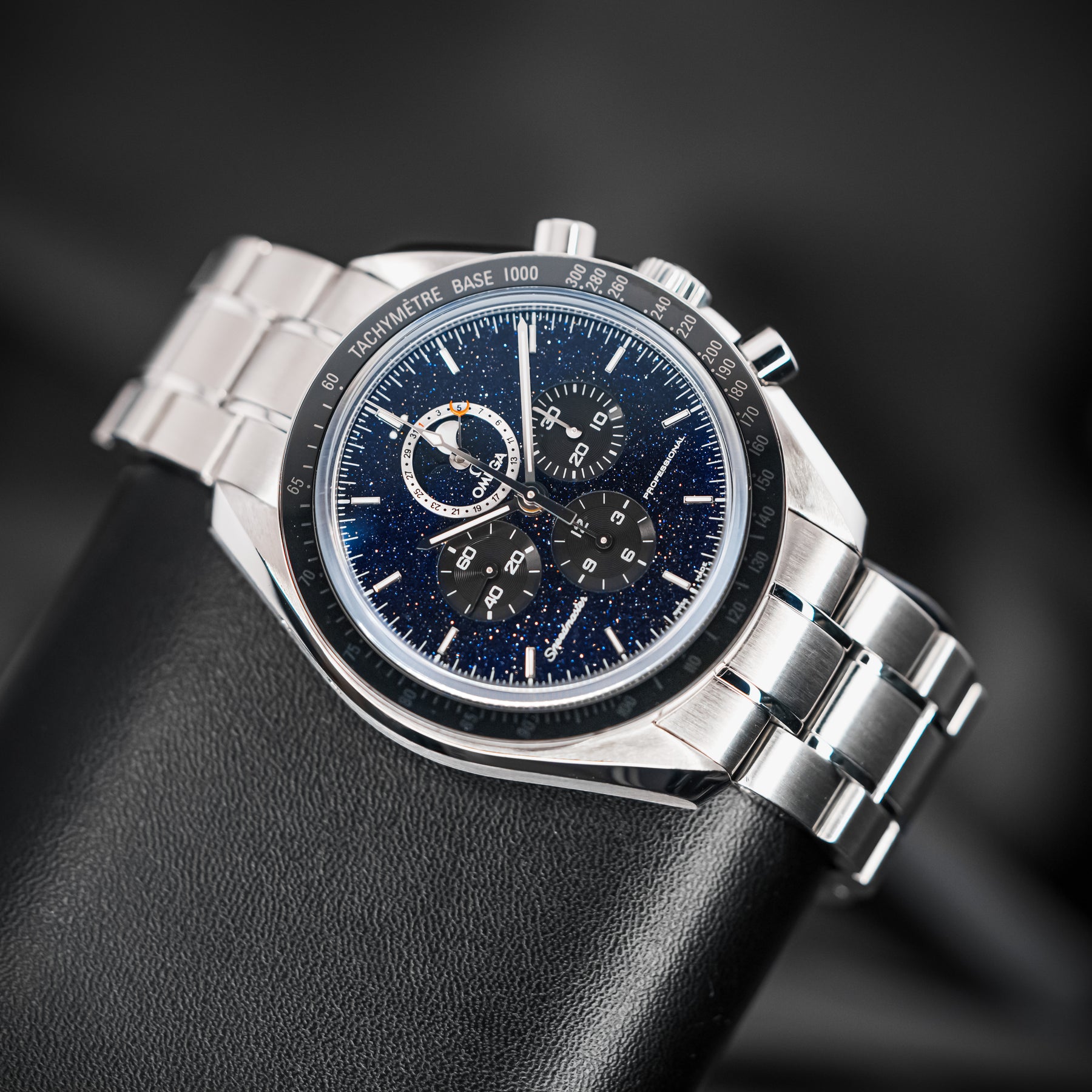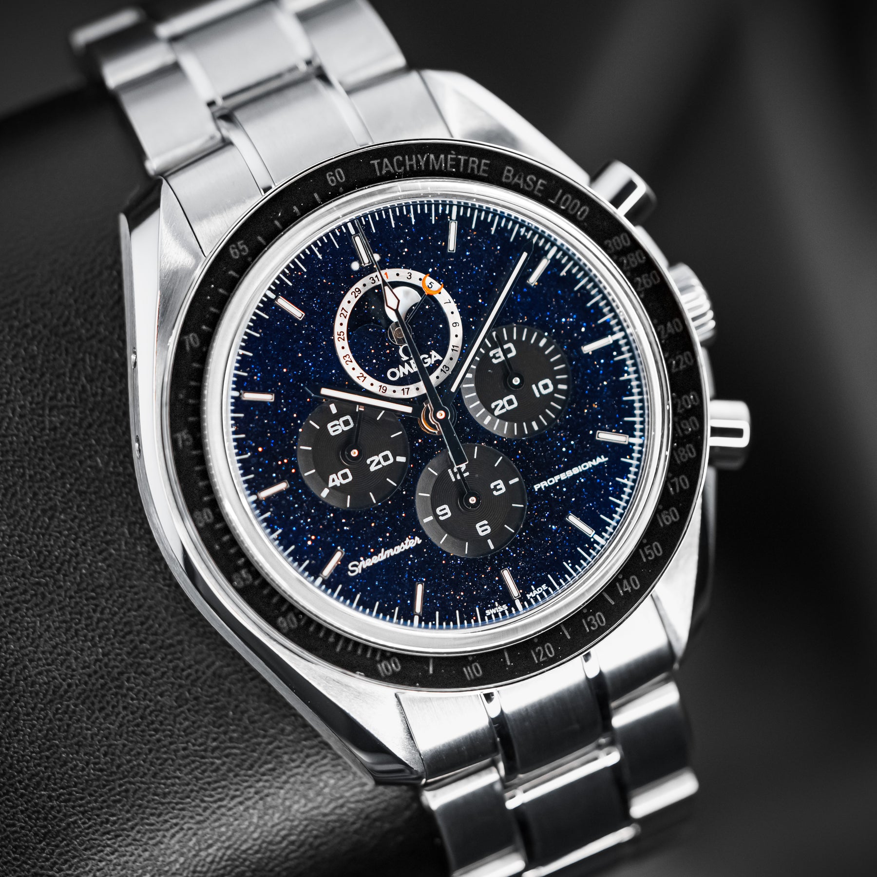 The Speedmaster Professional is already Omega's flagship model – it is to Omega what the Submariner is to Rolex. This model takes an icon and builds on it, making it into the undisputed quintessential space watch. The changes are subtle, but their combined effect is large. The plain black dial is swapped for a blackened aventurine dial, resembling a starry space sky. The dial also features the standard Speedmaster chronograph subdials, as well as a combined date and moonphase subdial at 12 o'clock. Powering this Speedmaster is Omega's in-house Caliber 1861 mechanical movement with 48 hours of power reserve.