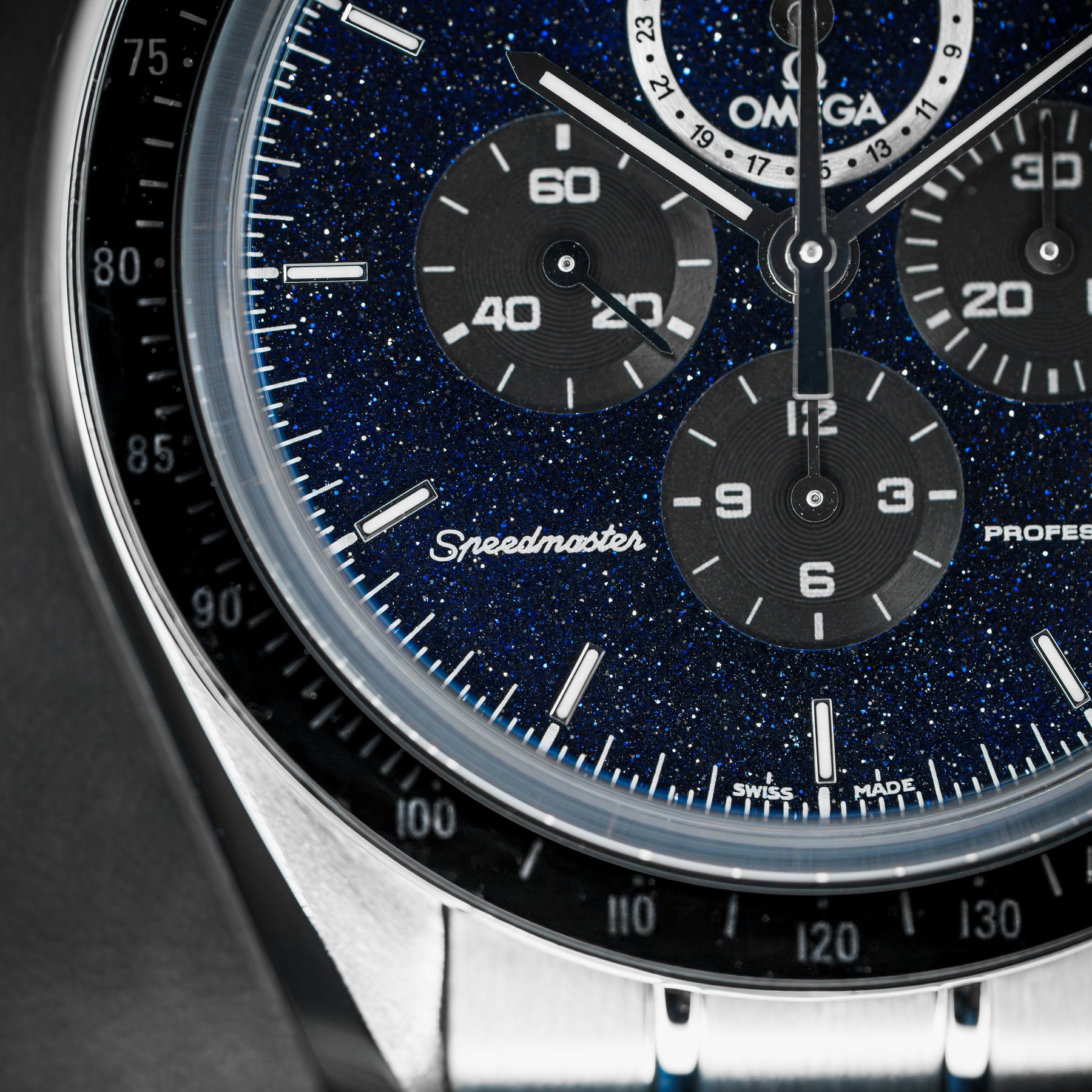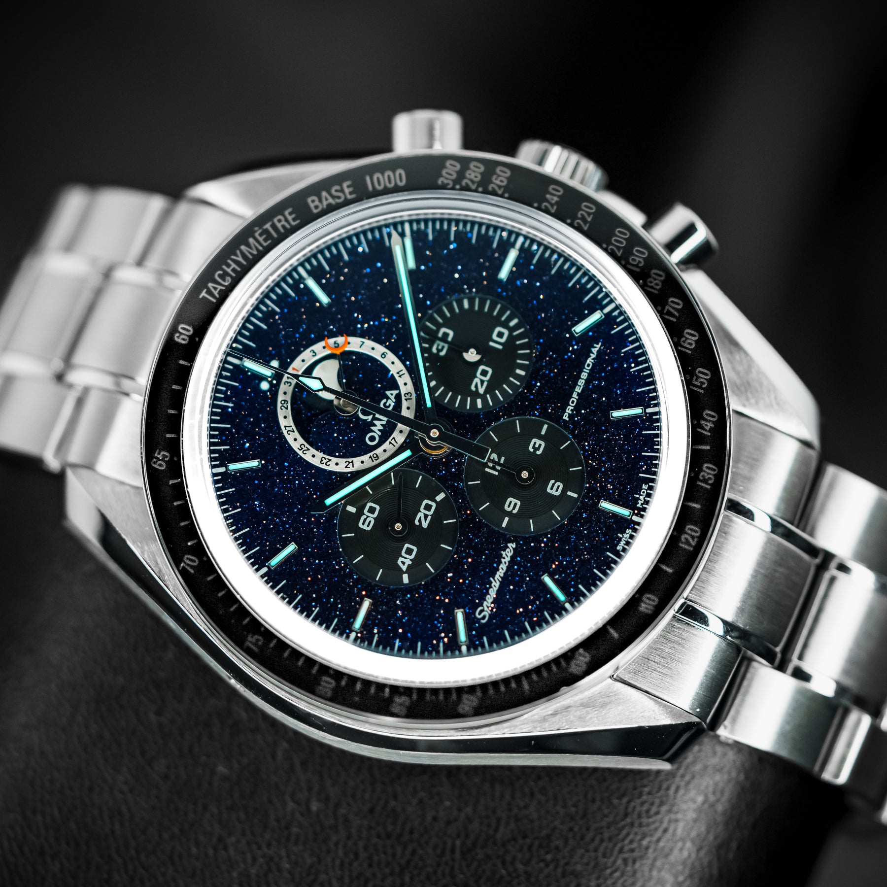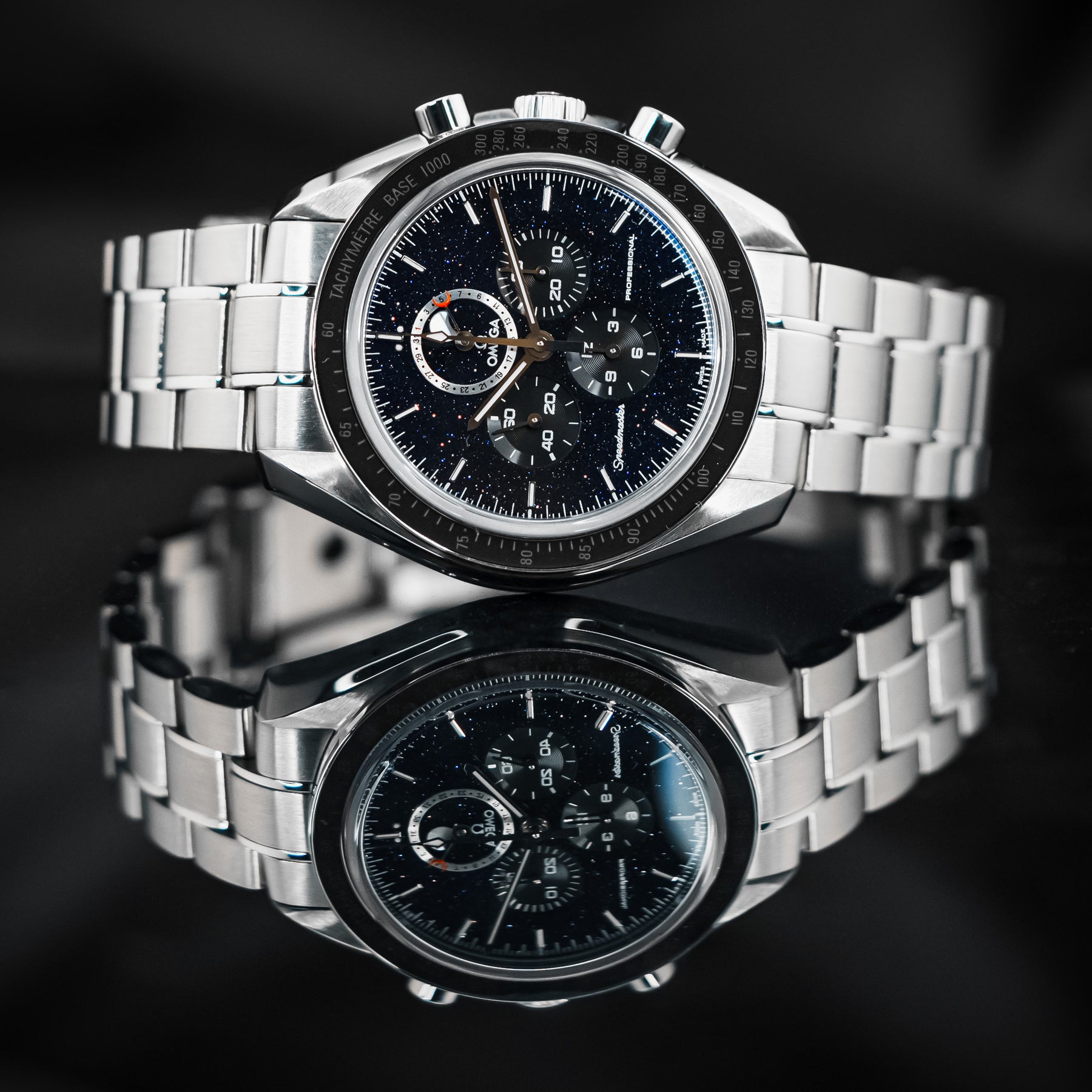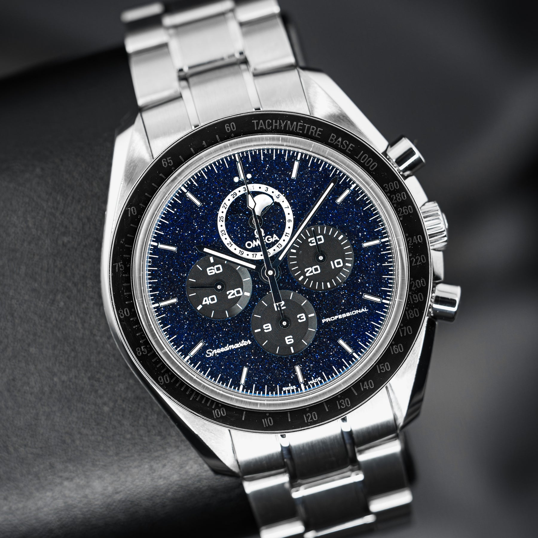 The Speedmaster Professional is already Omega's flagship model – it is to Omega what the Submariner is to Rolex. This model takes an icon and builds on it, making it into the undisputed quintessential space watch. The changes are subtle, but their combined effect is large. The plain black dial is swapped for a blackened aventurine dial, resembling a starry space sky. The dial also features the standard Speedmaster chronograph subdials, as well as a combined date and moonphase subdial at 12 o'clock. Powering this Speedmaster is Omega's in-house Caliber 1861 mechanical movement with 48 hours of power reserve.