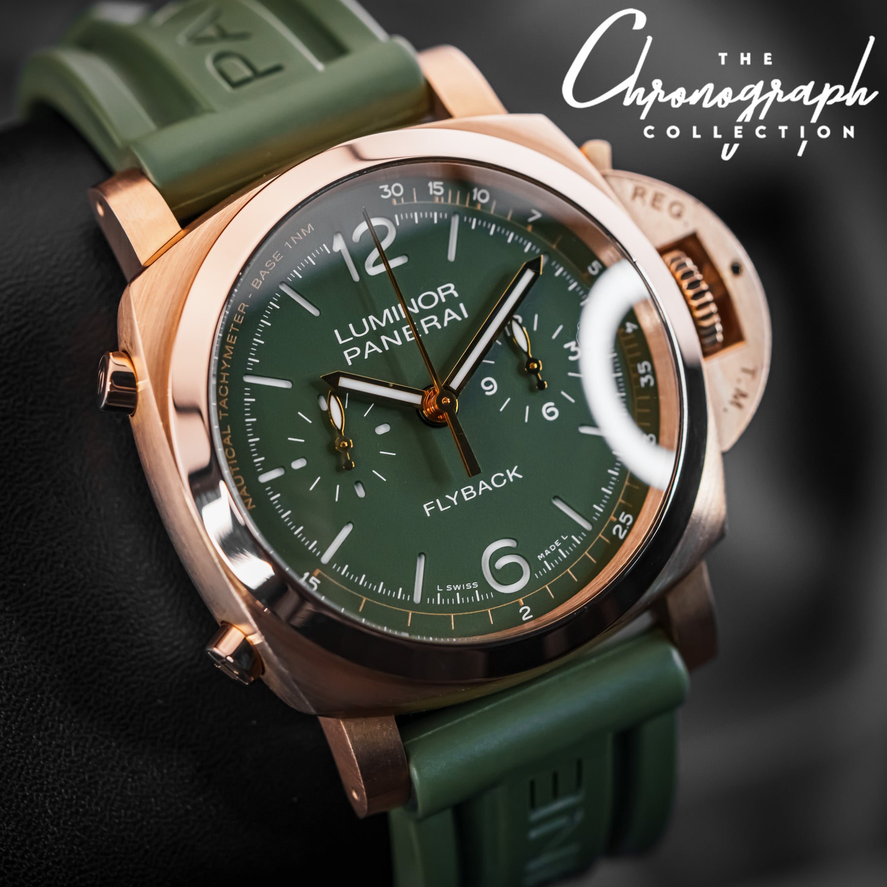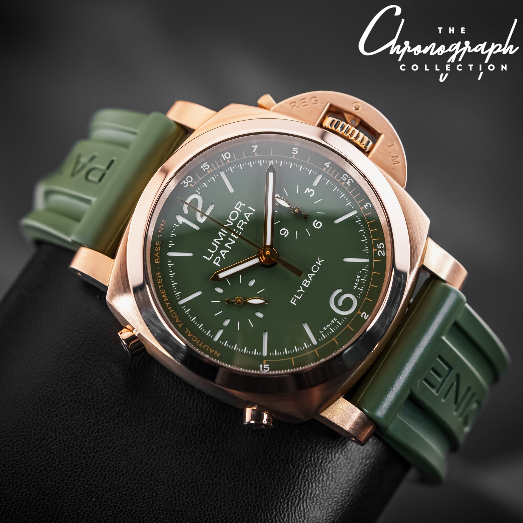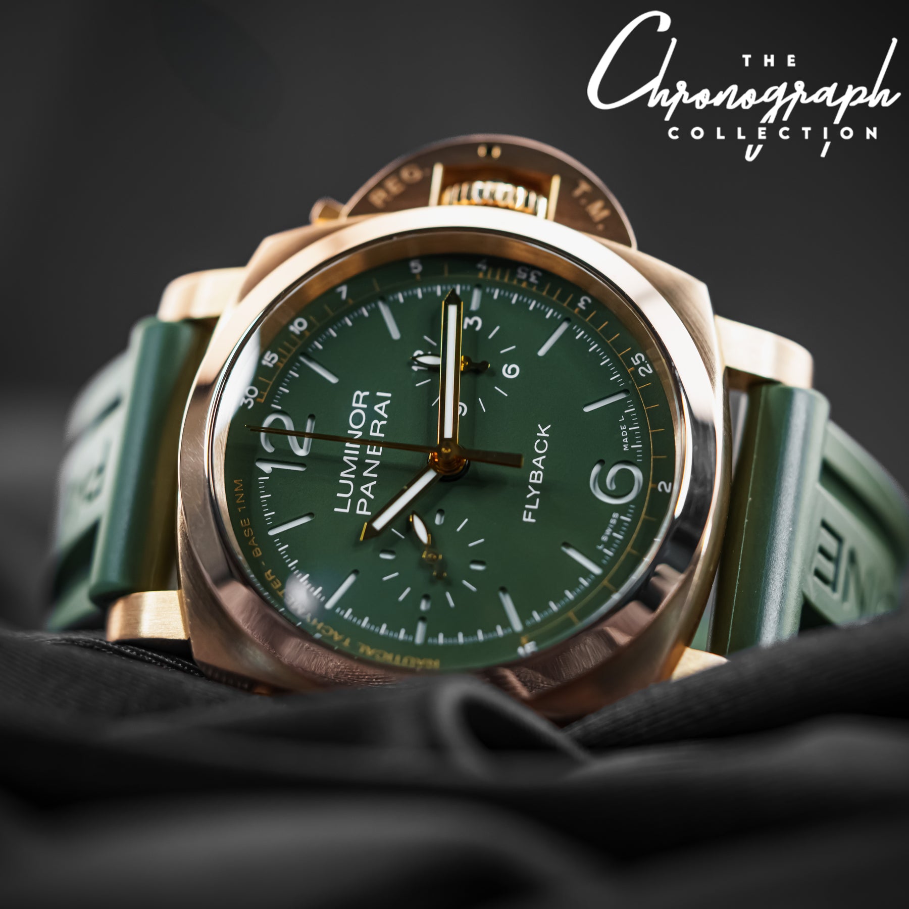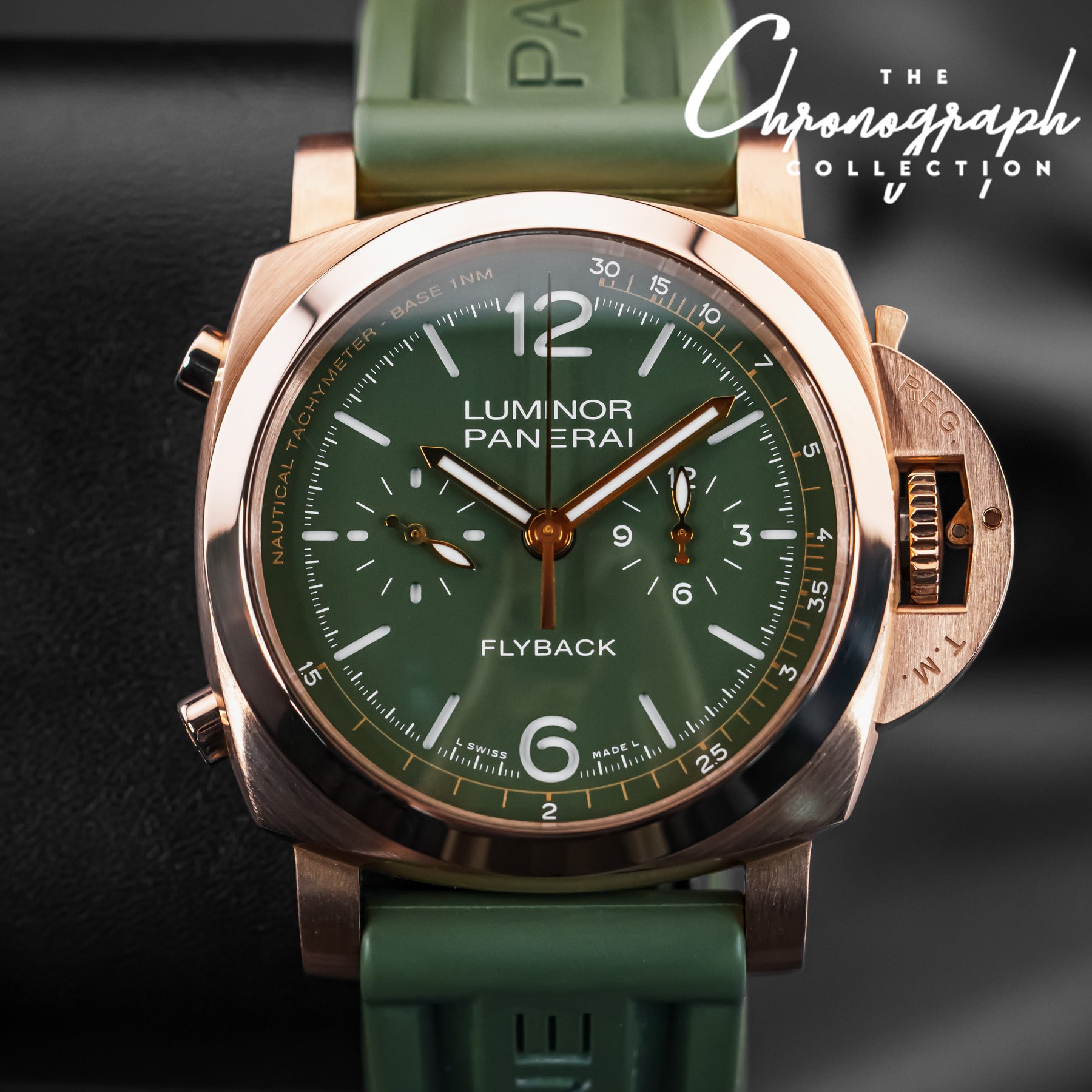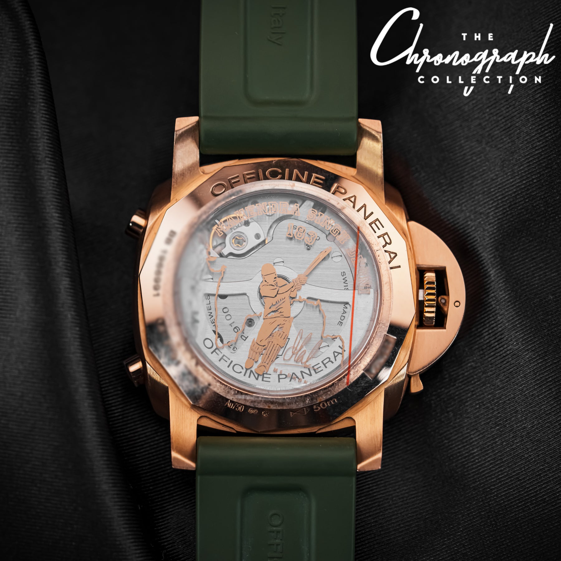 The PAM01057 was ahead of its time when it was released in 2019. The green watch hype built steadily over the next four years, making this watch more and more desirable. Limited to just 77 units, this watch was made as a collaboration with Indian cricketer Mahendra Singh Dhoni, who is featured on the sapphire crystal caseback. The PAM01057 features a beautiful 1950 case made from solid rose gold (Panerai’s proprietary “Goldtech” alloy), with an olive green dial and matching silicone strap. The watch is nearly identical to the ever-popular PAM00654, with several notable differences, such as the white sandwich indices, redesigned chapter ring, and modified chronograph subdial. Powering the PAM01057 is Panerai’s in-house Caliber P.9100 automatic movement with 72 hours of power reserve.