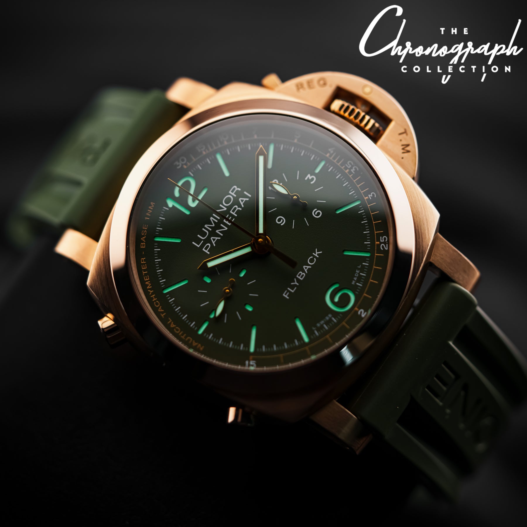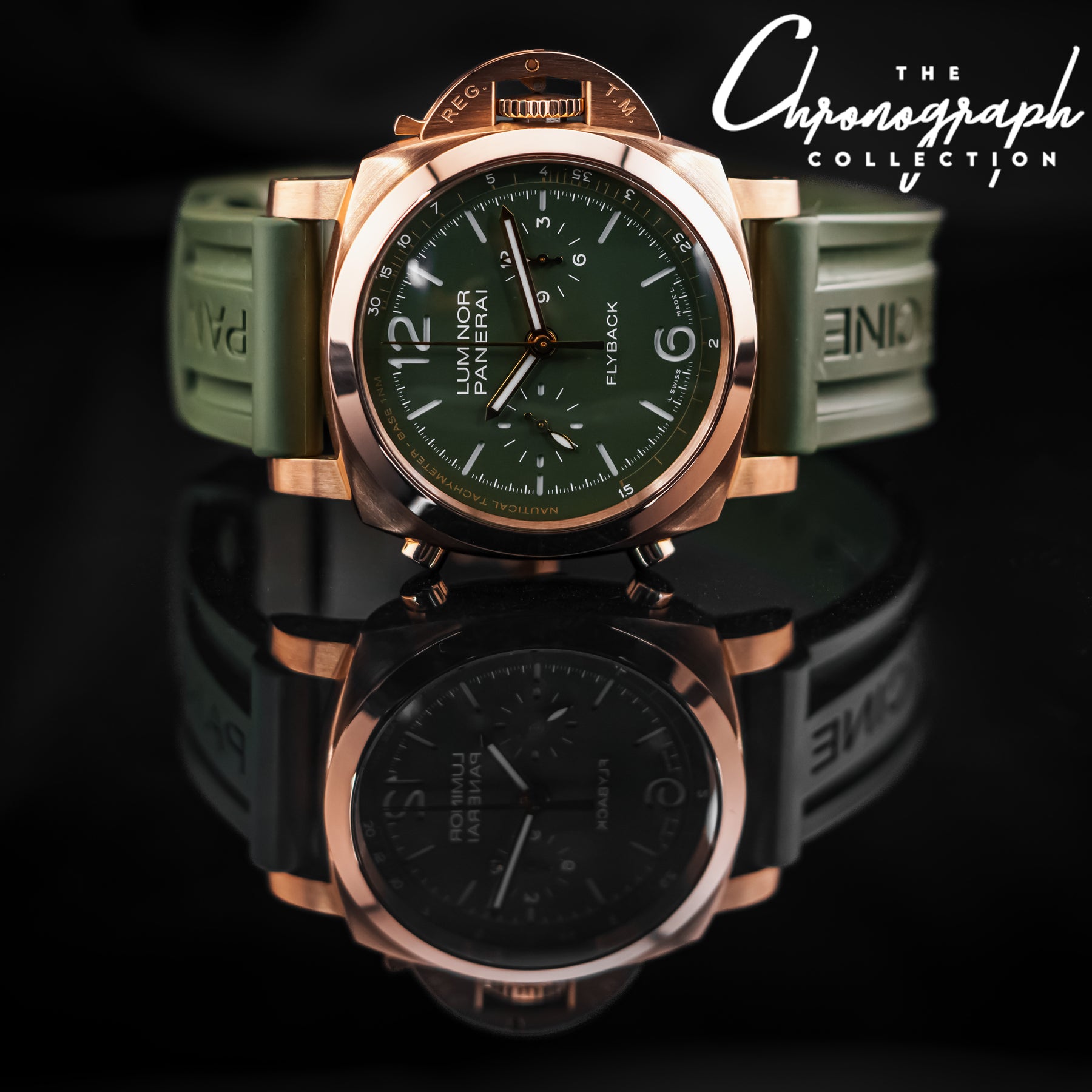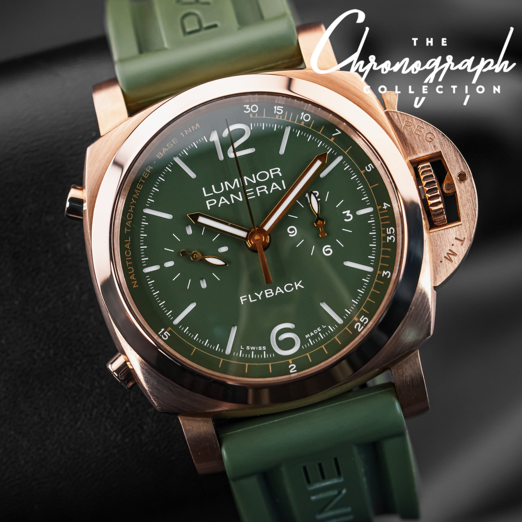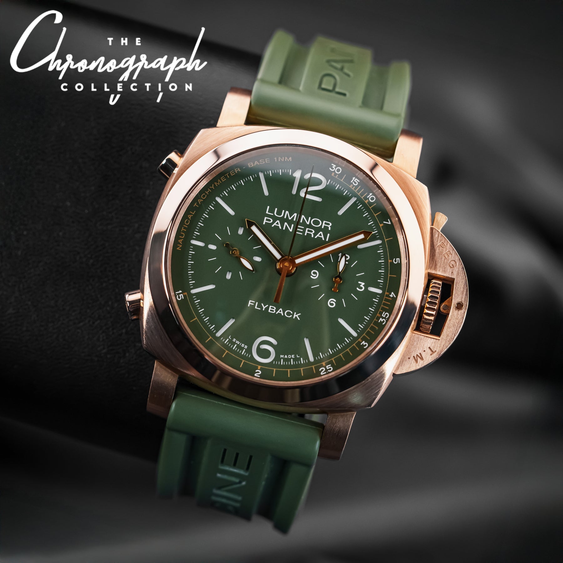 The PAM01057 was ahead of its time when it was released in 2019. The green watch hype built steadily over the next four years, making this watch more and more desirable. Limited to just 77 units, this watch was made as a collaboration with Indian cricketer Mahendra Singh Dhoni, who is featured on the sapphire crystal caseback. The PAM01057 features a beautiful 1950 case made from solid rose gold (Panerai’s proprietary “Goldtech” alloy), with an olive green dial and matching silicone strap. The watch is nearly identical to the ever-popular PAM00654, with several notable differences, such as the white sandwich indices, redesigned chapter ring, and modified chronograph subdial. Powering the PAM01057 is Panerai’s in-house Caliber P.9100 automatic movement with 72 hours of power reserve.