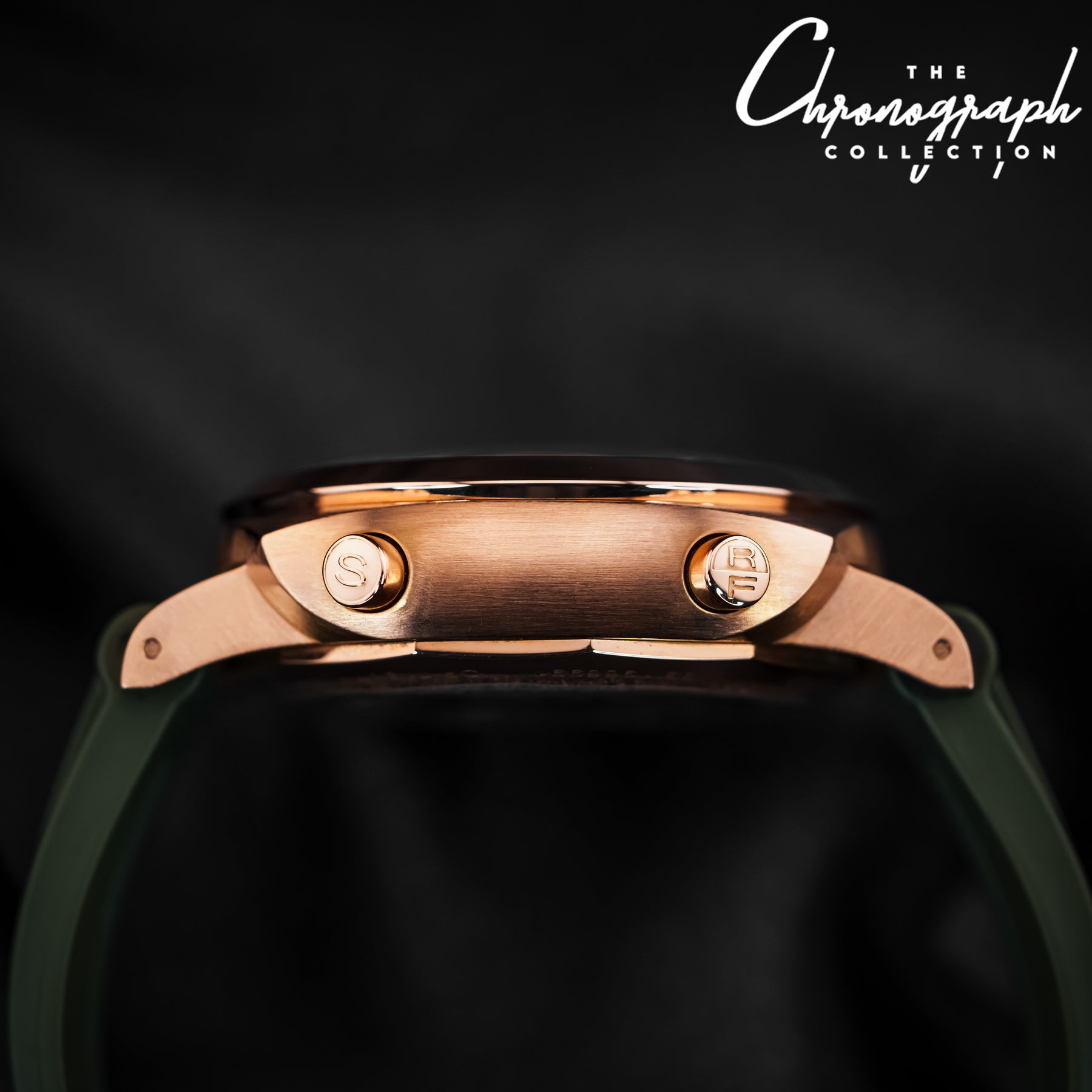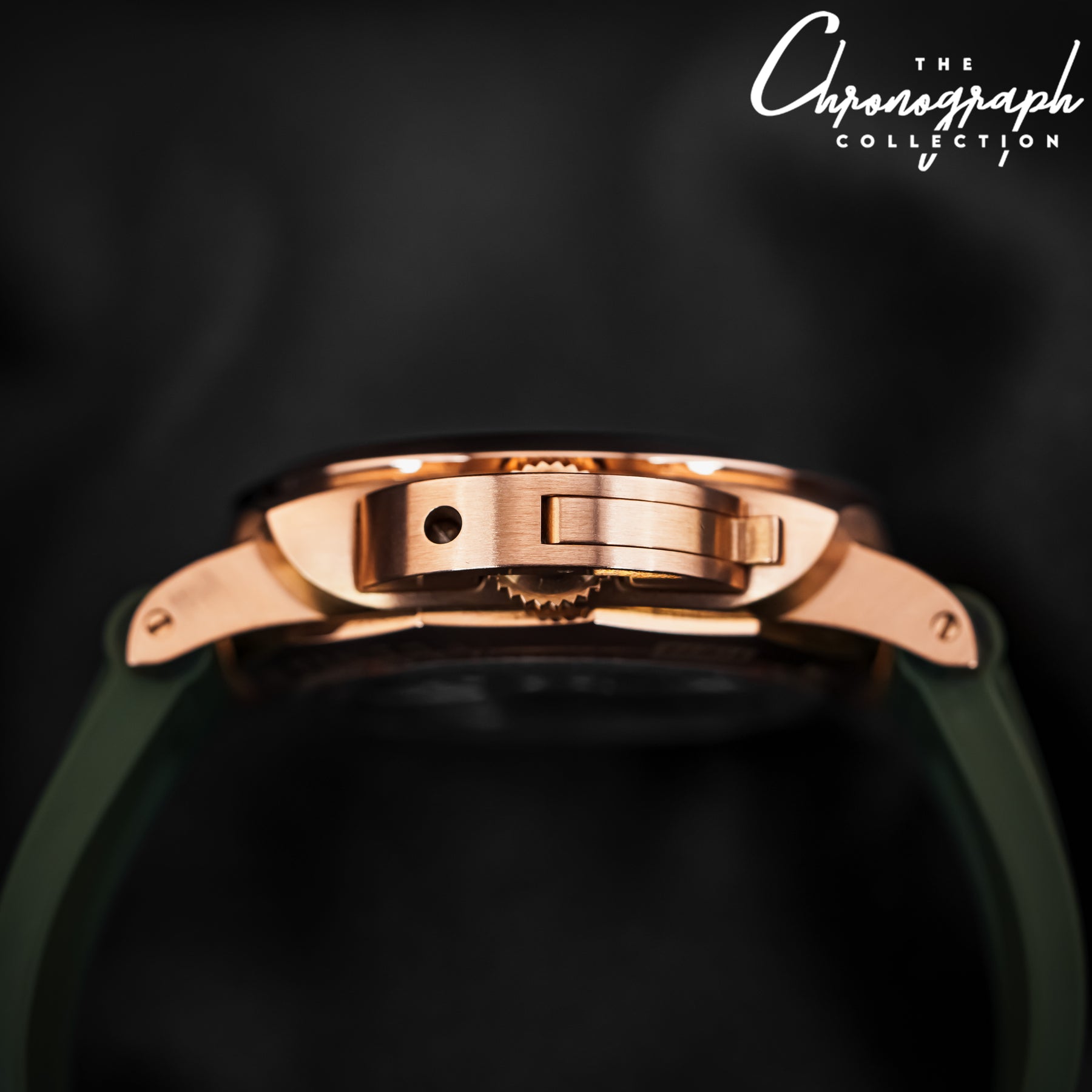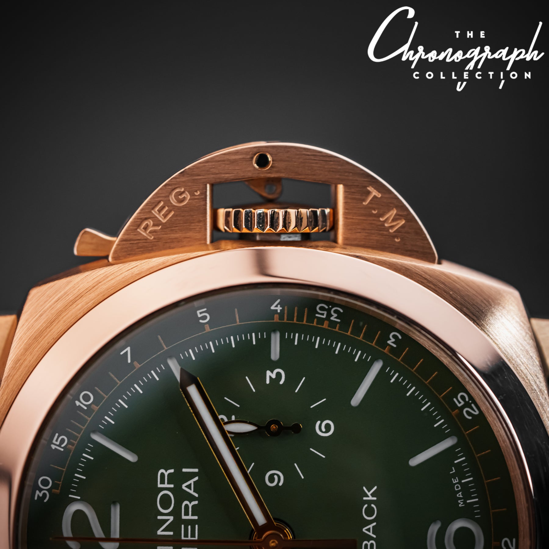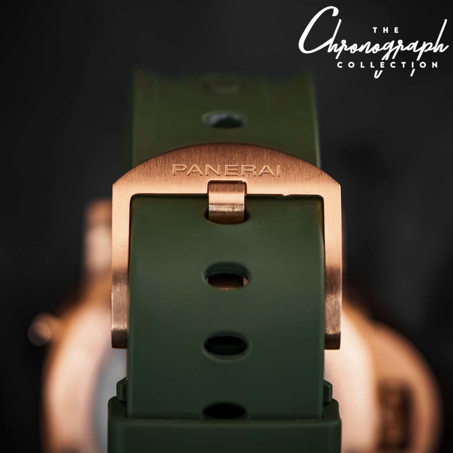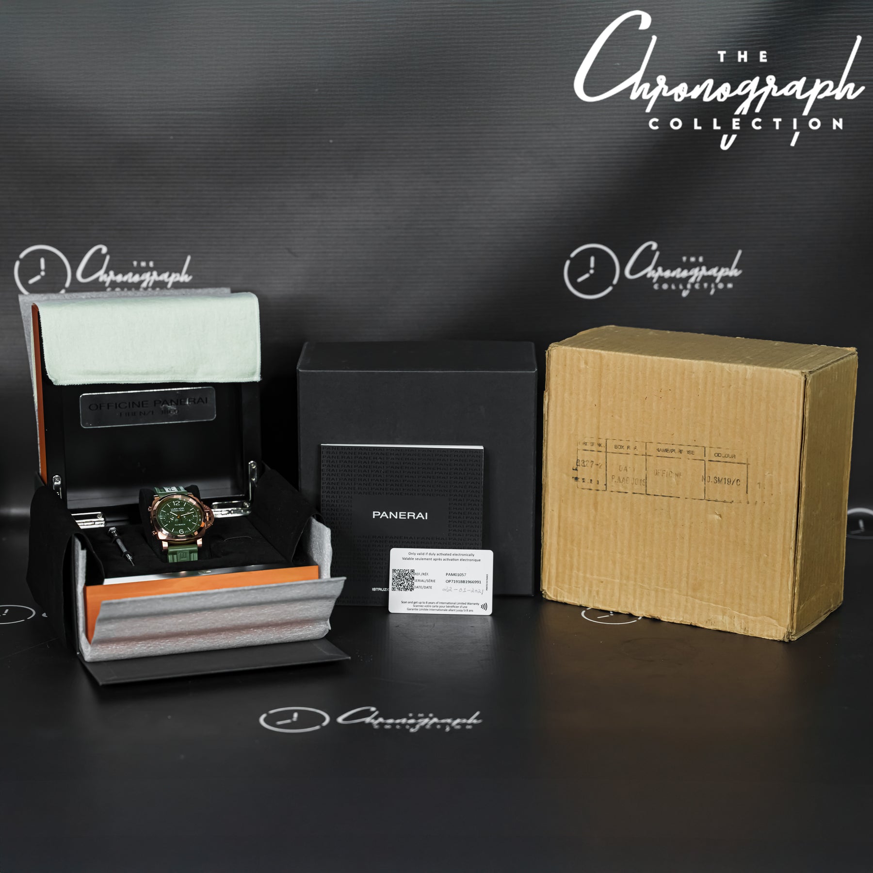 The PAM01057 was ahead of its time when it was released in 2019. The green watch hype built steadily over the next four years, making this watch more and more desirable. Limited to just 77 units, this watch was made as a collaboration with Indian cricketer Mahendra Singh Dhoni, who is featured on the sapphire crystal caseback. The PAM01057 features a beautiful 1950 case made from solid rose gold (Panerai’s proprietary “Goldtech” alloy), with an olive green dial and matching silicone strap. The watch is nearly identical to the ever-popular PAM00654, with several notable differences, such as the white sandwich indices, redesigned chapter ring, and modified chronograph subdial. Powering the PAM01057 is Panerai’s in-house Caliber P.9100 automatic movement with 72 hours of power reserve.