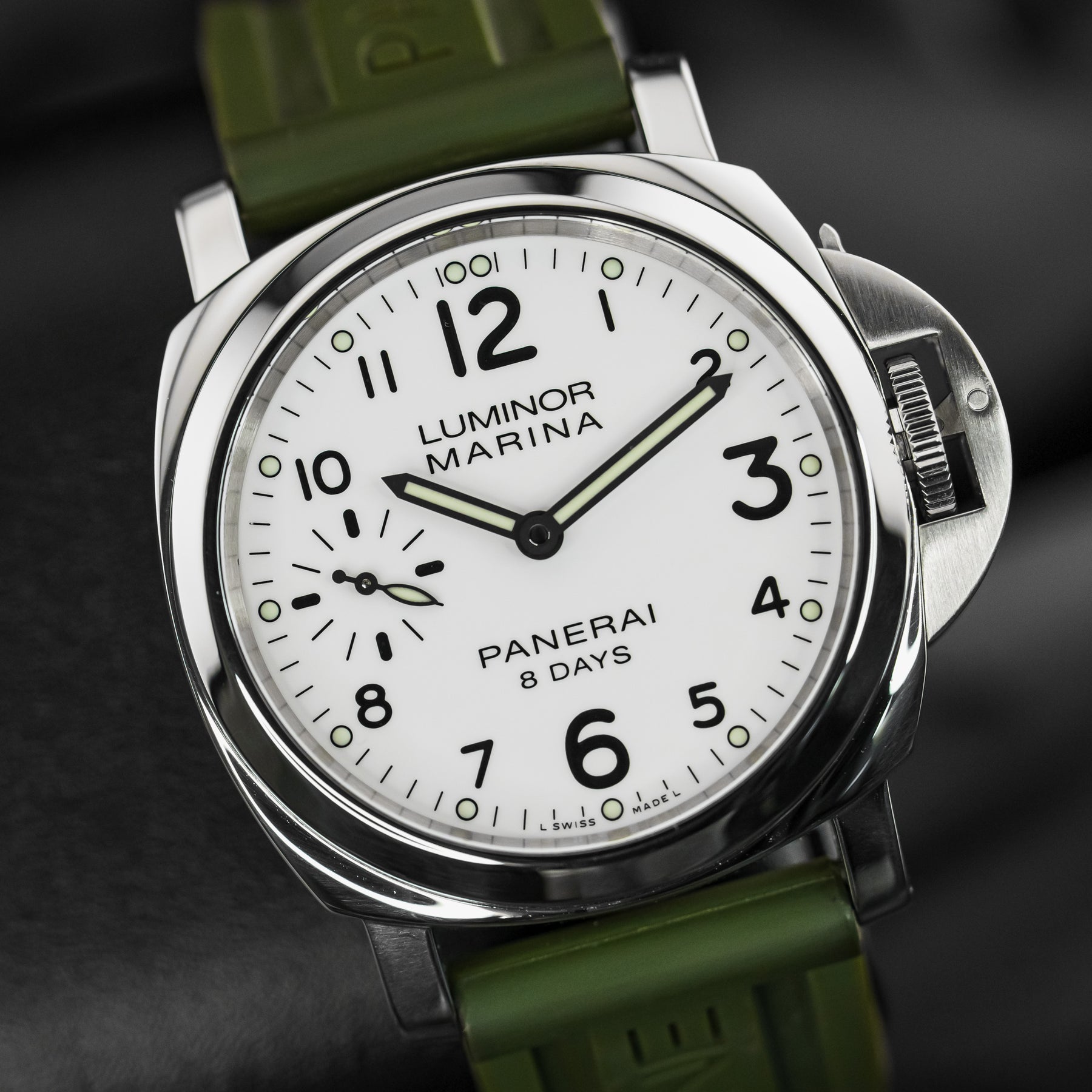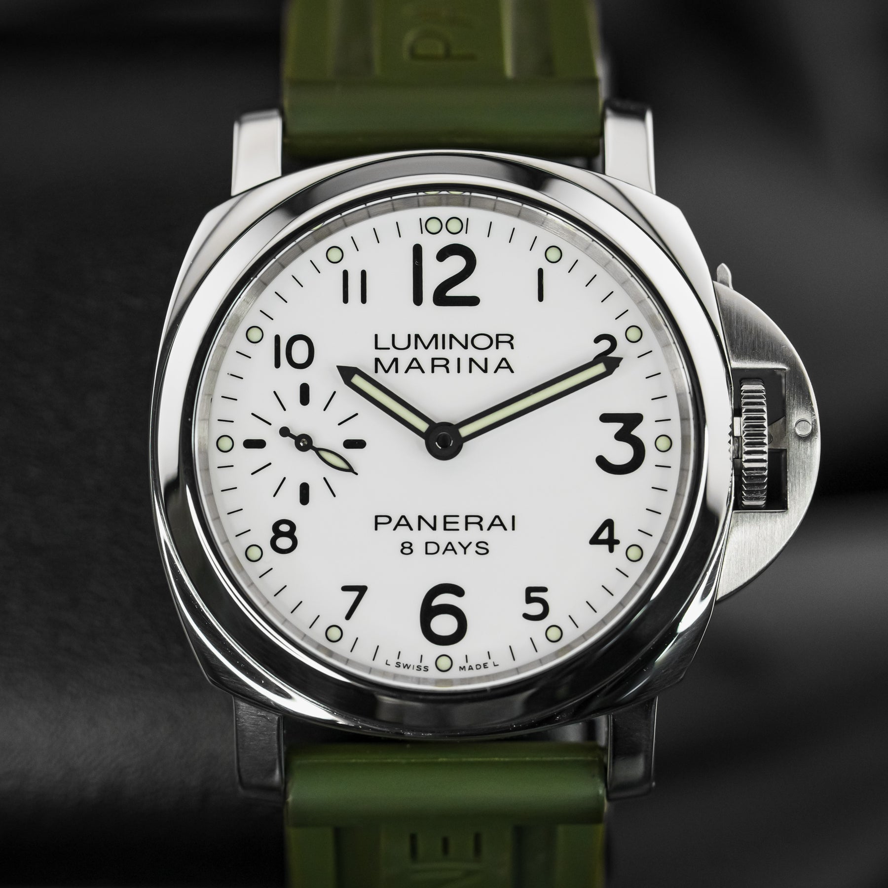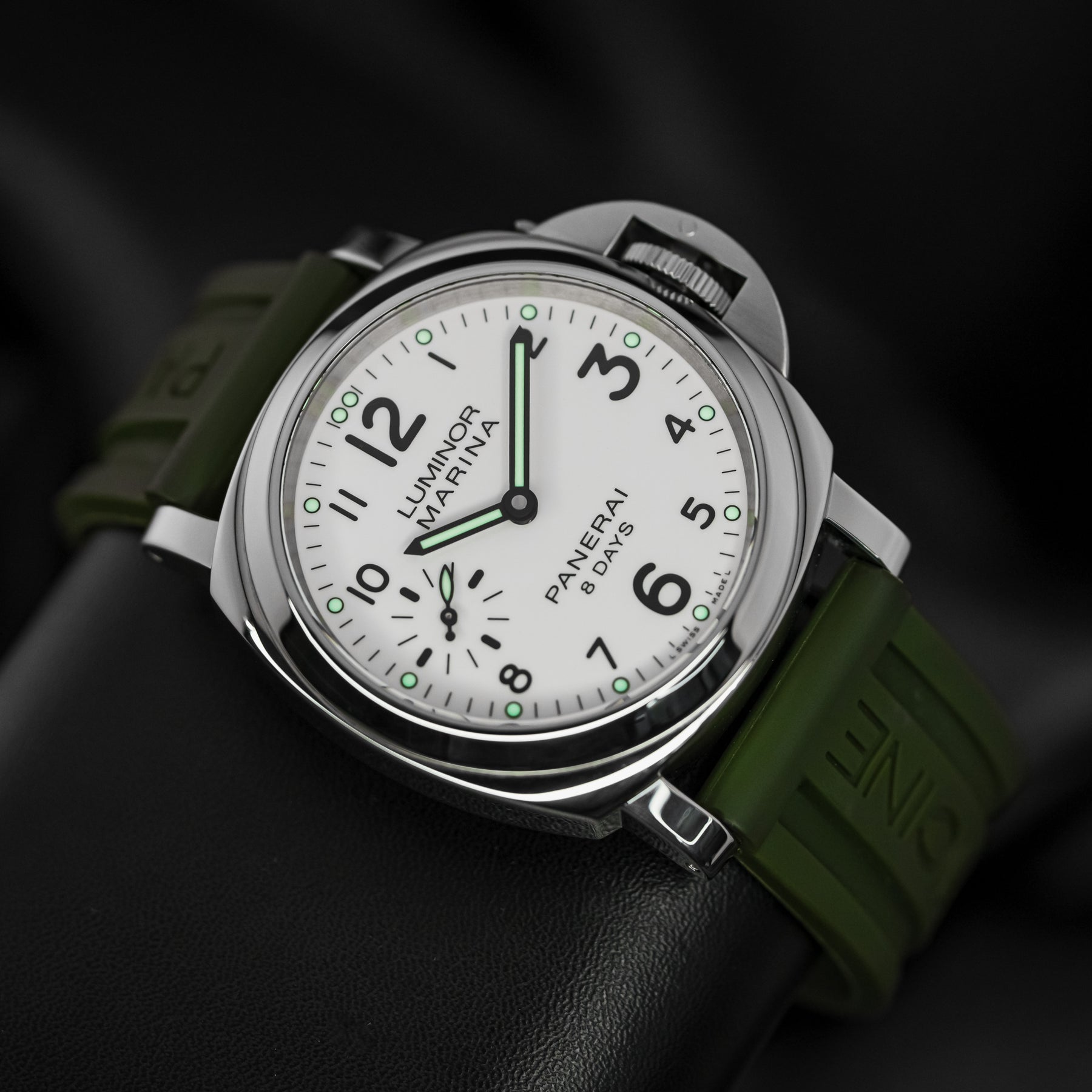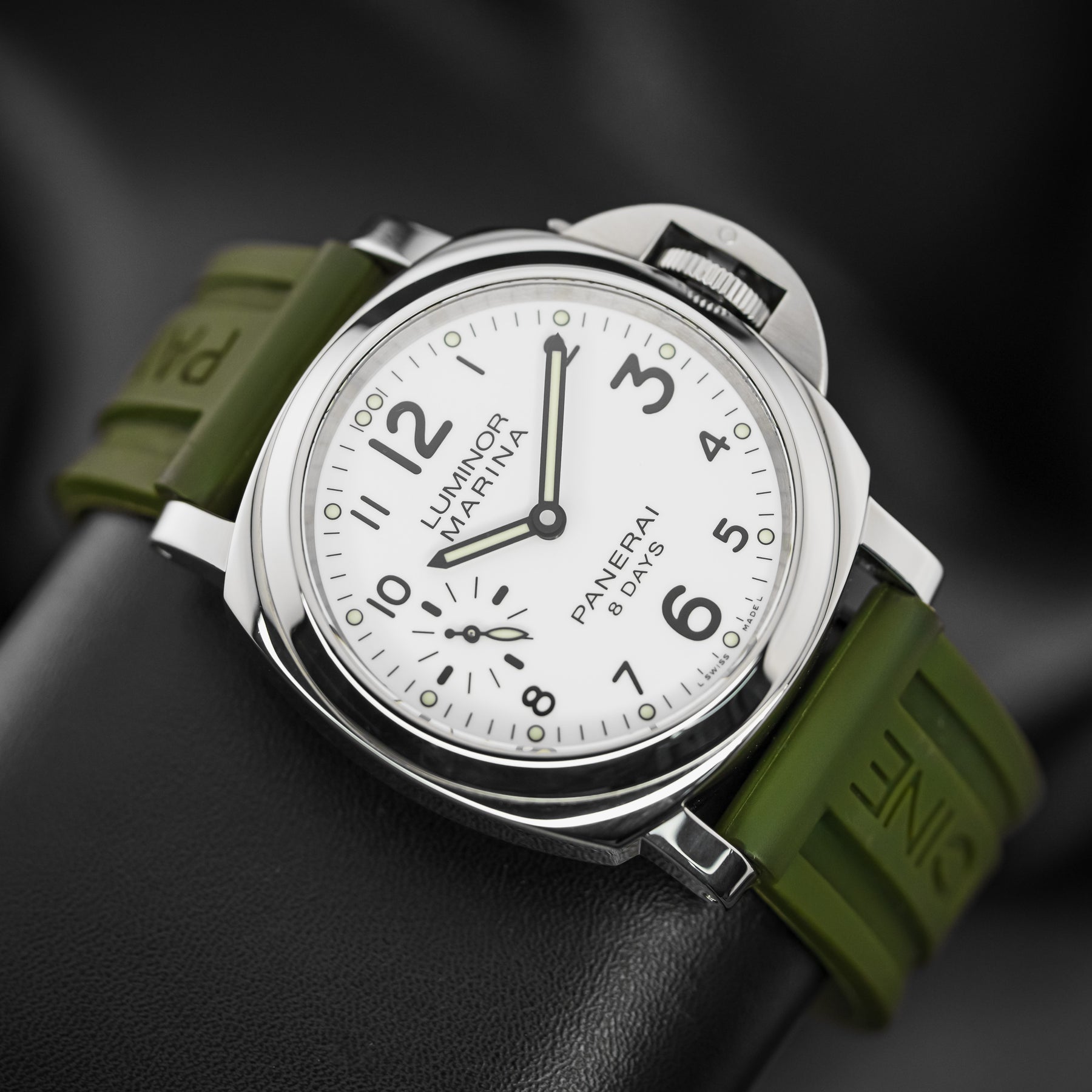 The PAM00563 is a wonderful option for an everyday watch, with almost every feature needed. The vibrant white dial is almost identical to that of the PAM00114, featuring round luminous indices, a matching set of luminous hands, black sausage numerals (with larger twelve, three, six, and nine markers), and a small seconds subdial at 9 o'clock. The 44mm stainless steel case is paired with a beautiful green rubber strap. Powering the PAM00563 is Panerai's in-house Caliber P.5000 mechanical movement with 192 hours of power reserve; the watch's main selling point.