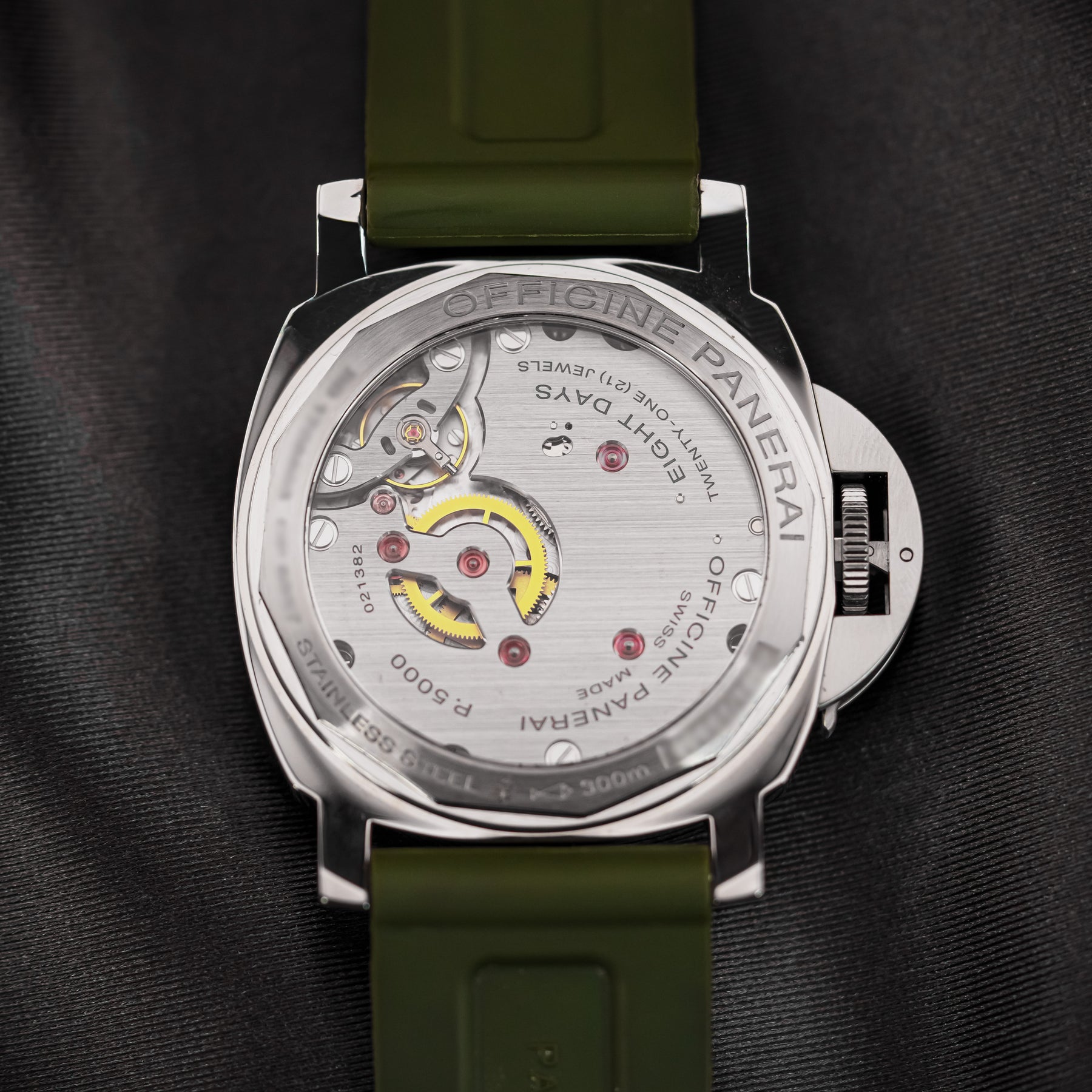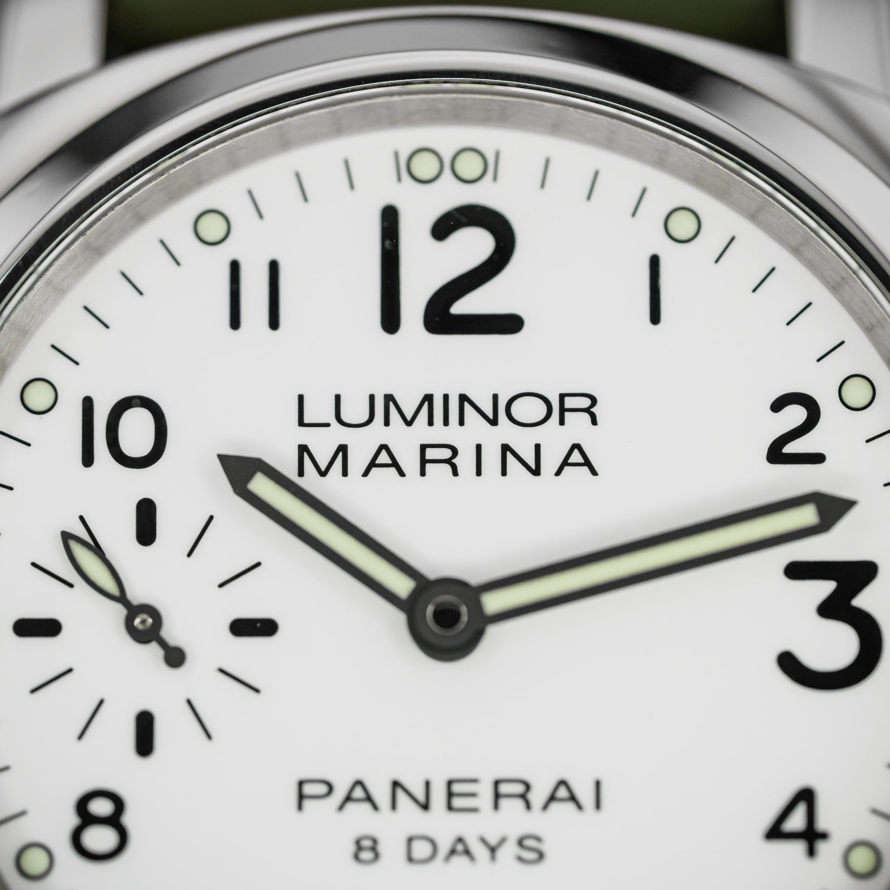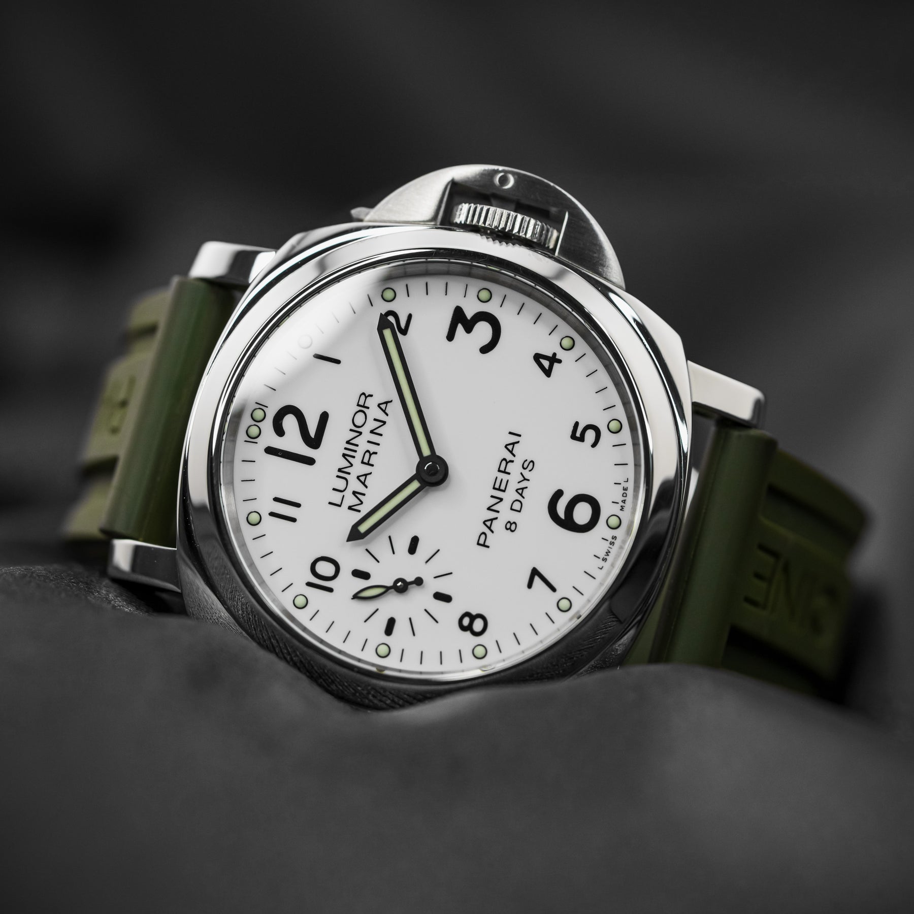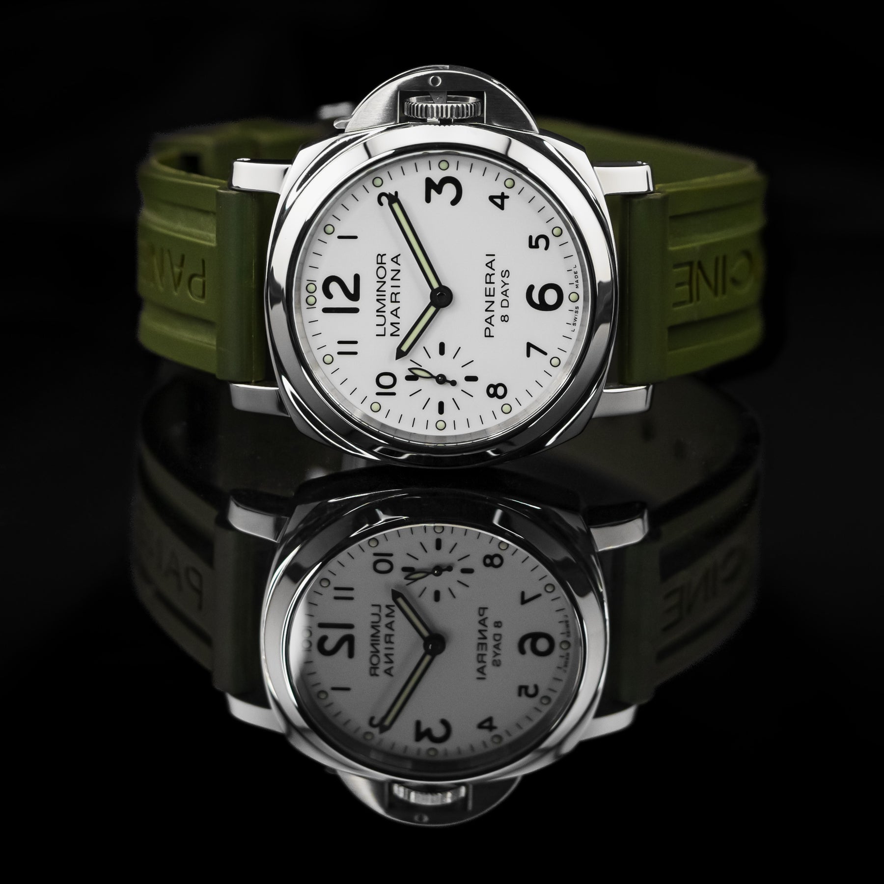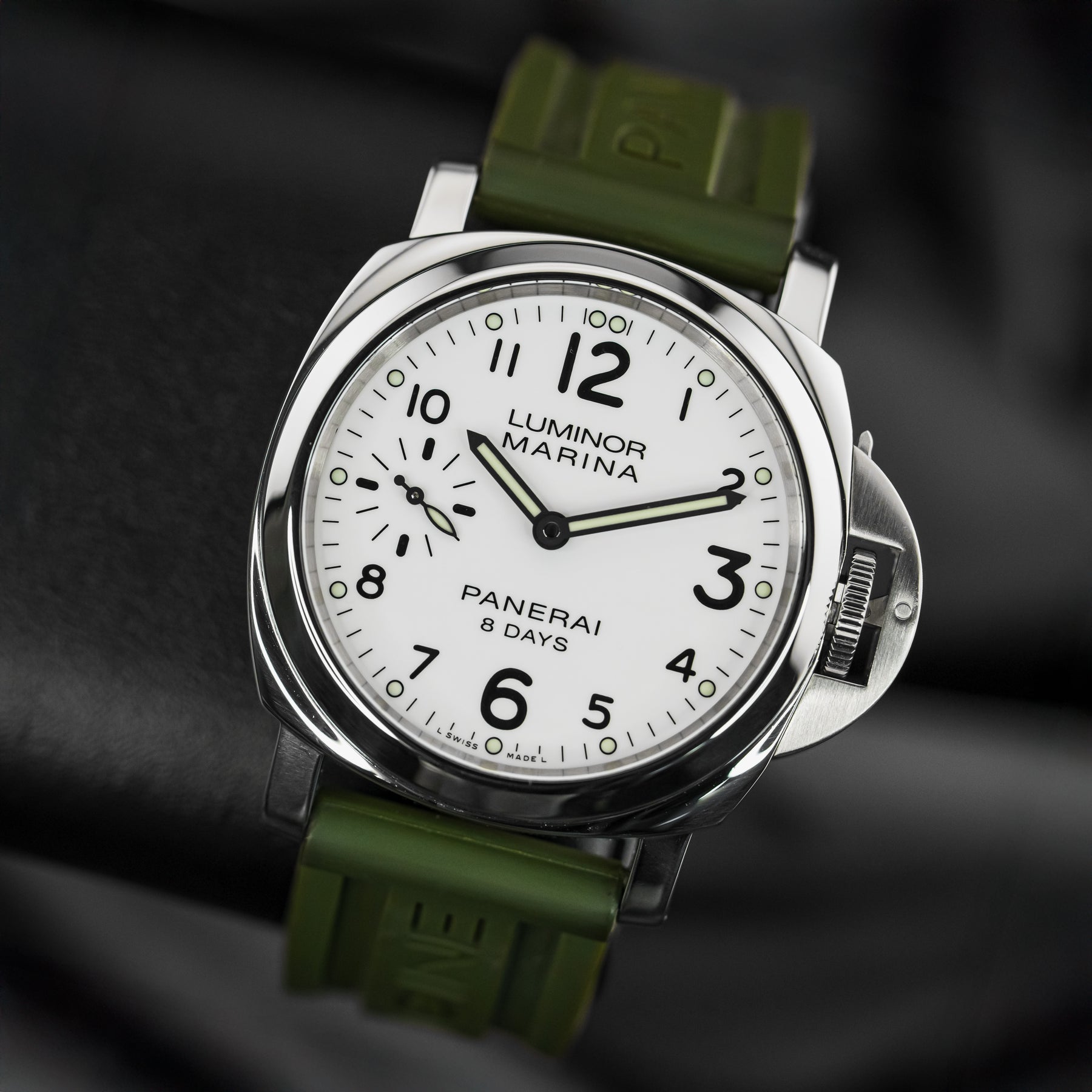 The PAM00563 is a wonderful option for an everyday watch, with almost every feature needed. The vibrant white dial is almost identical to that of the PAM00114, featuring round luminous indices, a matching set of luminous hands, black sausage numerals (with larger twelve, three, six, and nine markers), and a small seconds subdial at 9 o'clock. The 44mm stainless steel case is paired with a beautiful green rubber strap. Powering the PAM00563 is Panerai's in-house Caliber P.5000 mechanical movement with 192 hours of power reserve; the watch's main selling point.