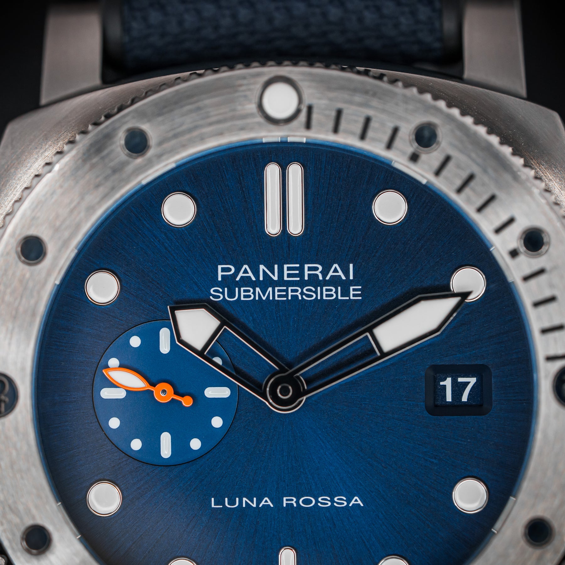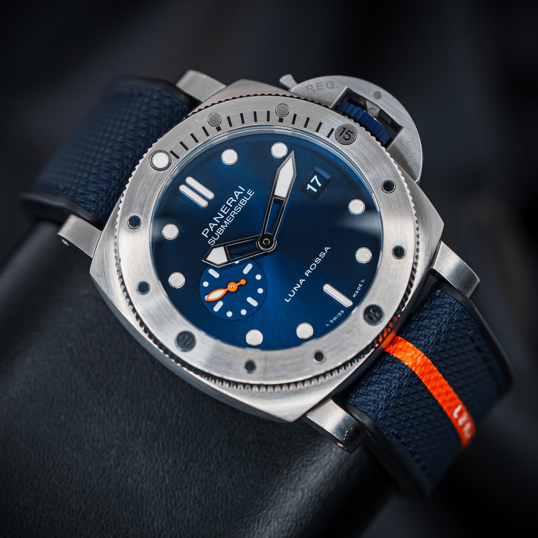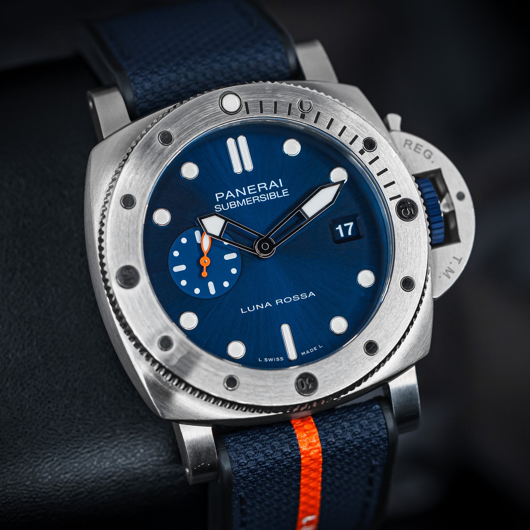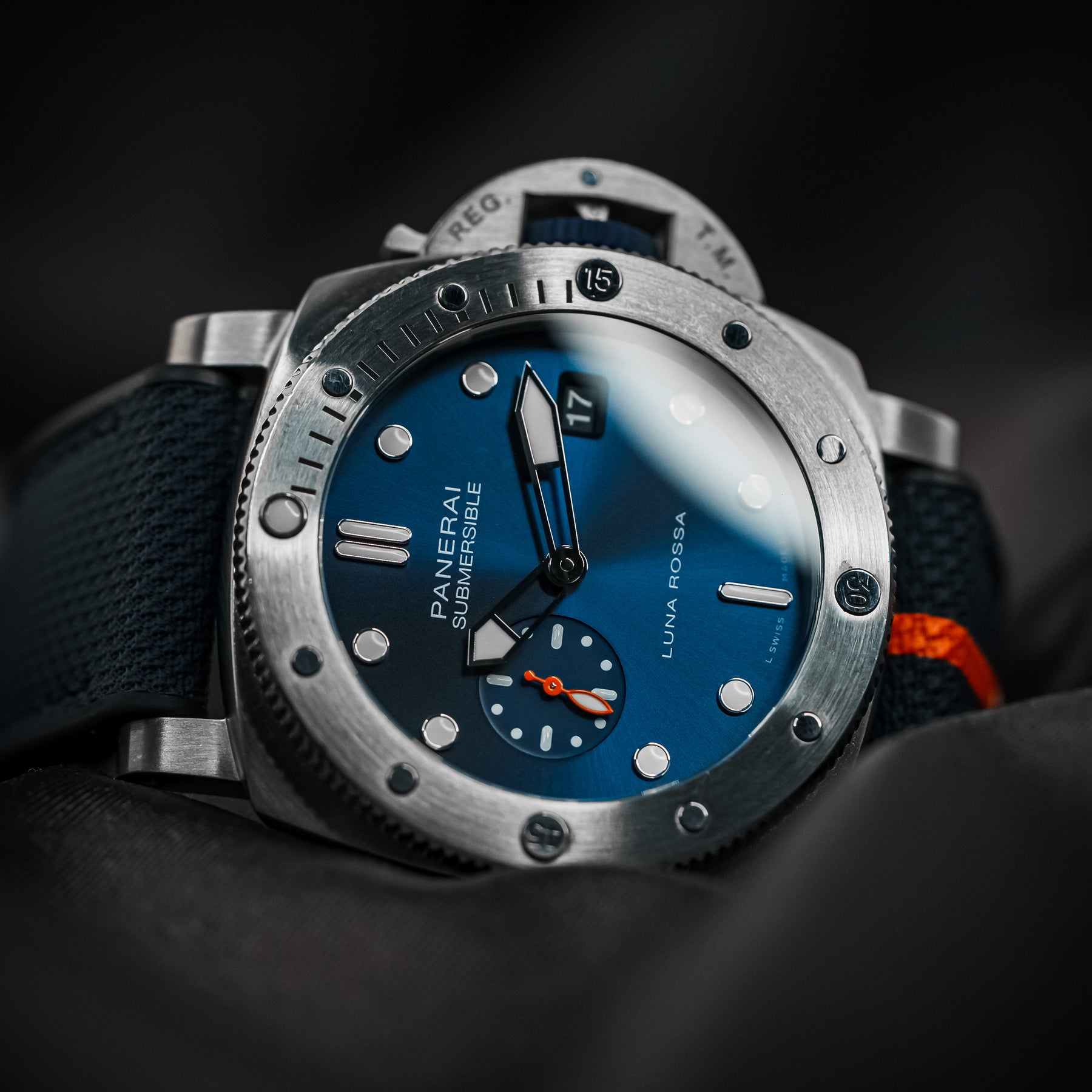 The PAM01391 is a beautiful addition to the ever-popular Luna Rossa line, limited to just 1,500 pieces. It features a 44mm stainless steel case with a unidirectional dive bezel, the classic Luna Rossa textile-rubber strap, and a rubber coated crown for easy grip. The dial has a gorgeous sunburst blue finish, as well as a date window at 3 o'clock a small seconds subdial at 9 o'clock with a contrasting red seconds hand. Powering the PAM01391 is Panerai's in-house Caliber P.900 automatic movement (based on Panerai's Caliber OPXXXIV) with 72 hours of power reserve.