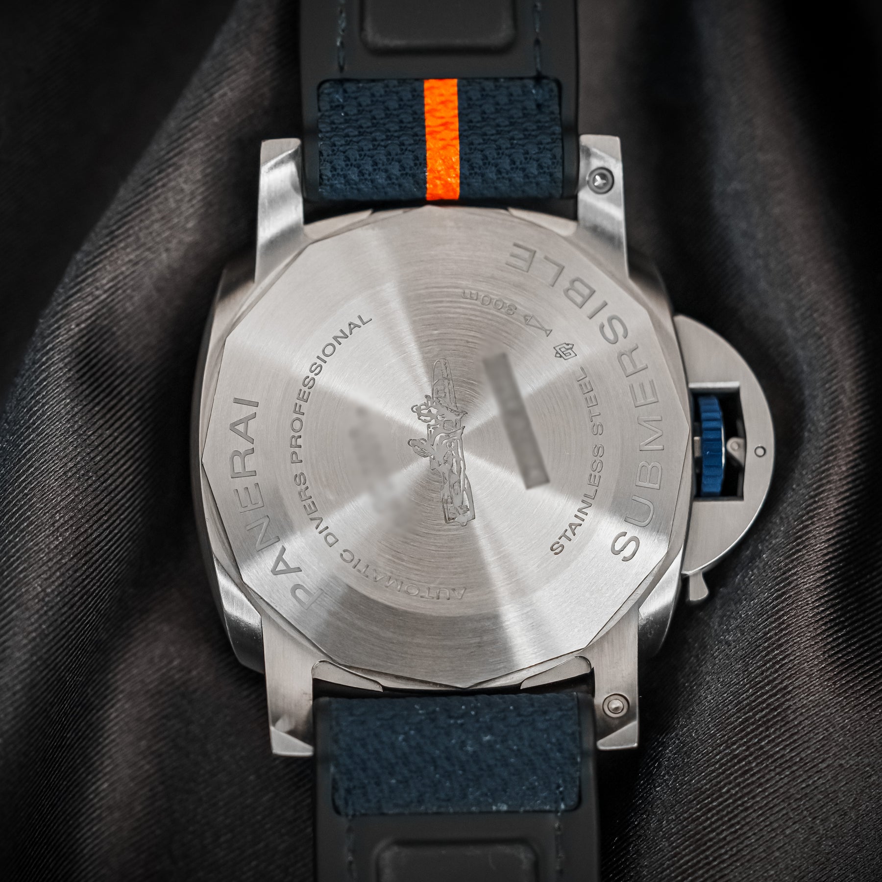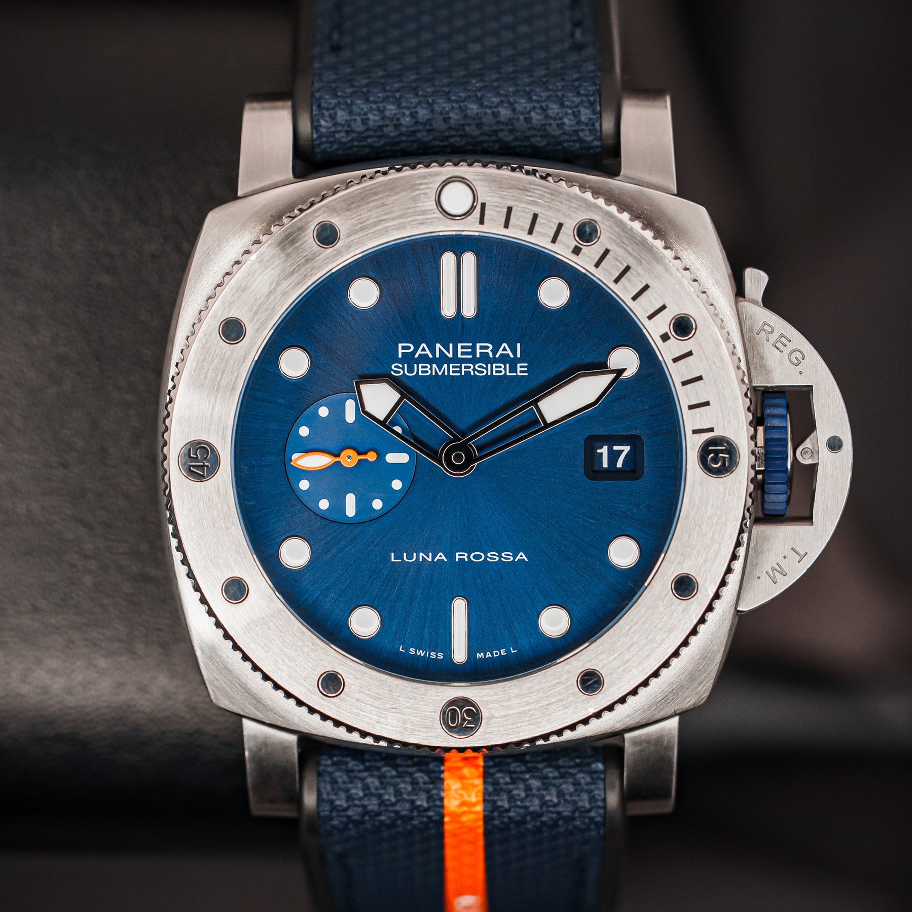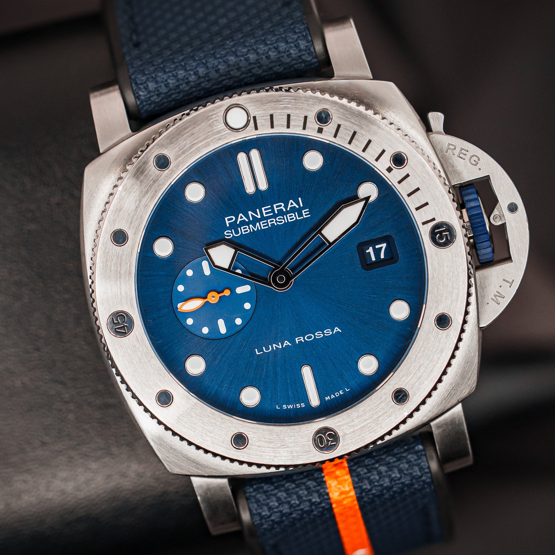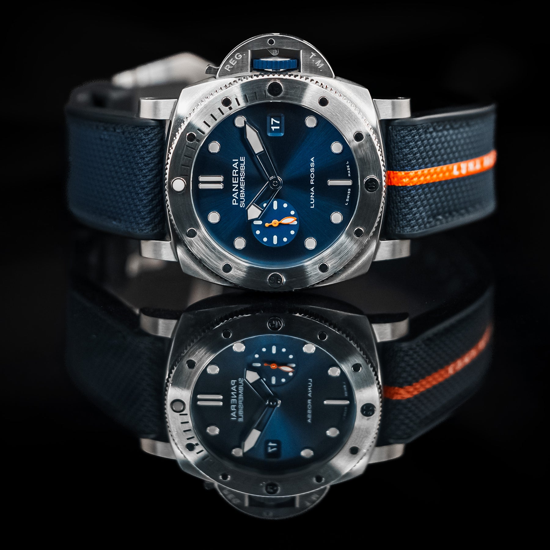 The PAM01391 is a beautiful addition to the ever-popular Luna Rossa line, limited to just 1,500 pieces. It features a 44mm stainless steel case with a unidirectional dive bezel, the classic Luna Rossa textile-rubber strap, and a rubber coated crown for easy grip. The dial has a gorgeous sunburst blue finish, as well as a date window at 3 o'clock a small seconds subdial at 9 o'clock with a contrasting red seconds hand. Powering the PAM01391 is Panerai's in-house Caliber P.900 automatic movement (based on Panerai's Caliber OPXXXIV) with 72 hours of power reserve.