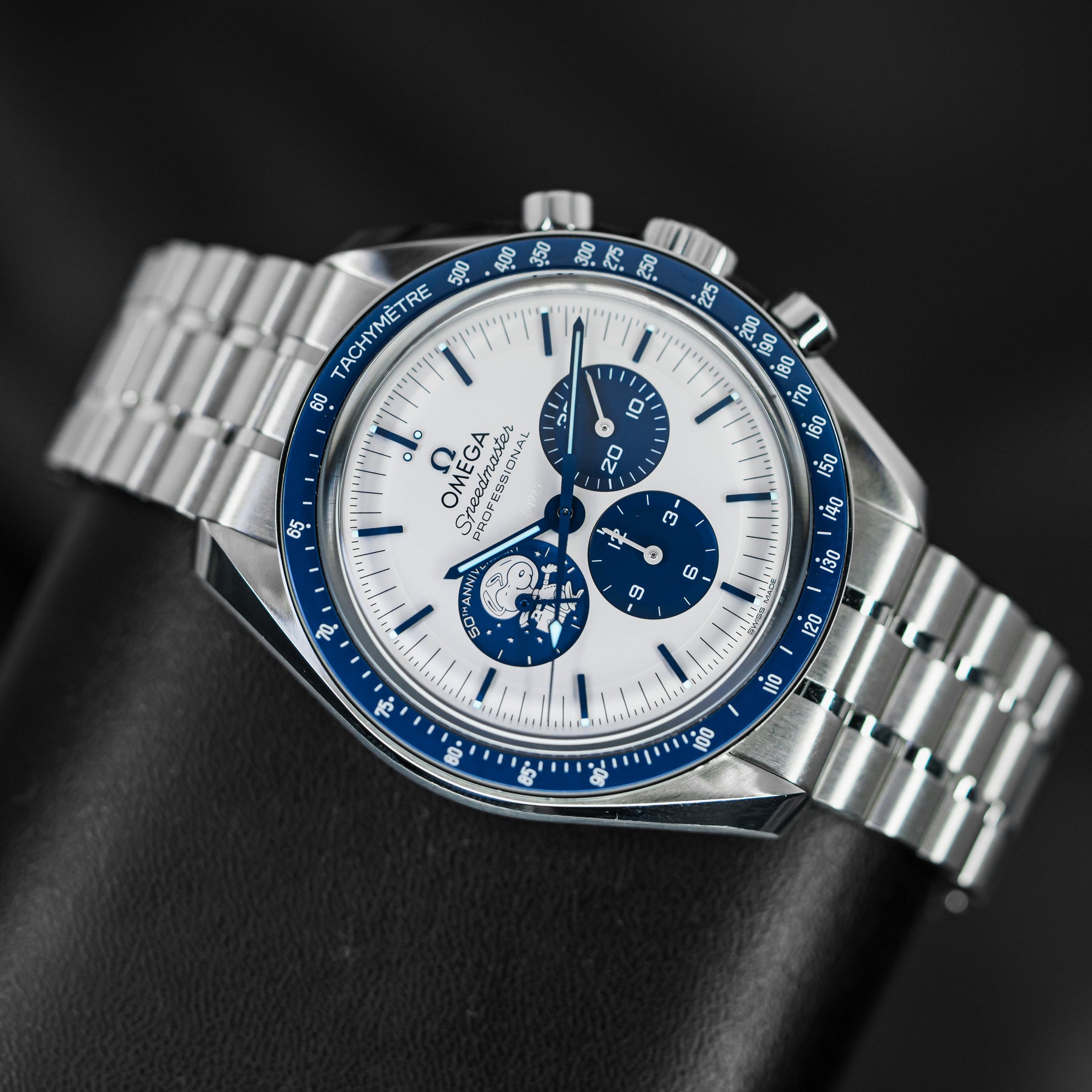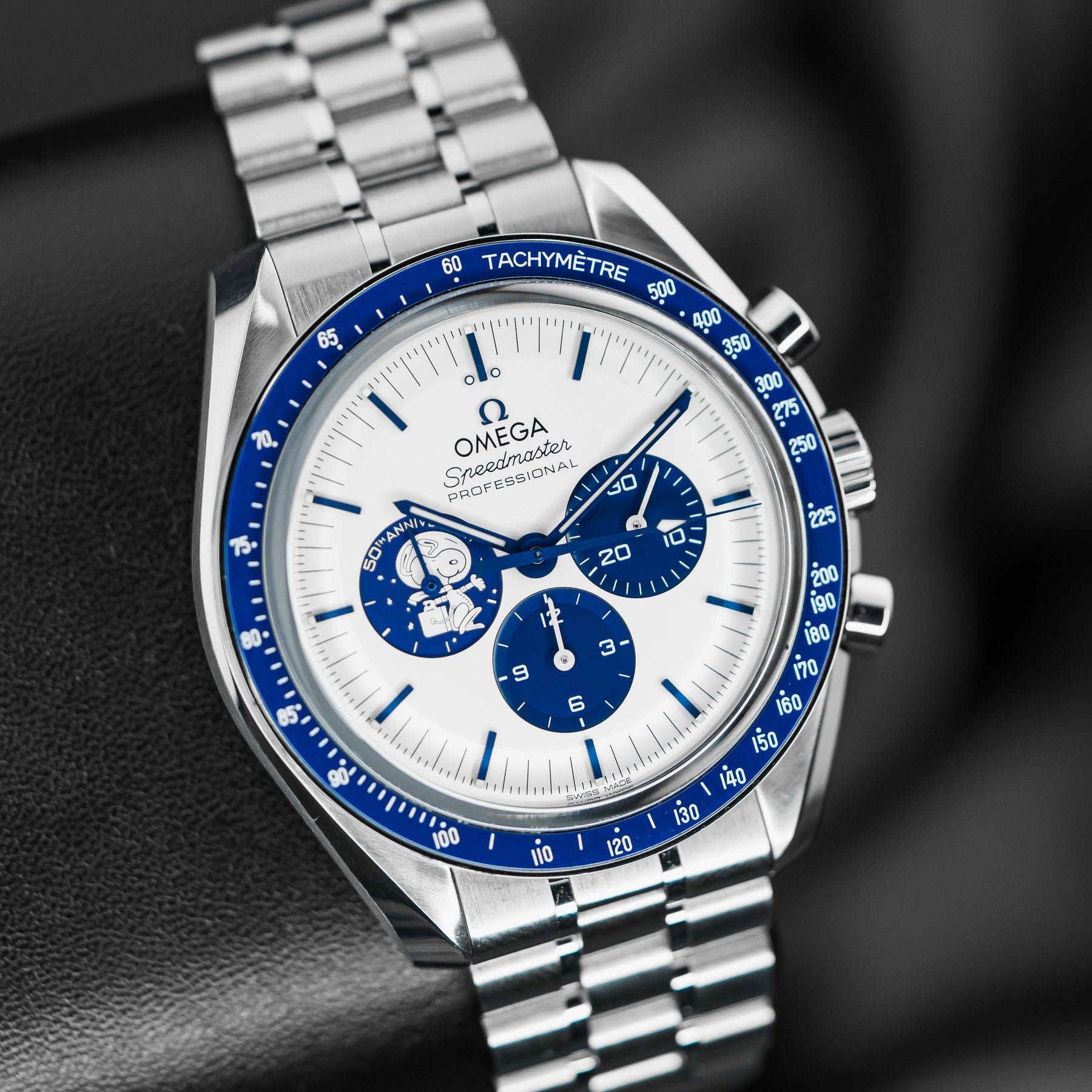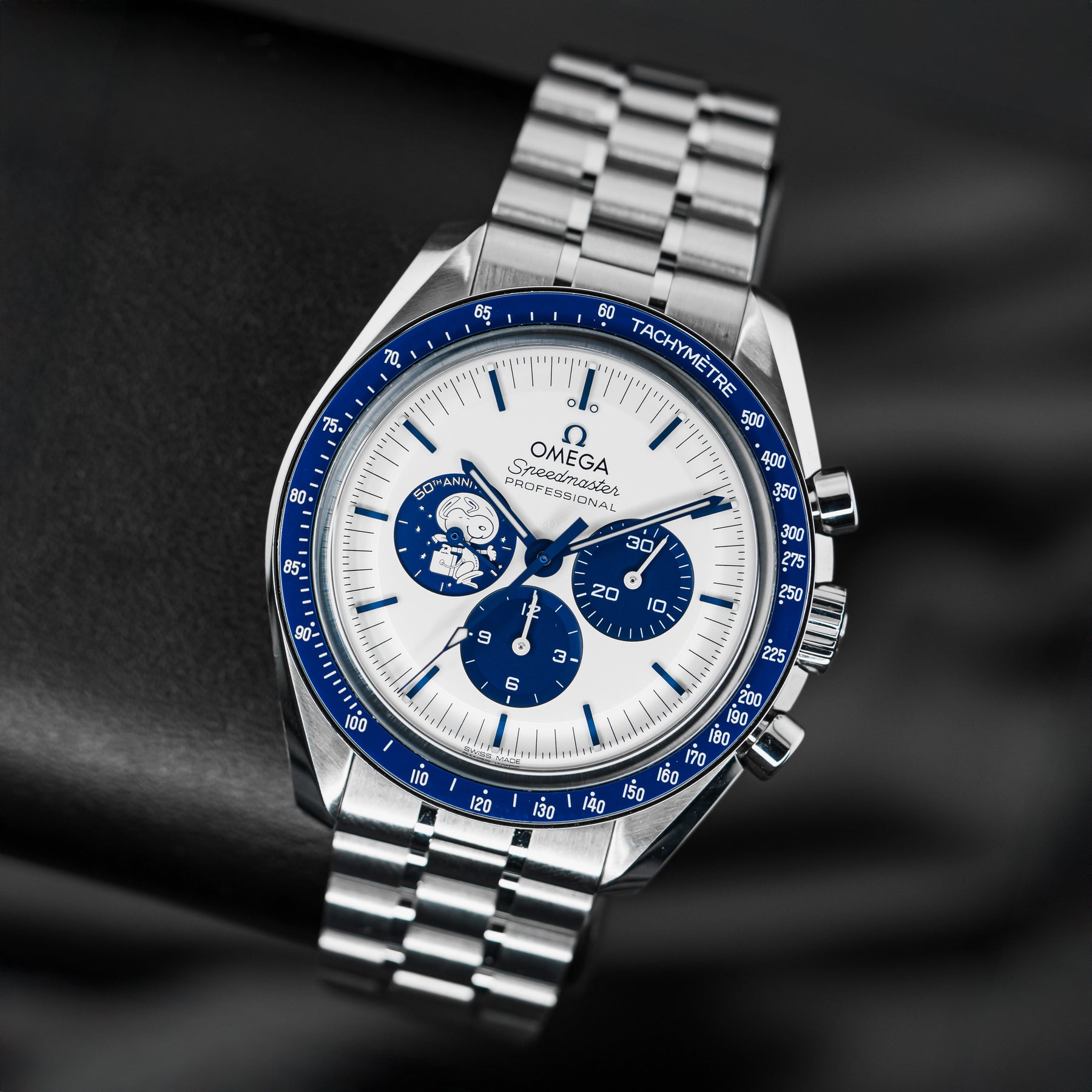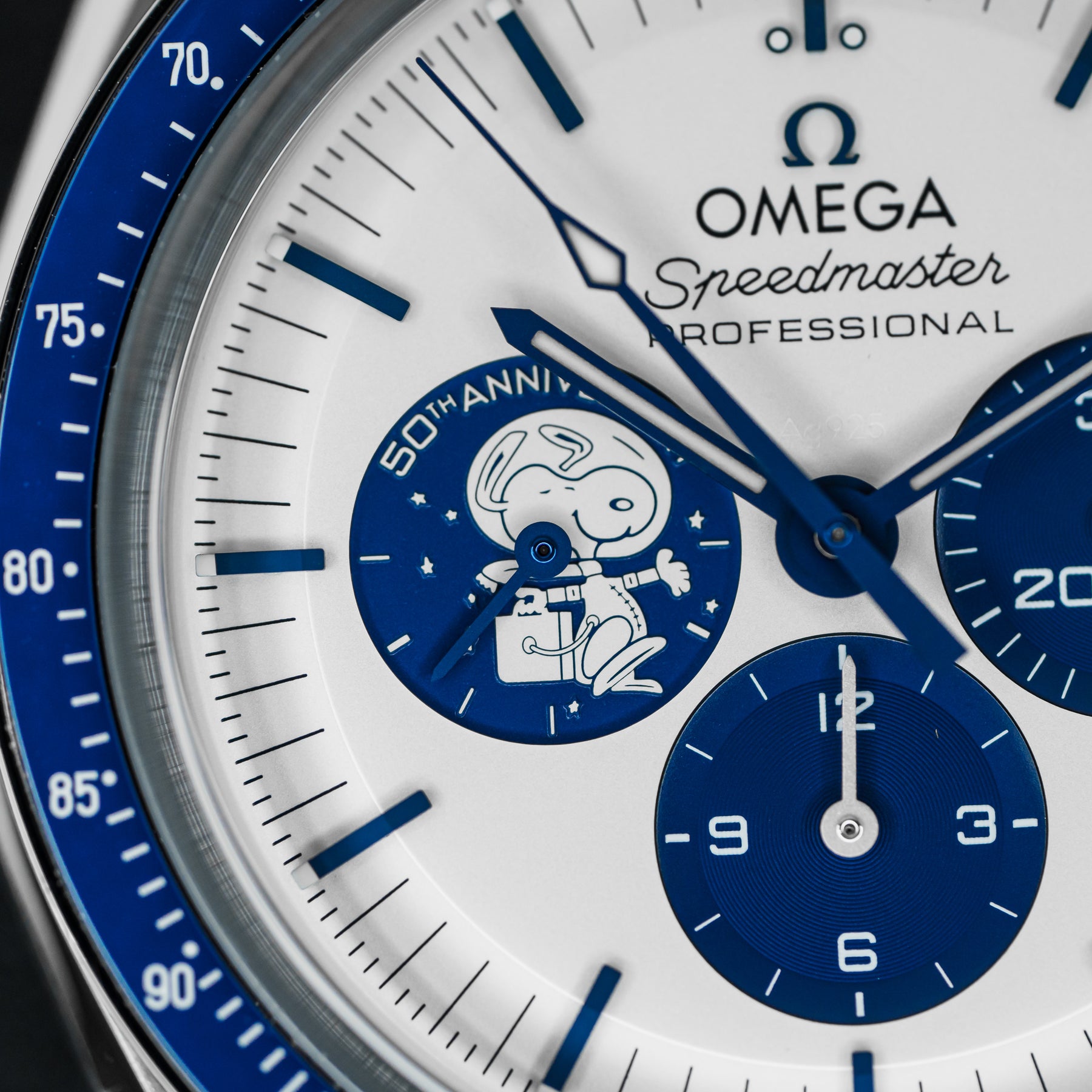 The Omega Speedmaster Silver Snoopy is a stunning 50th Anniversary tribute to the Apollo 13 mission in 1970. As one of the most desirable Omegas to date, the Snoopy features a stainless steel case with a ceramic bezel insert and a white dial with contrasting blue indices and matching subdials. Both the 9 o'clock subdial and sapphire caseback feature images of Snoopy as a tribute to the Silver Snoopy Award. This model comes on Omega's high quality fabric strap, making it durable and comfortable. Powering the Snoopy is Omega's in-house Caliber 3861 mechanical movement with 50 hours of power reserve.