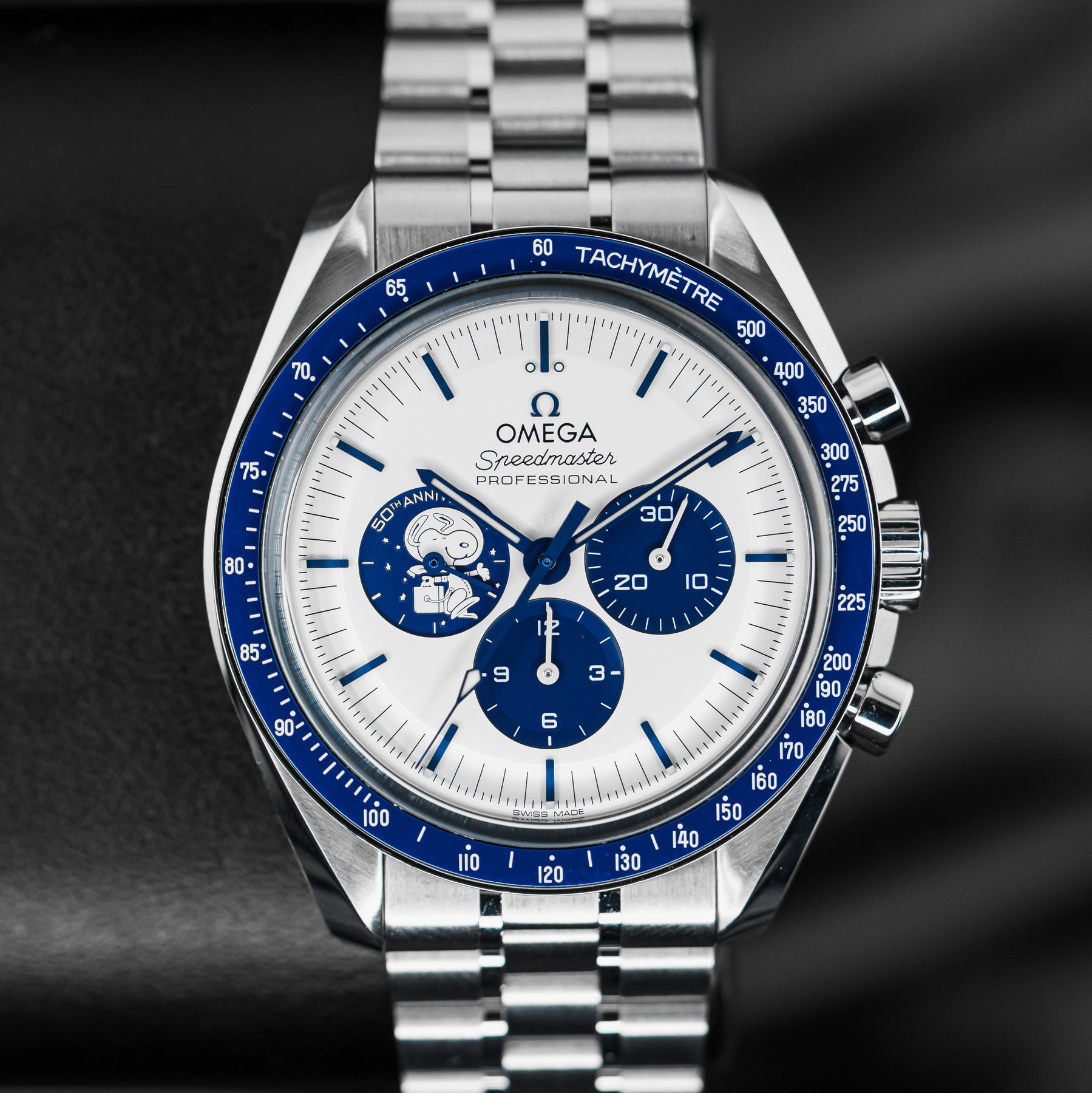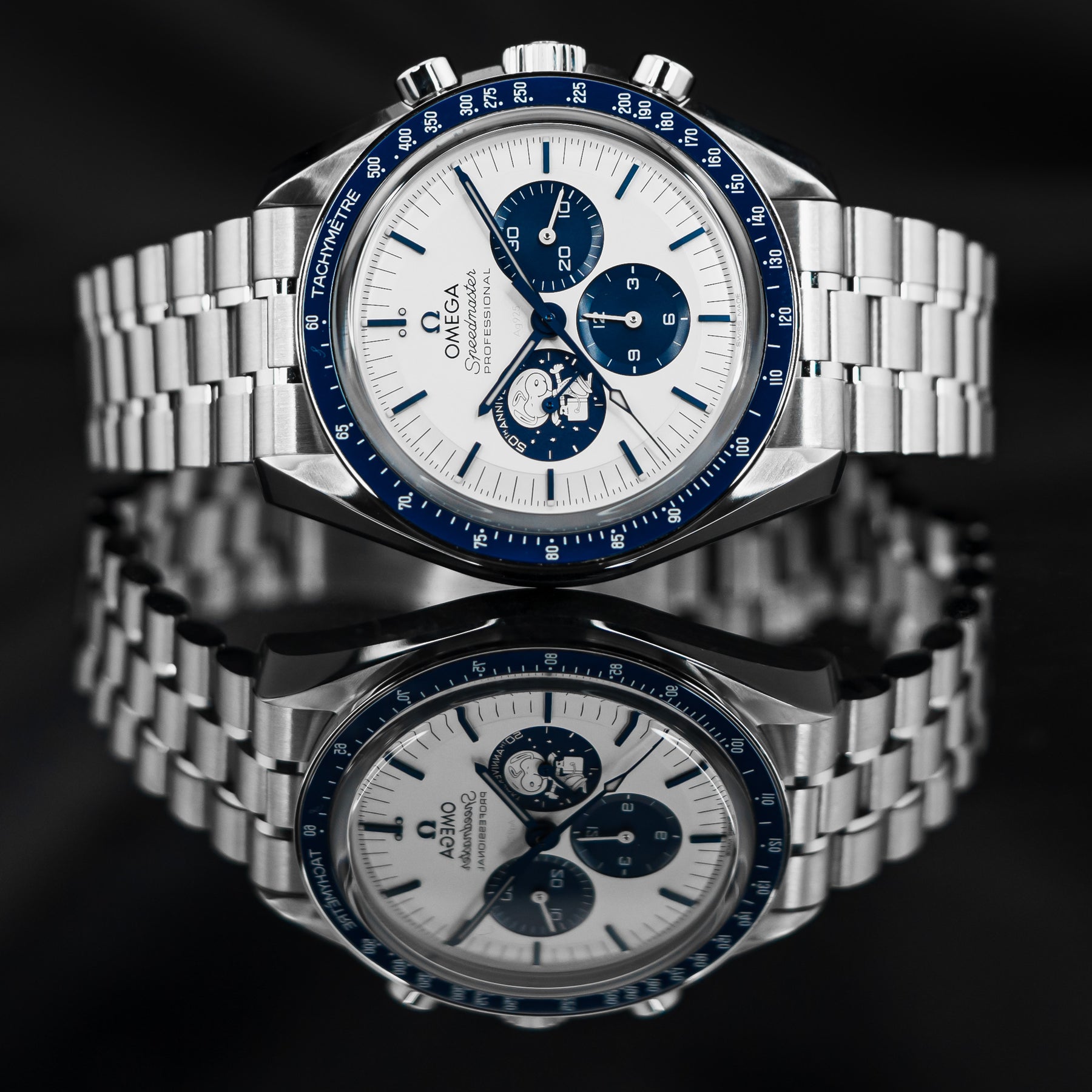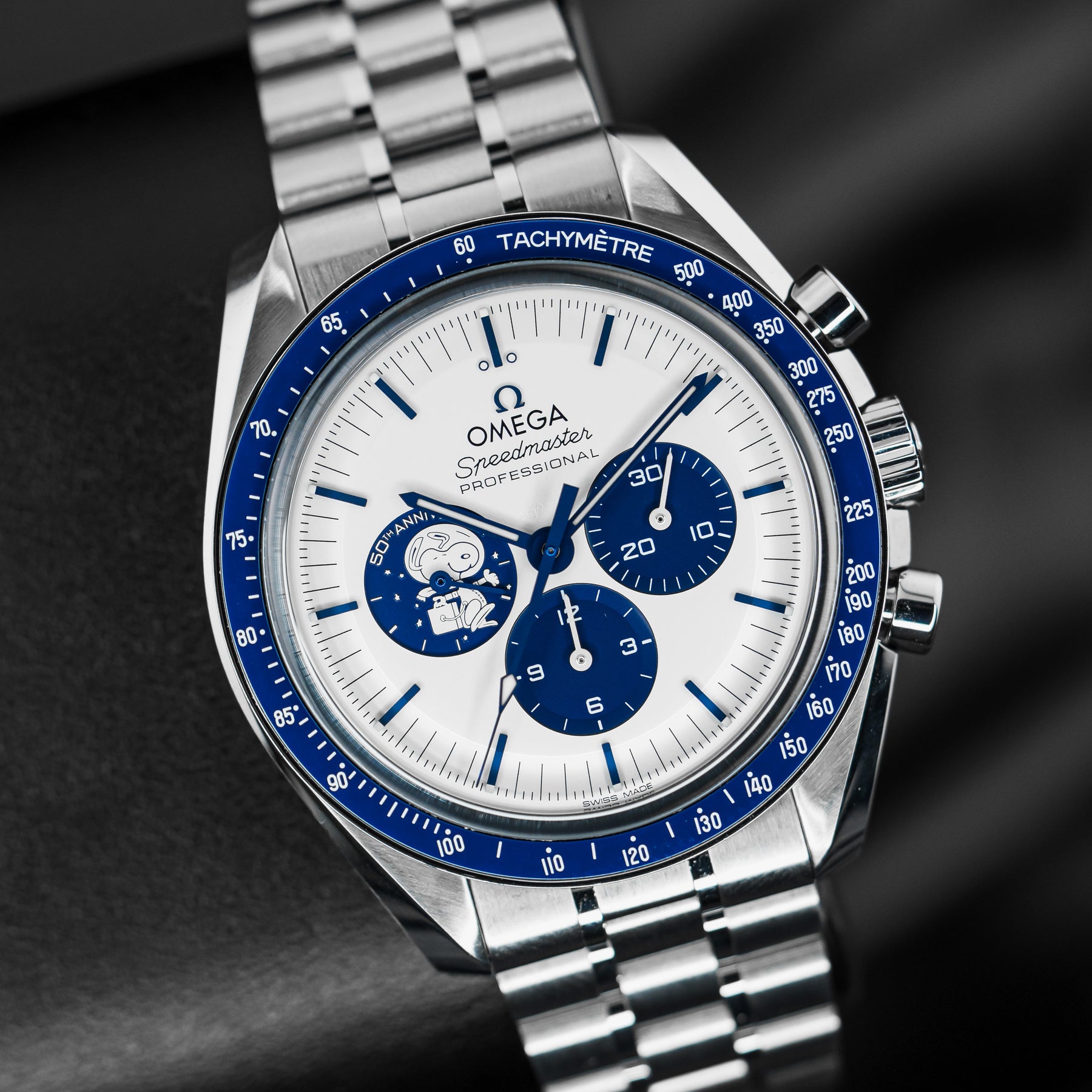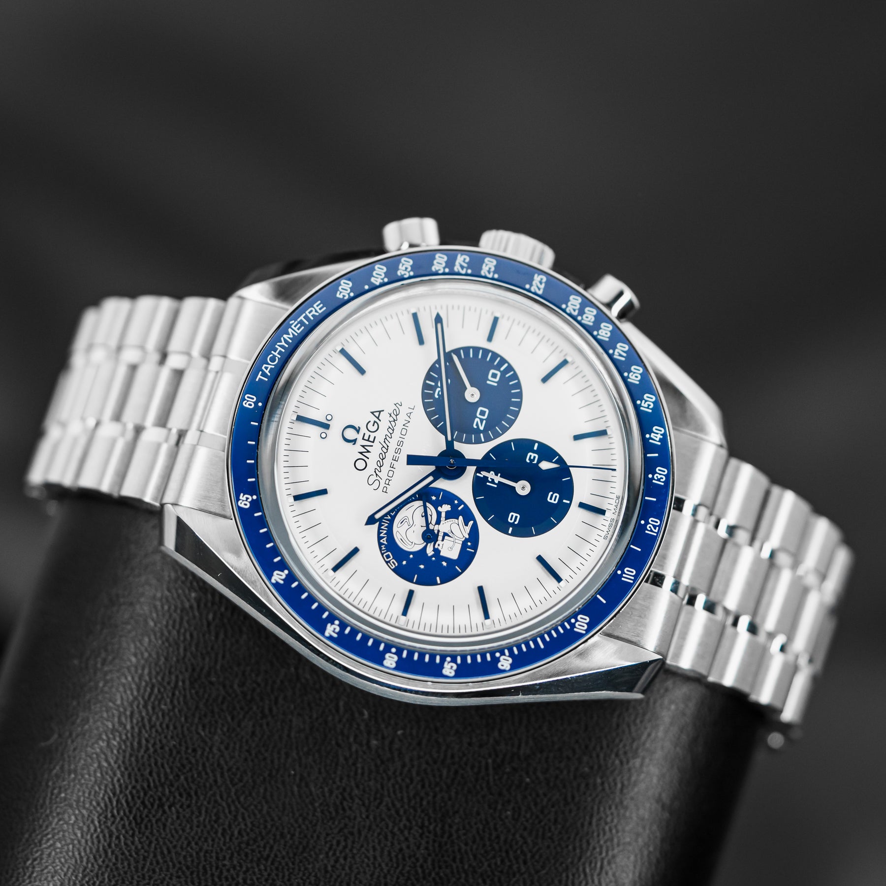 The Omega Speedmaster Silver Snoopy is a stunning 50th Anniversary tribute to the Apollo 13 mission in 1970. As one of the most desirable Omegas to date, the Snoopy features a stainless steel case with a ceramic bezel insert and a white dial with contrasting blue indices and matching subdials. Both the 9 o'clock subdial and sapphire caseback feature images of Snoopy as a tribute to the Silver Snoopy Award. This model comes on Omega's high quality fabric strap, making it durable and comfortable. Powering the Snoopy is Omega's in-house Caliber 3861 mechanical movement with 50 hours of power reserve.