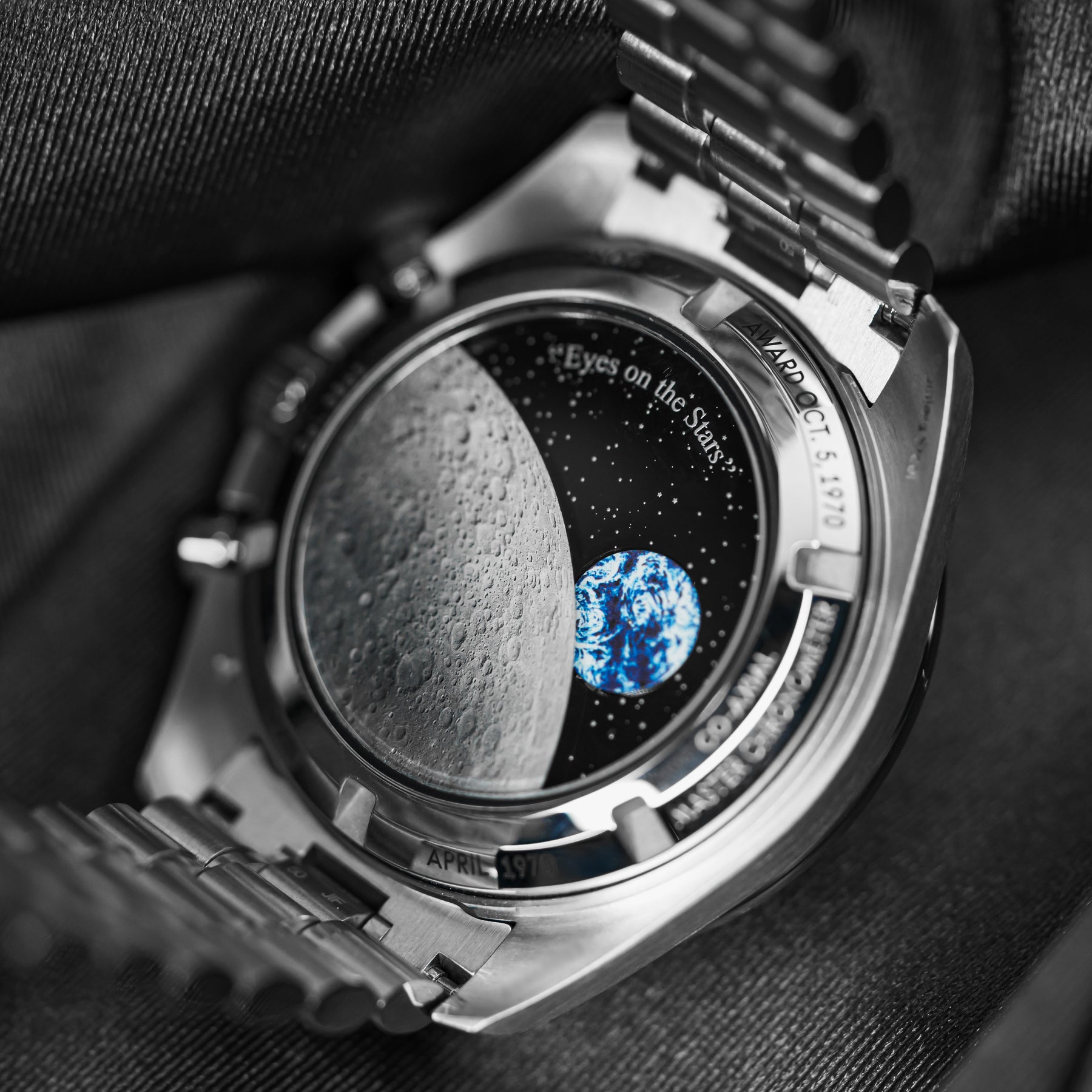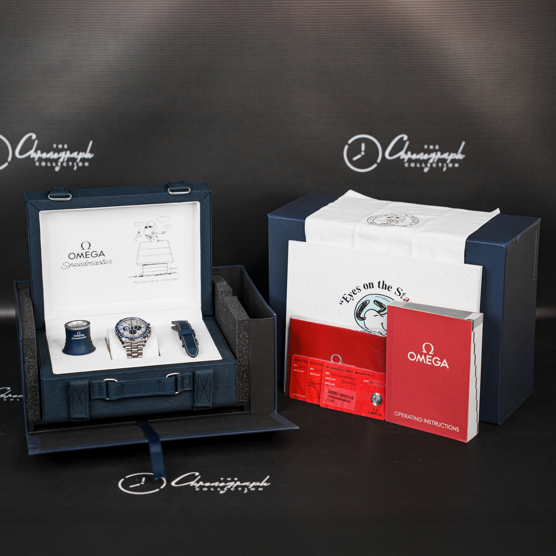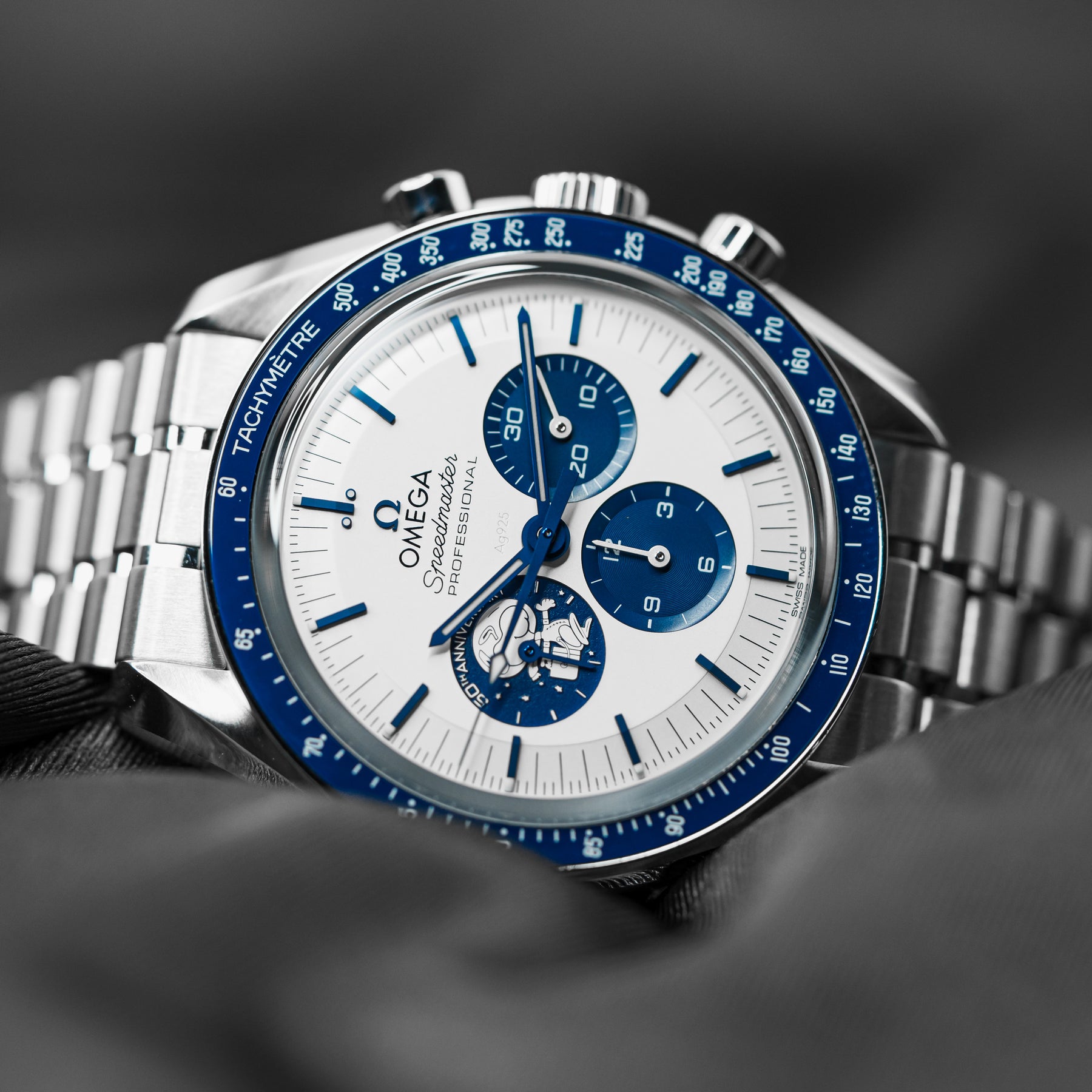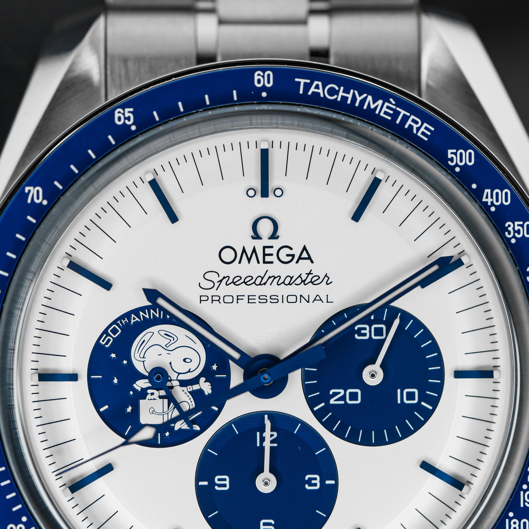 The Omega Speedmaster Silver Snoopy is a stunning 50th Anniversary tribute to the Apollo 13 mission in 1970. As one of the most desirable Omegas to date, the Snoopy features a stainless steel case with a ceramic bezel insert and a white dial with contrasting blue indices and matching subdials. Both the 9 o'clock subdial and sapphire caseback feature images of Snoopy as a tribute to the Silver Snoopy Award. This model comes on Omega's high quality fabric strap, making it durable and comfortable. Powering the Snoopy is Omega's in-house Caliber 3861 mechanical movement with 50 hours of power reserve.