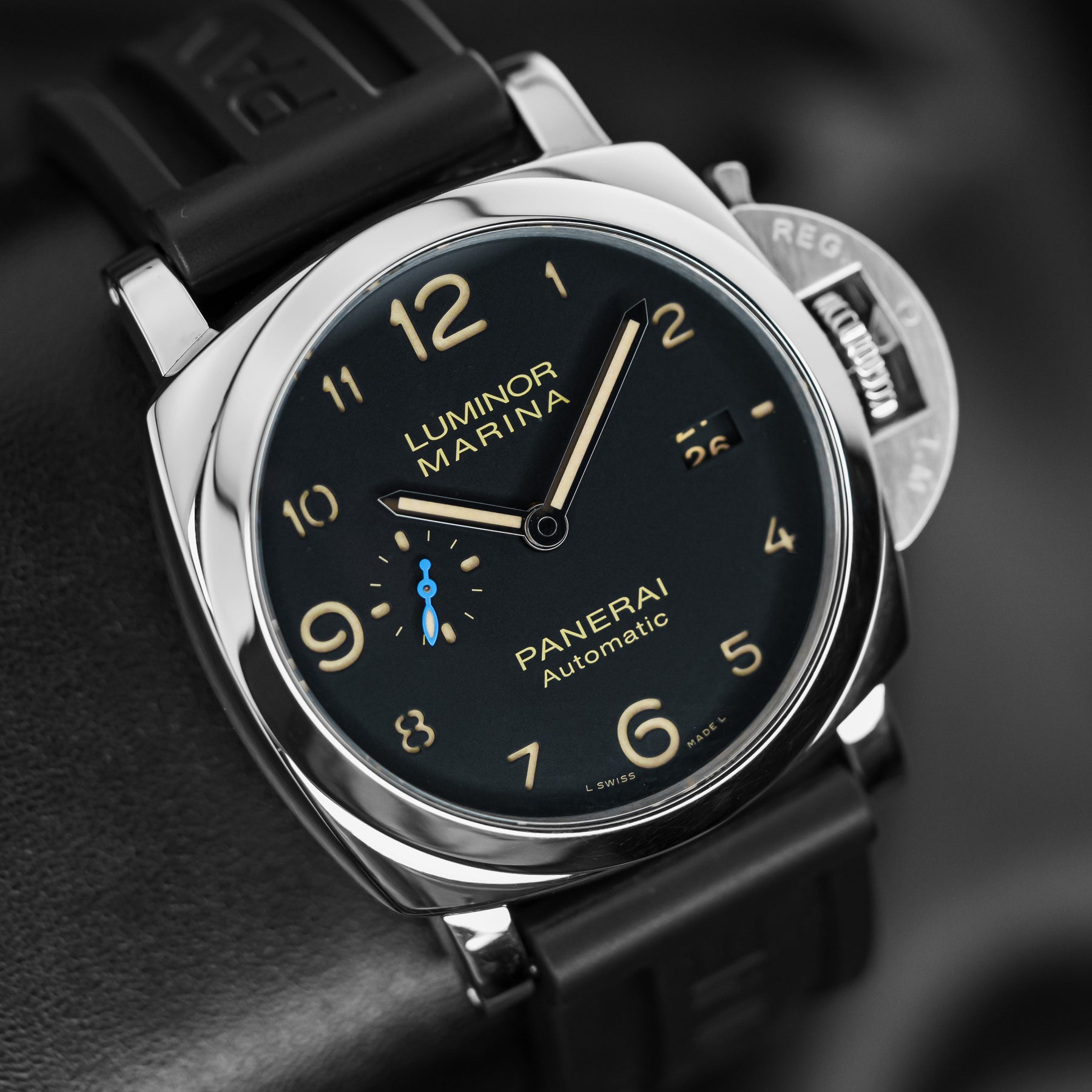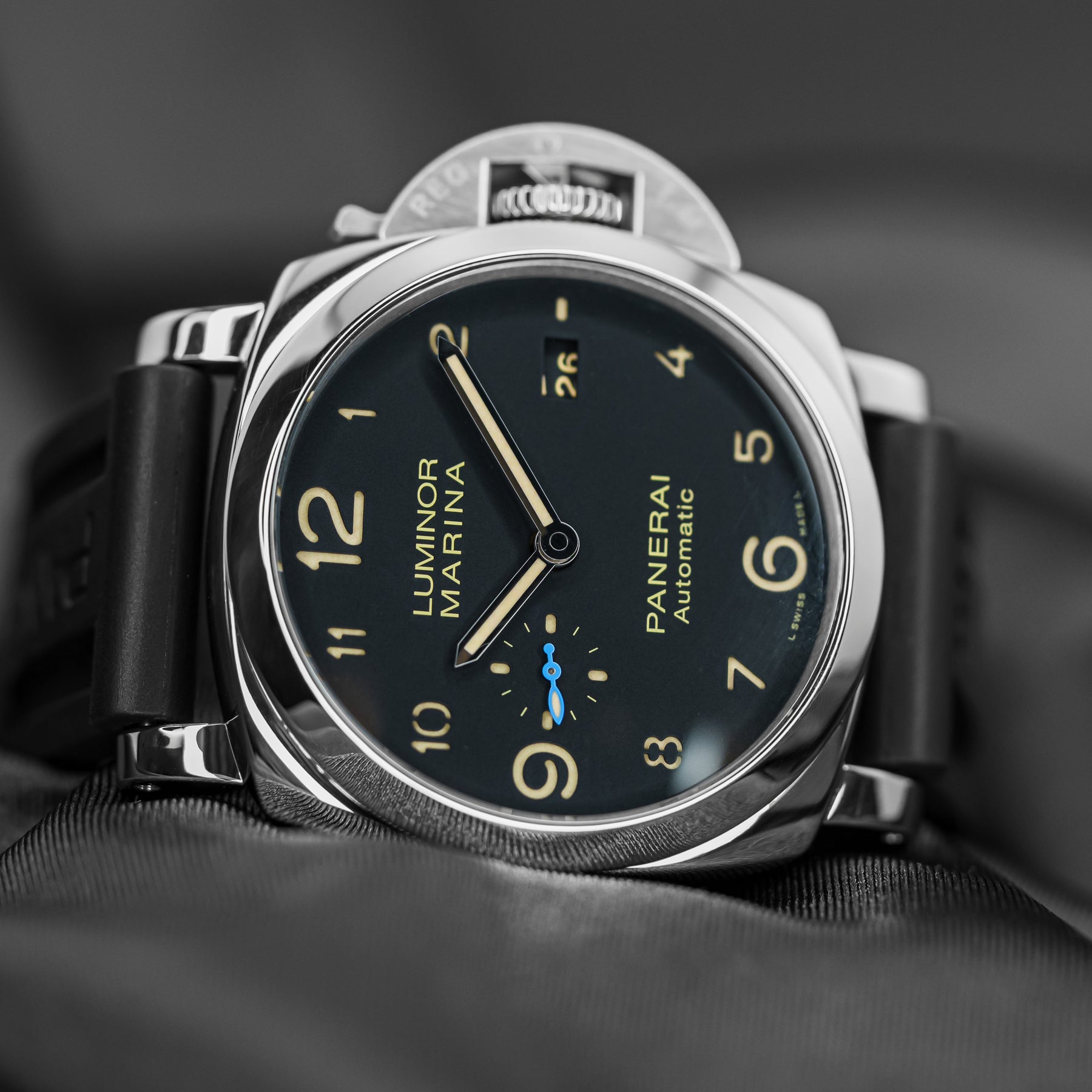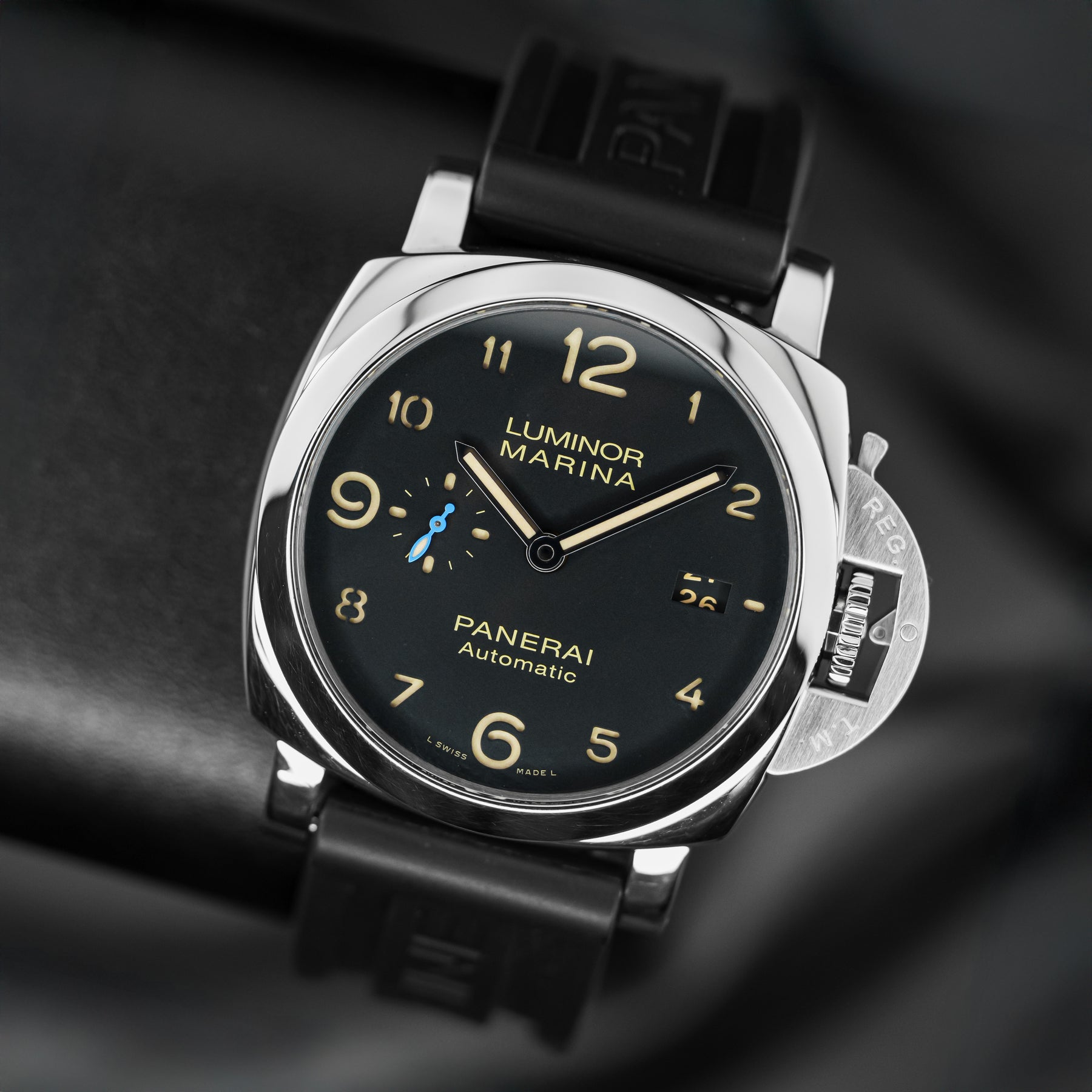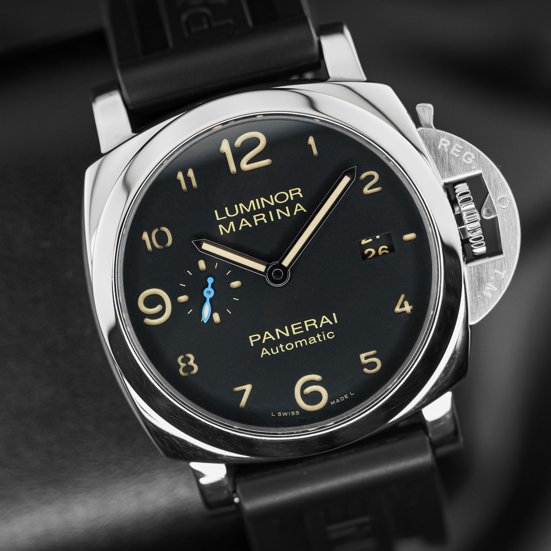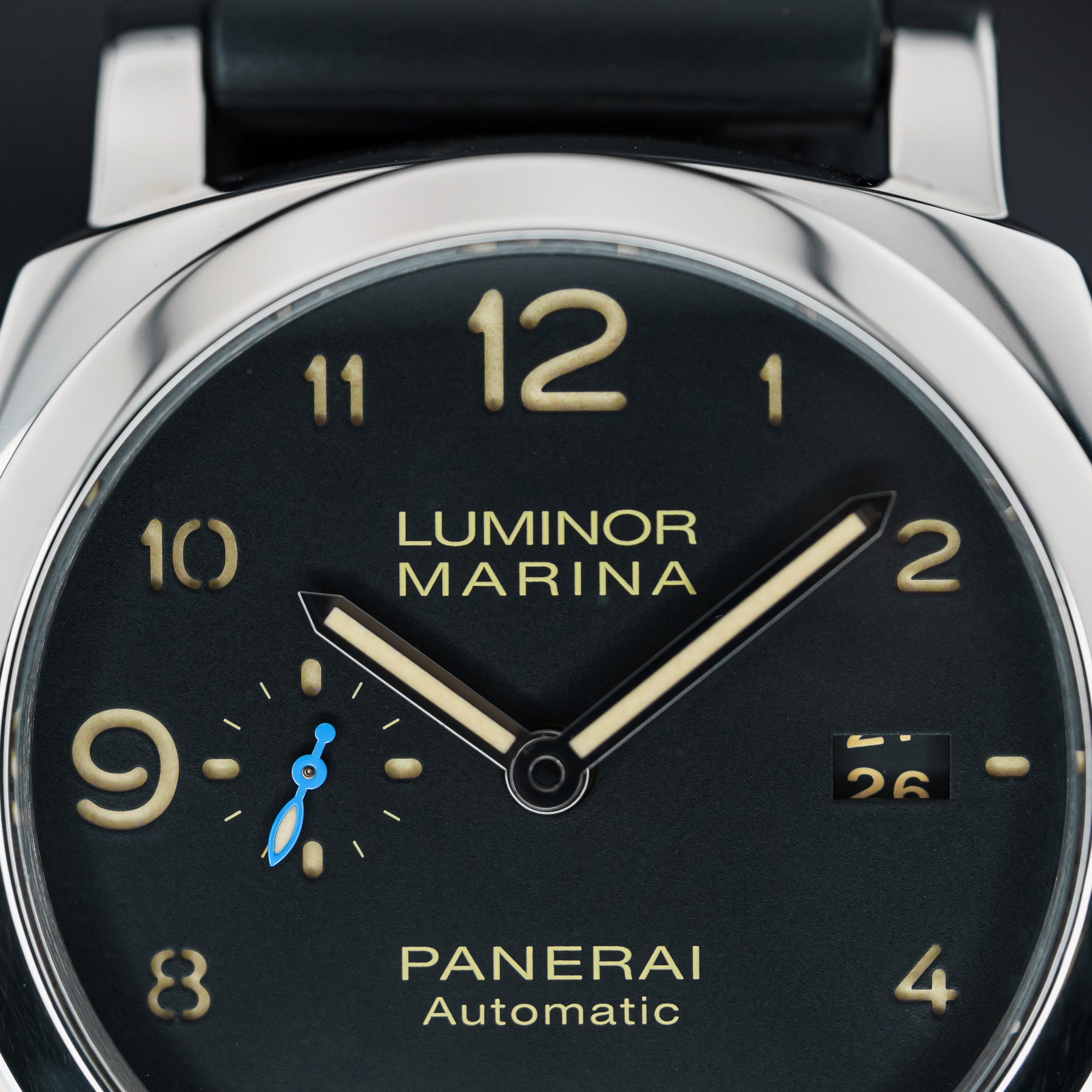 The PAM01359 is classic, conservative, and versatile. The black dial features beige sandwich indices, a small seconds subdial at 9 o'clock with a blue hand, and a date window at 3 o'clock. It also features enlarged 12, 6, and 9 indices for the sake of proportion and legibility. The case is made from stainless steel and measures 44mm in diameter, housing Panerai's in-house Caliber P.9010 automatic movement with 72 hours of power reserve.