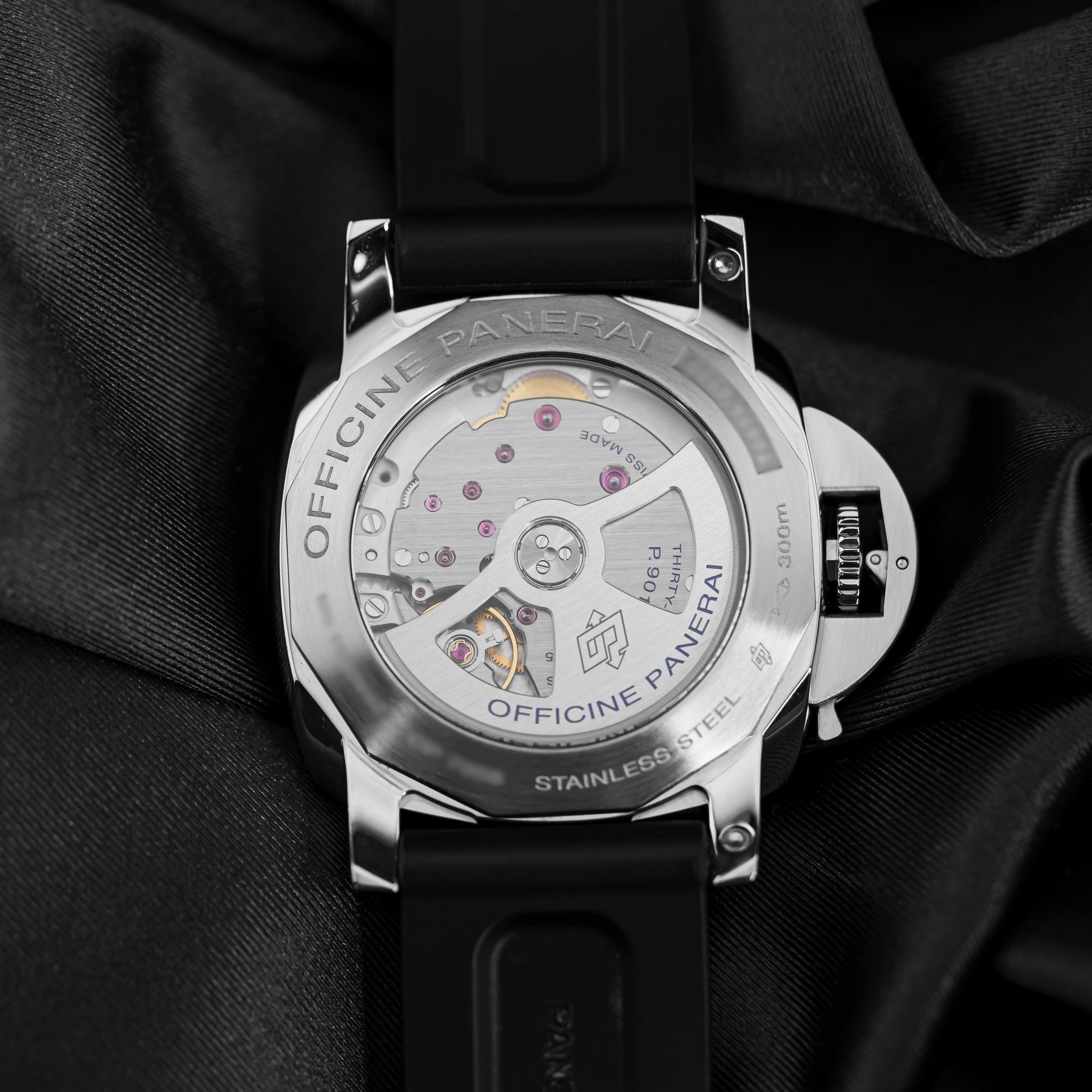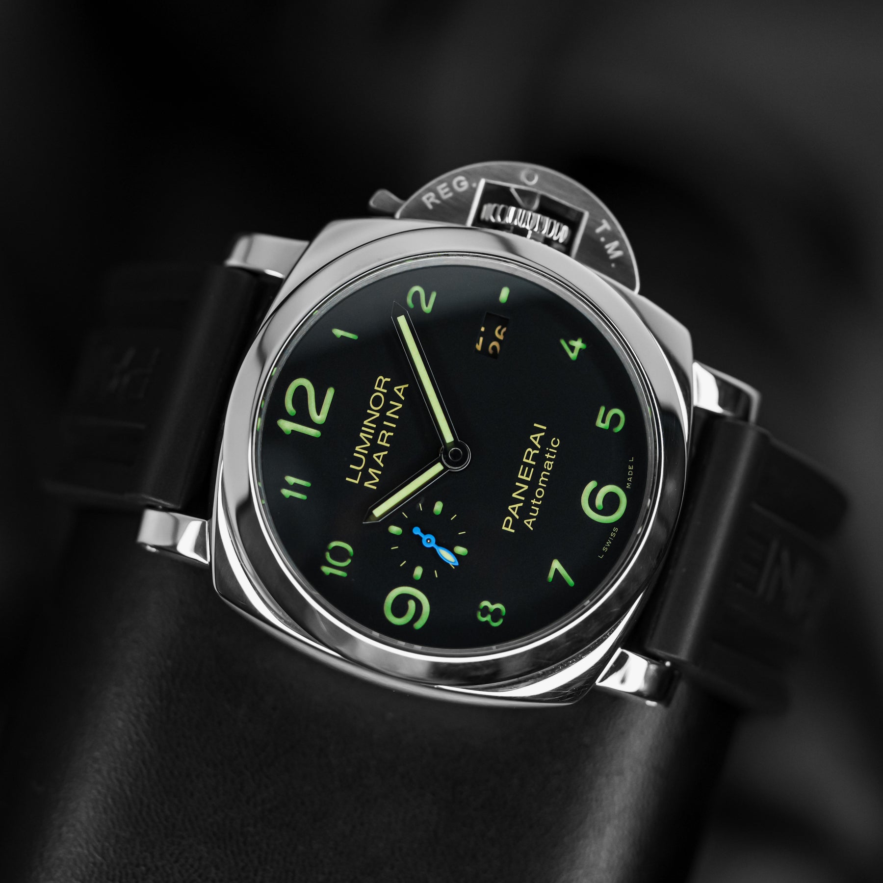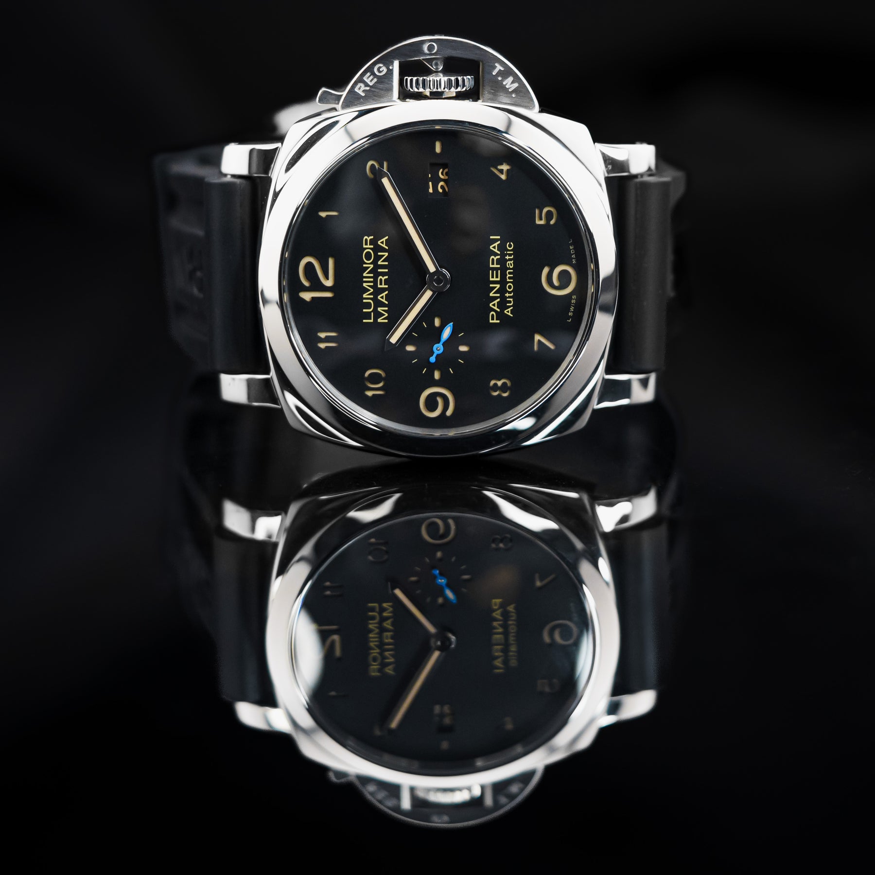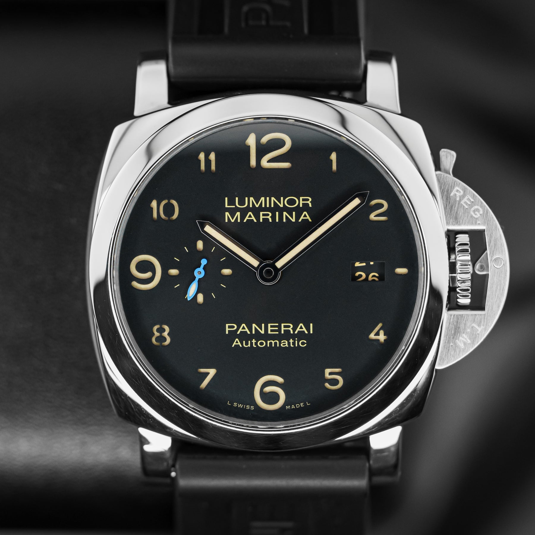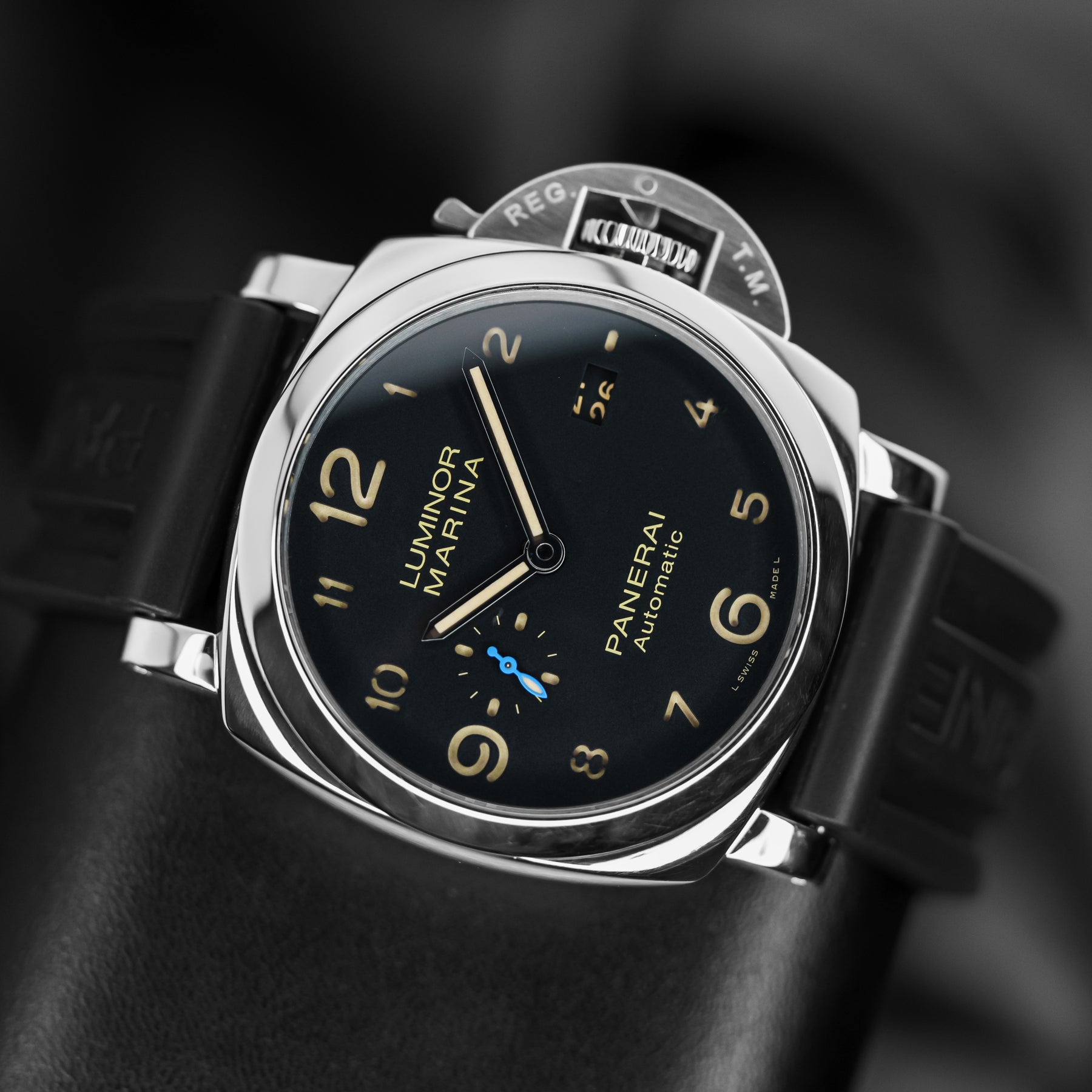 The PAM01359 is classic, conservative, and versatile. The black dial features beige sandwich indices, a small seconds subdial at 9 o'clock with a blue hand, and a date window at 3 o'clock. It also features enlarged 12, 6, and 9 indices for the sake of proportion and legibility. The case is made from stainless steel and measures 44mm in diameter, housing Panerai's in-house Caliber P.9010 automatic movement with 72 hours of power reserve.