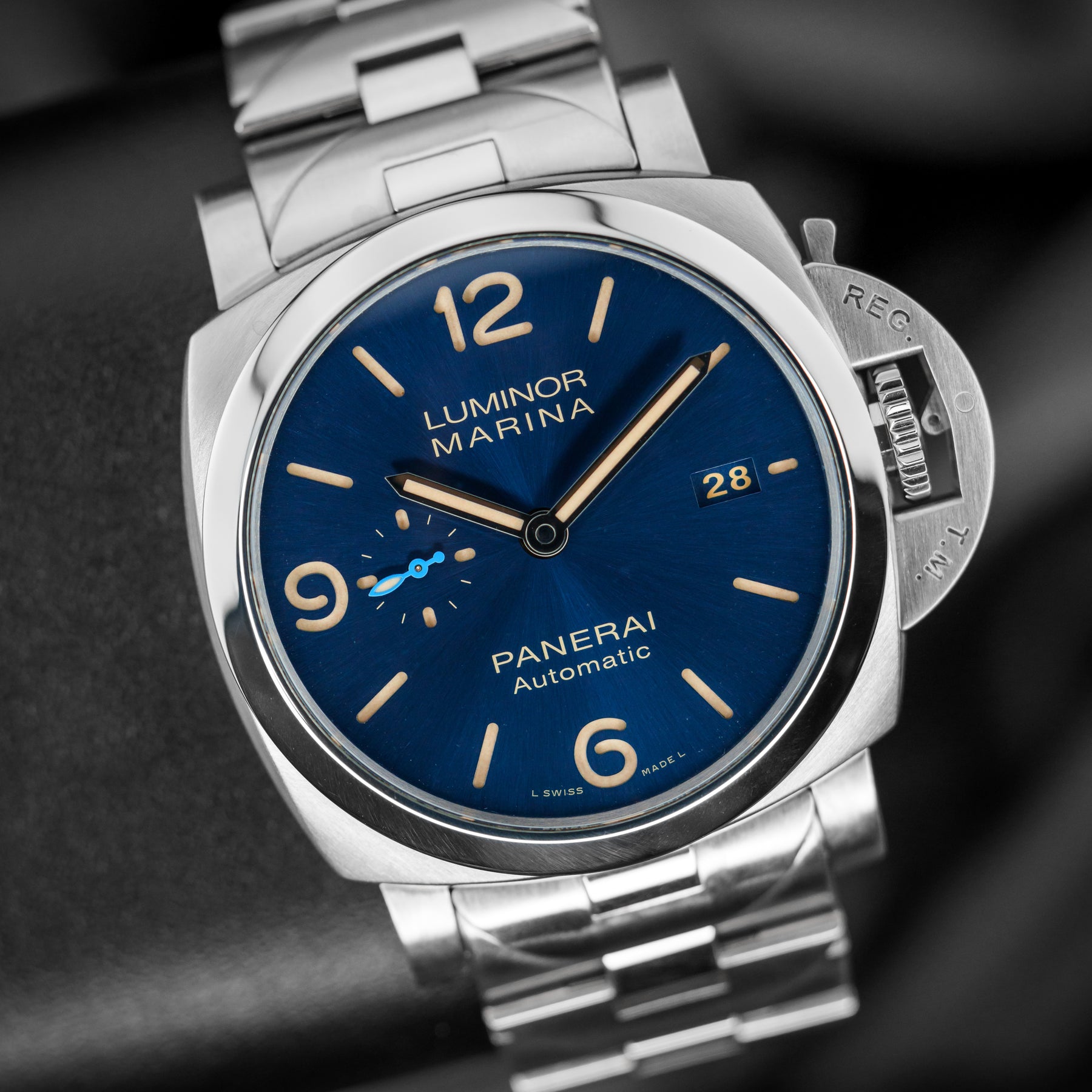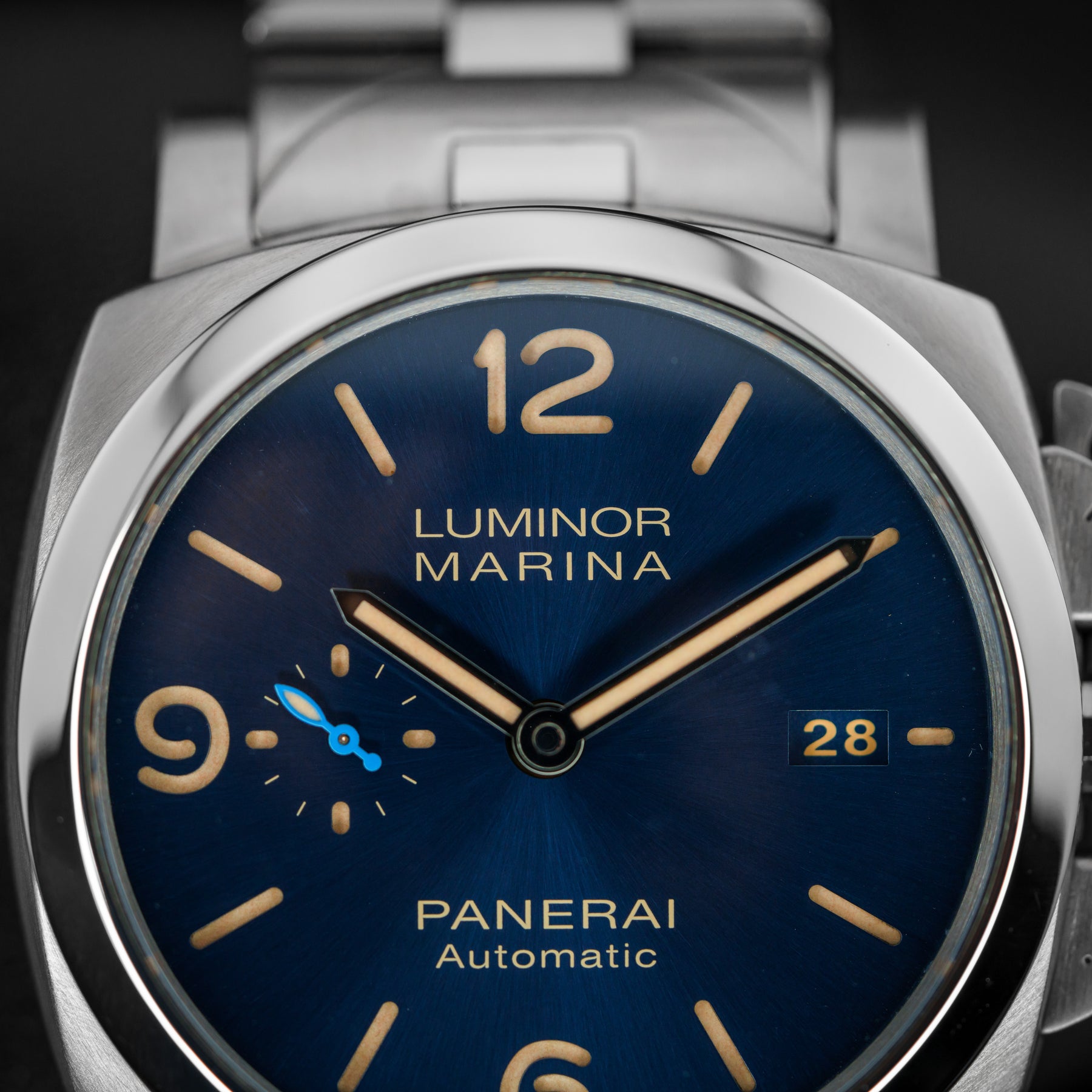 The PAM01058 is a stunning alternative to its sibling, the PAM01316. Both are 44mm steel watches with matching bracelets, but the PAM01058 carries a more vintage and classic look. The sunburst blue dial is more reminiscent of the ever-popular PAM01033, with its beige sandwich indices, dial text, date, and handset. It also features a small seconds subdial at 9 o’clock like many other Panerais. This watch is rugged, practical, classy, and timeless; perfect for any collection. Powering the PAM01058 is Panerai’s in-house Caliber P.9010 automatic movement with 72 hours of power reserve.