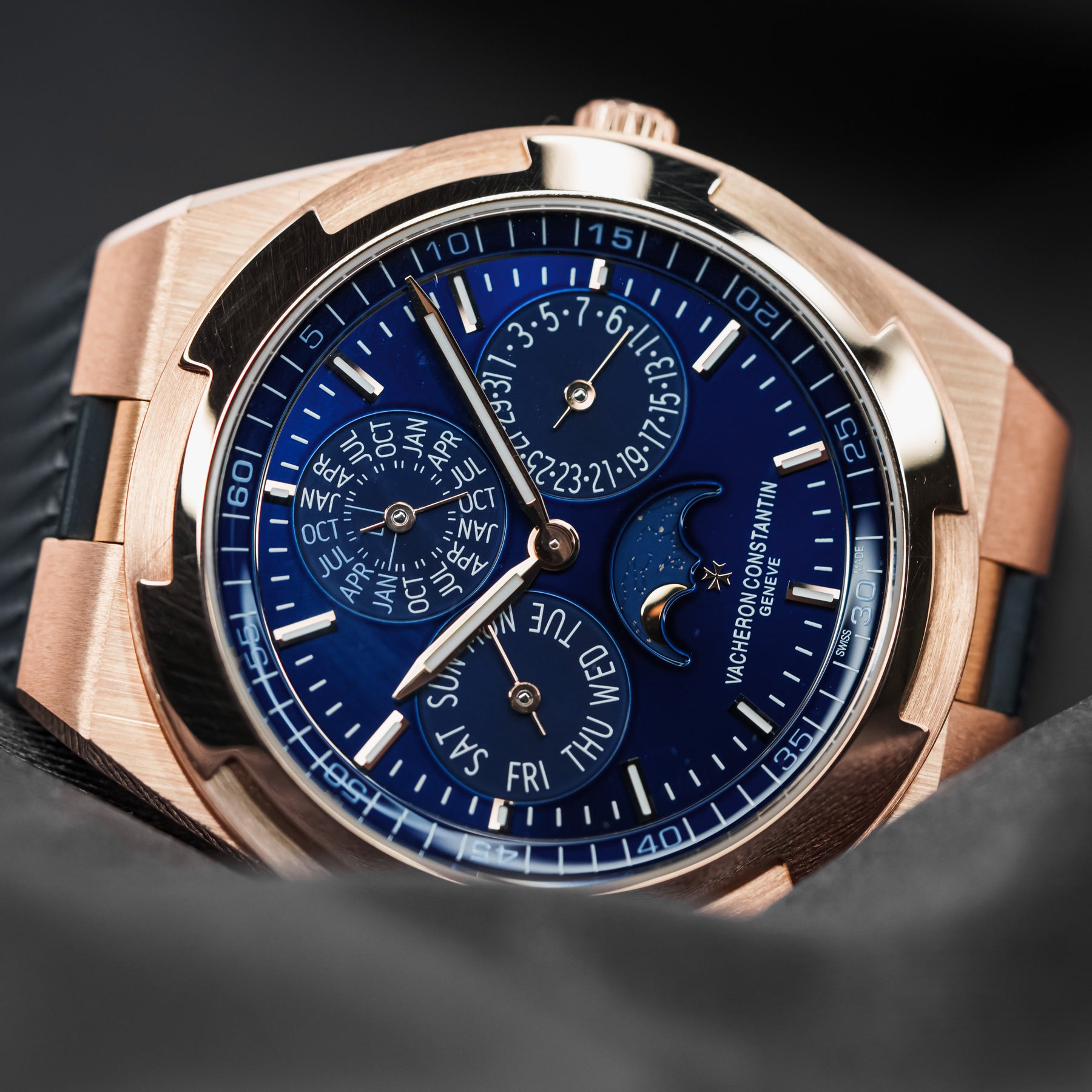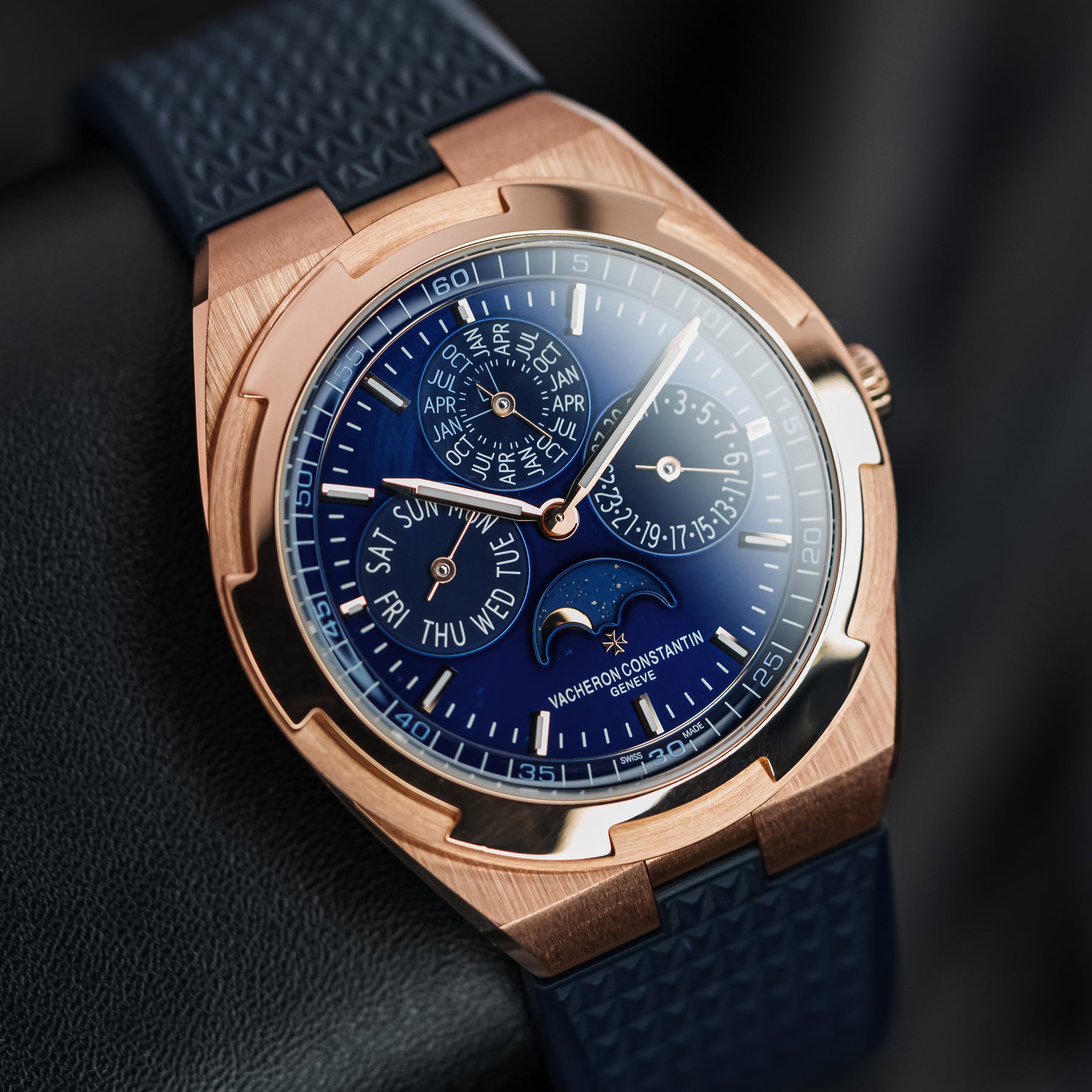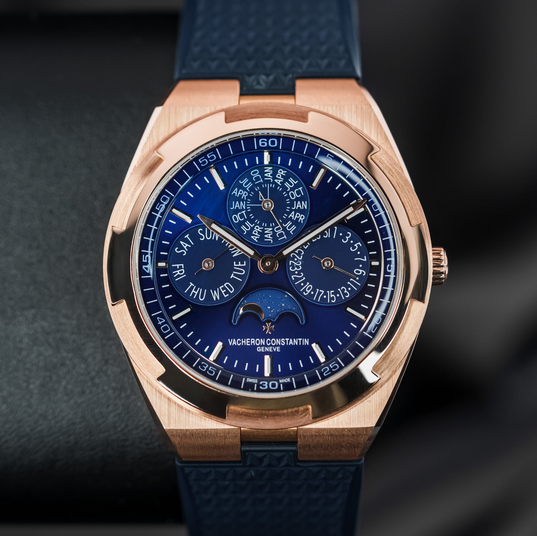 In many ways, the 4300V Ultra-Thin Perpetual Calendar in pink gold is as good as it gets – the ultimate grail. The 41.5mm case is a perfect size for almost any wrist, and Vacheron's ever-popular signature blue dial is one of the most desirable dial colors on the market. The case and quick-release integrated bracelet are made from Vacheron's own solid pink gold, stamped Au750. The dial of the 4300V is near perfection, featuring a month subdial at 12 o'clock (and a smaller leap year indicator within), a date subdial at 3 o'clock, a moonphase at 6 o'clock with the text "Vacheron Constantin Geneve" underneath, and a day of the week subdial at 9 o'clock. Even more astonishing is the fact that this five-complication watch is thinner than the 4300V's time-only counterpart, making it a feat of watchmaking engineering. Powering this watch is Vacheron's in-house Caliber 1120 QP/1 automatic movement with 40 hours of power reserve.