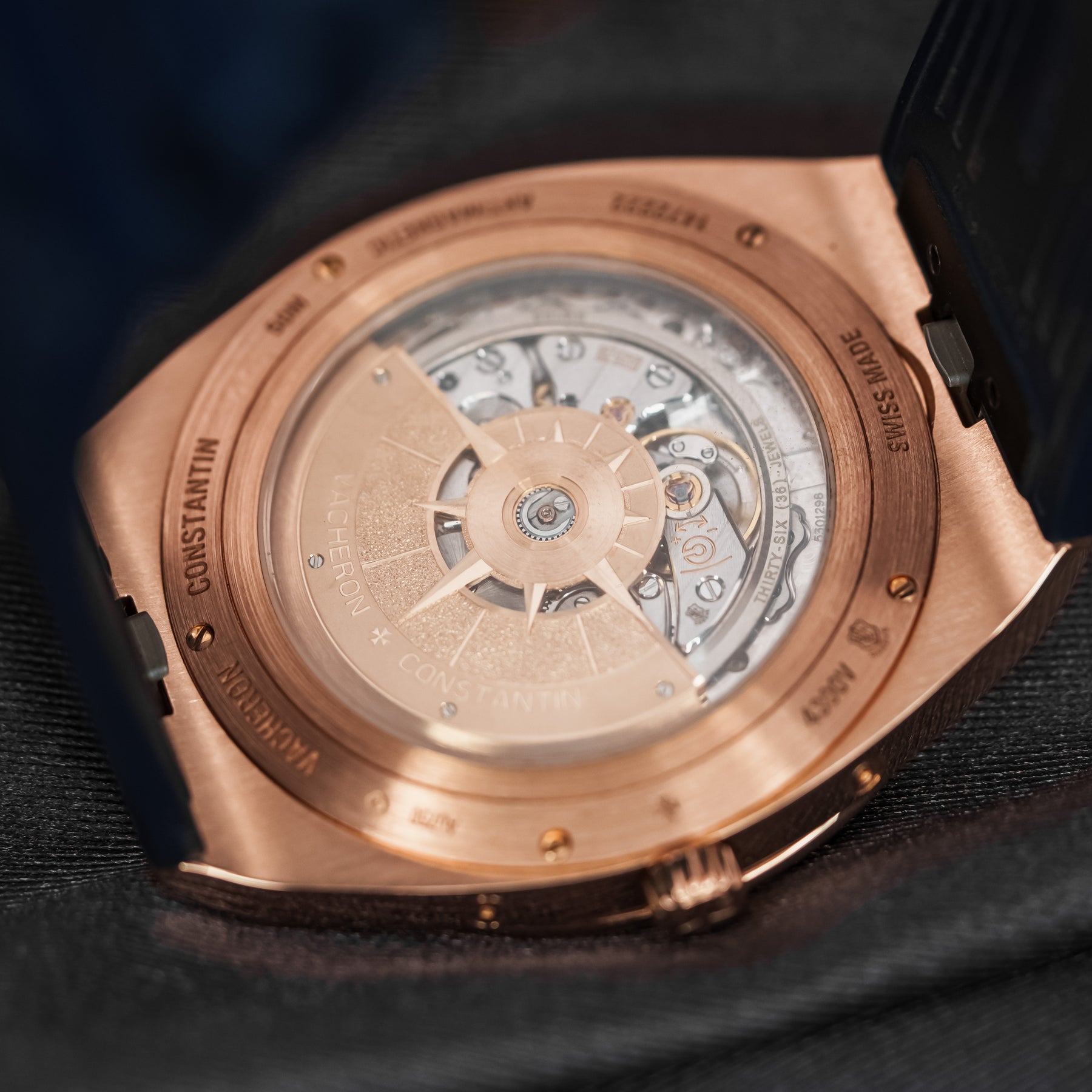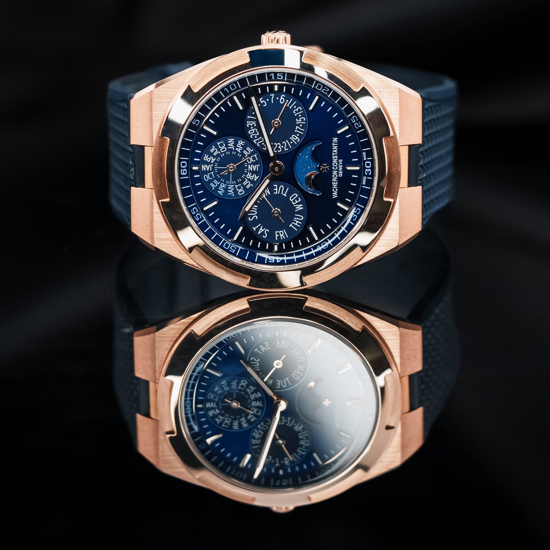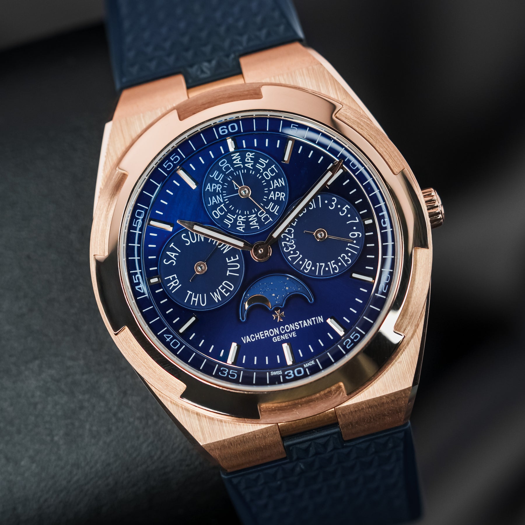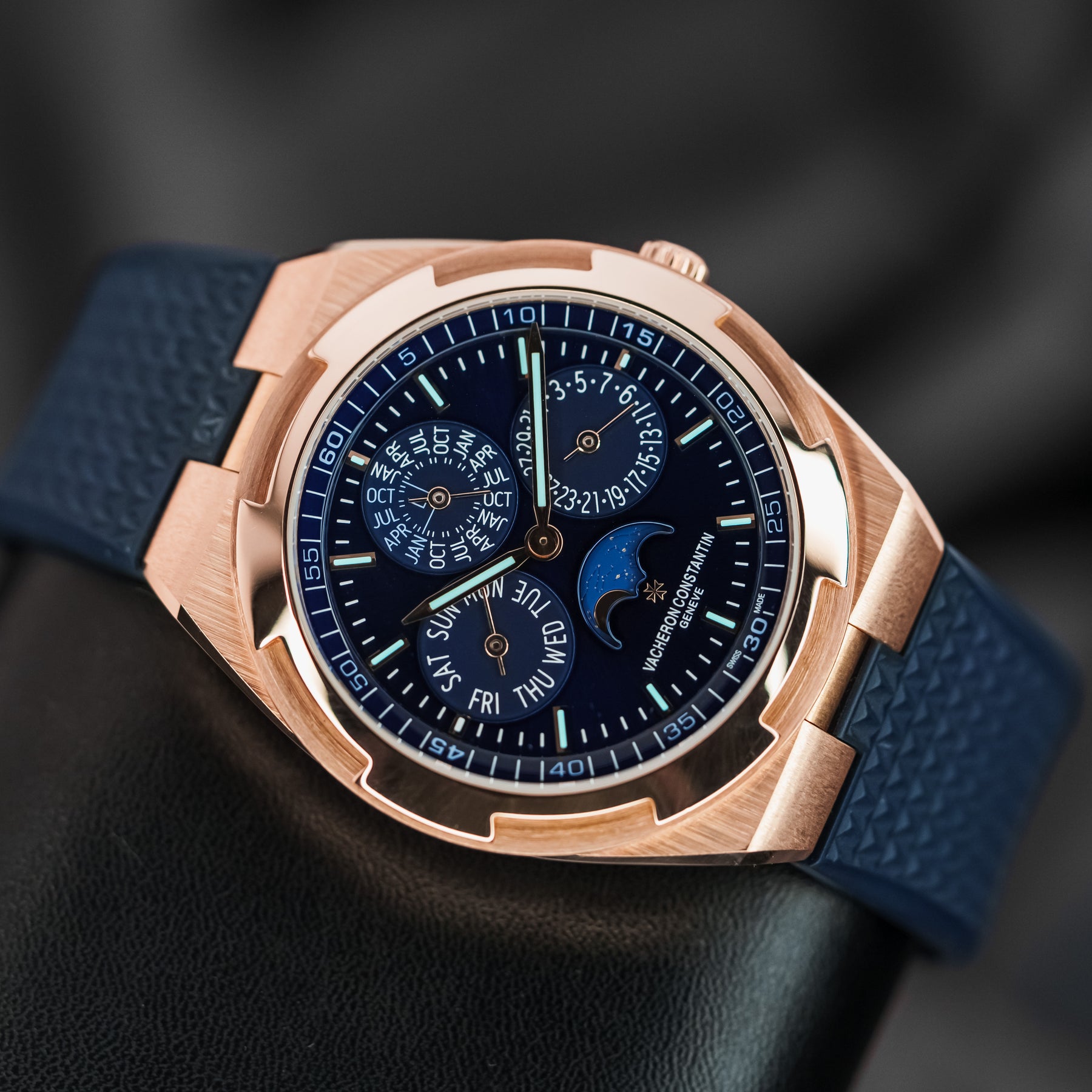 In many ways, the 4300V Ultra-Thin Perpetual Calendar in pink gold is as good as it gets – the ultimate grail. The 41.5mm case is a perfect size for almost any wrist, and Vacheron's ever-popular signature blue dial is one of the most desirable dial colors on the market. The case and quick-release integrated bracelet are made from Vacheron's own solid pink gold, stamped Au750. The dial of the 4300V is near perfection, featuring a month subdial at 12 o'clock (and a smaller leap year indicator within), a date subdial at 3 o'clock, a moonphase at 6 o'clock with the text "Vacheron Constantin Geneve" underneath, and a day of the week subdial at 9 o'clock. Even more astonishing is the fact that this five-complication watch is thinner than the 4300V's time-only counterpart, making it a feat of watchmaking engineering. Powering this watch is Vacheron's in-house Caliber 1120 QP/1 automatic movement with 40 hours of power reserve.