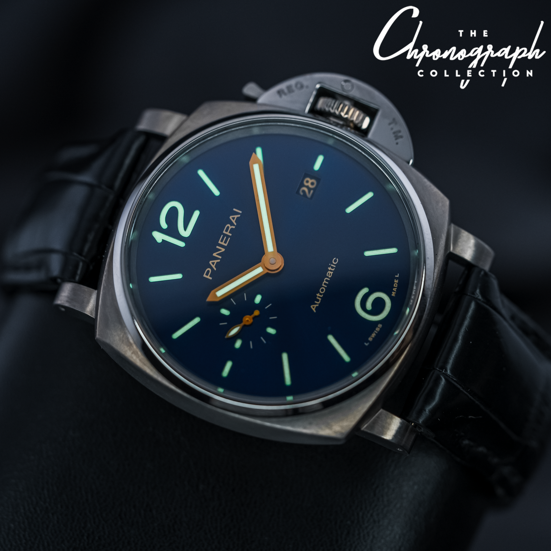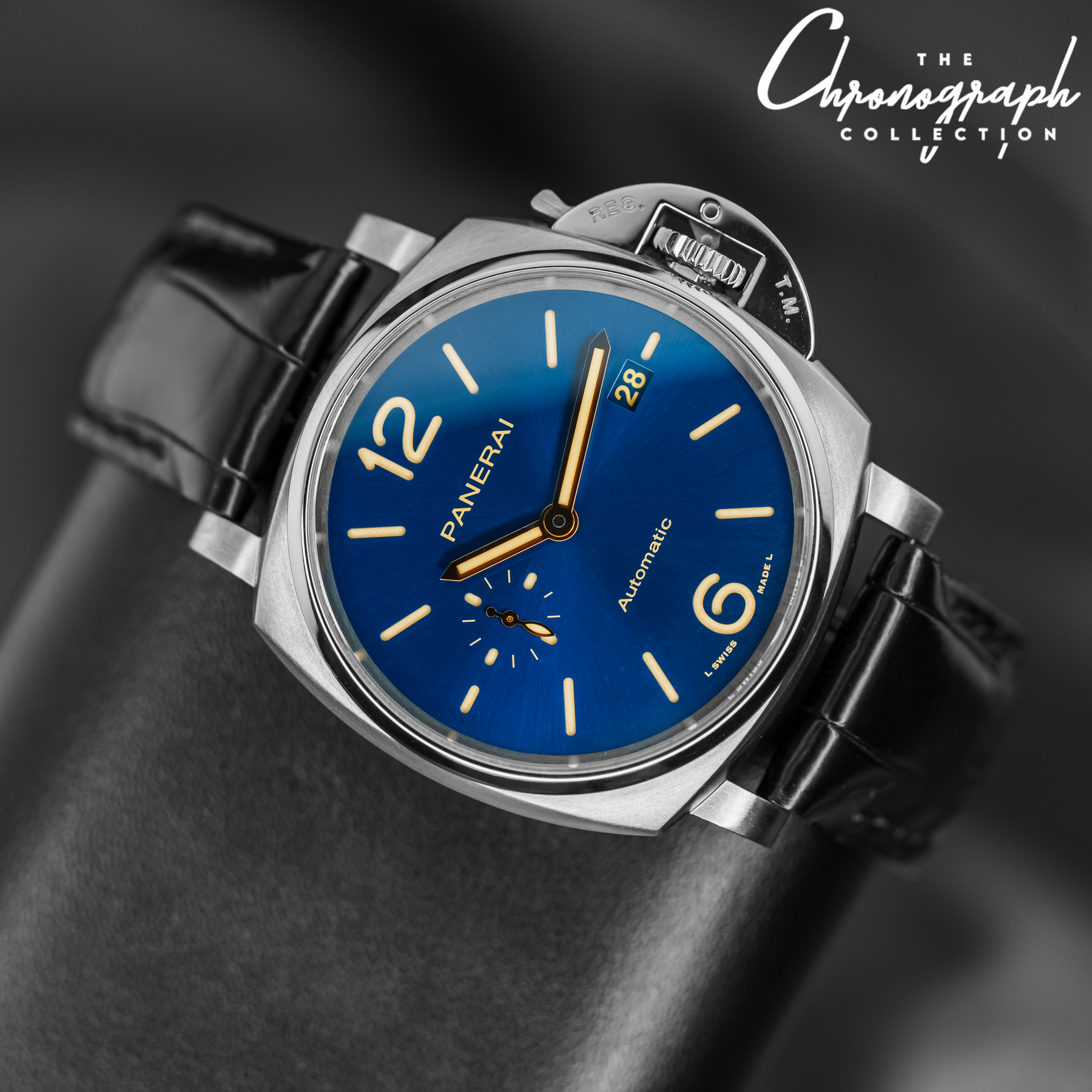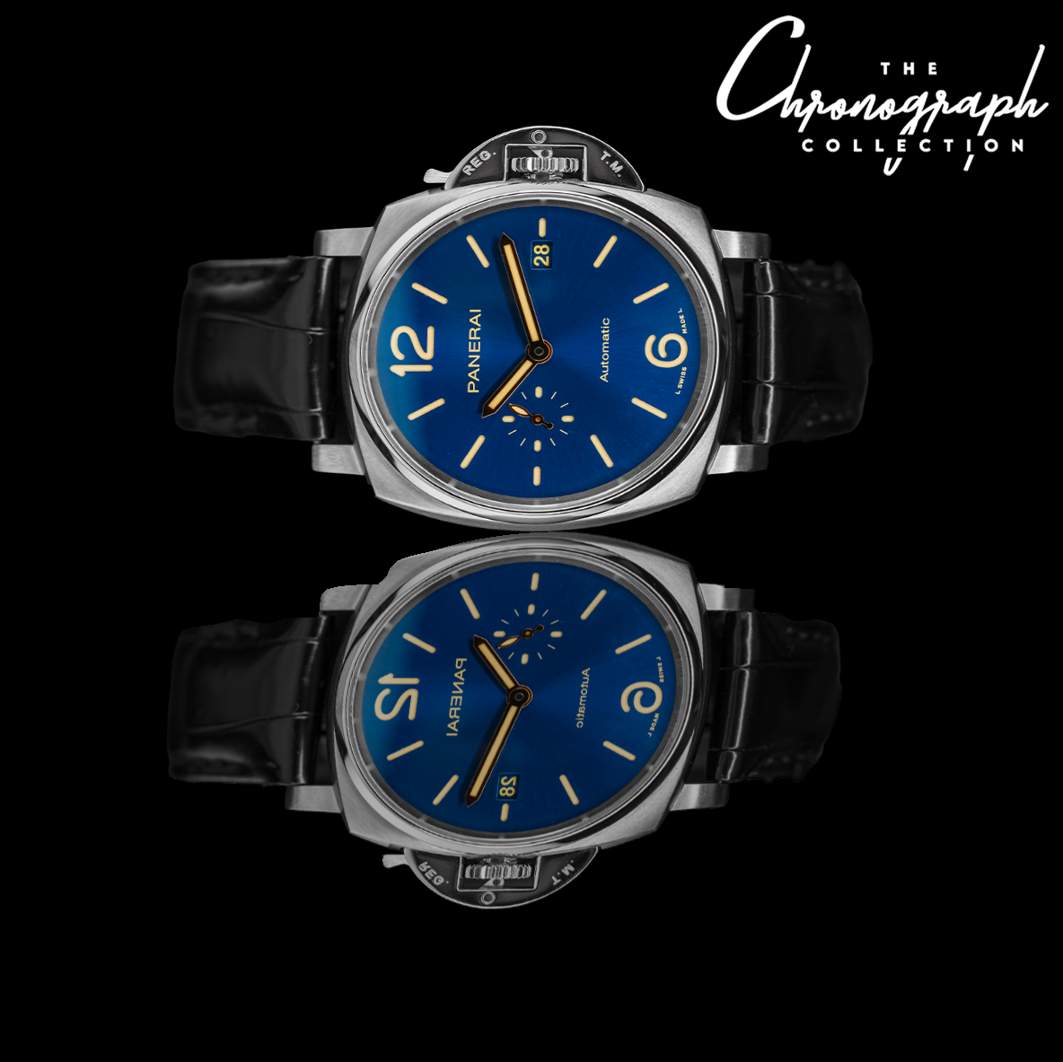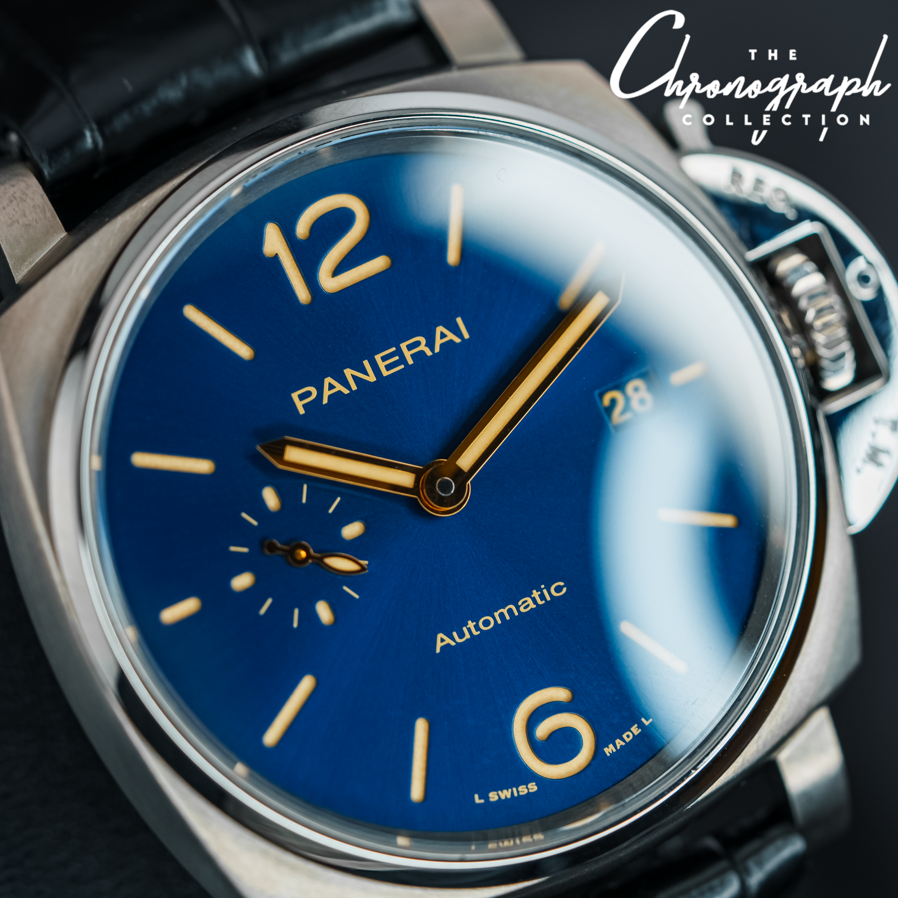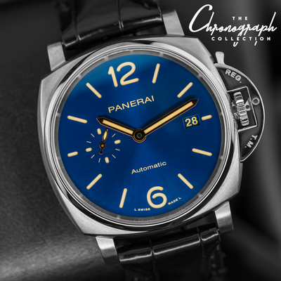 The PAM00927 is an elegantly designed and proportioned offering from the Panerai lineup. At 42mm, the titanium case is extremely wearable and comfortable. The sunburst blue dial features beige sandwich indices, a small seconds subdial at 9 o'clock, and date window at 3 o'clock, as well as a rose gold hand set. Inside the PAM00927 is Panerai's in-house Caliber P.900 automatic movement with 72 hours of power reserve.