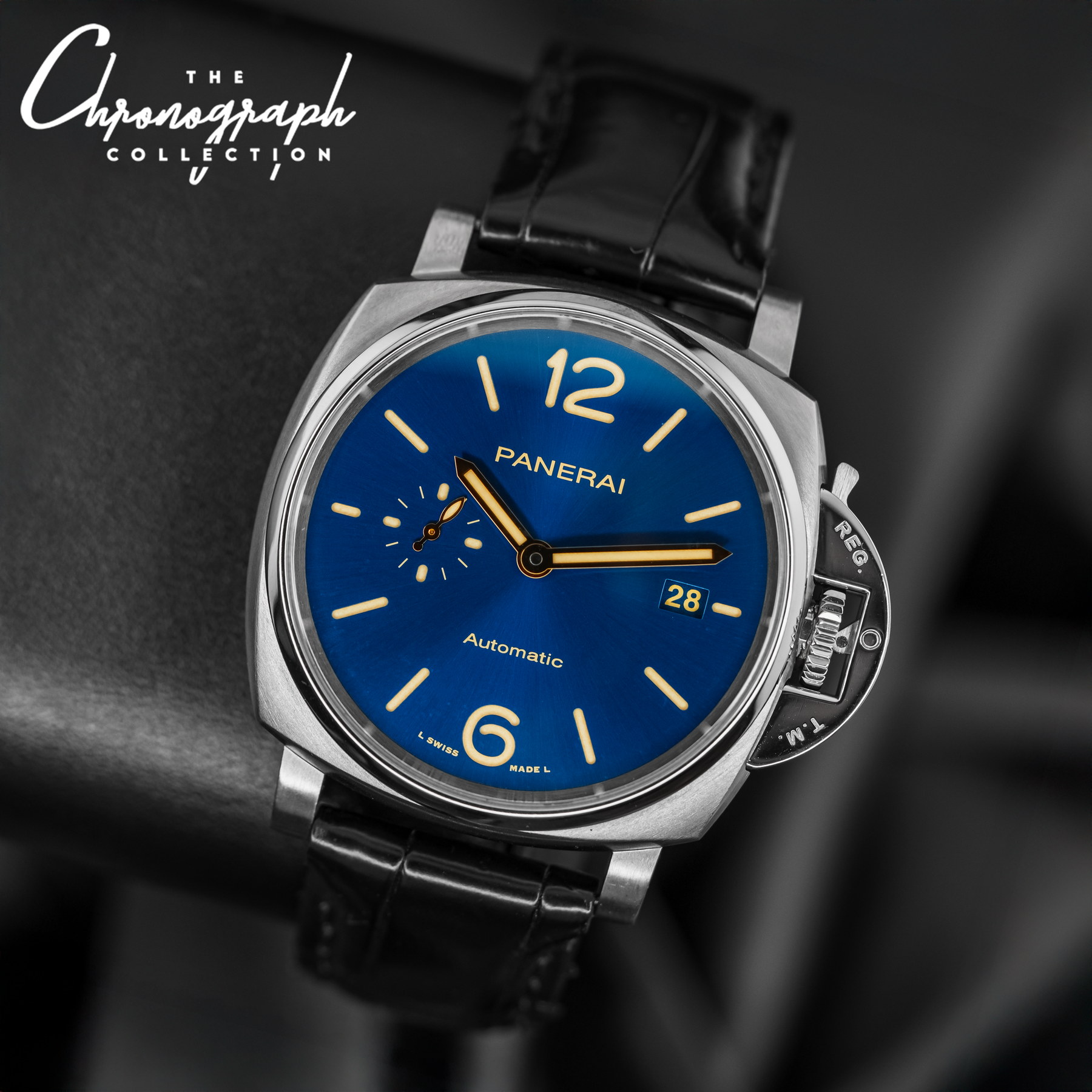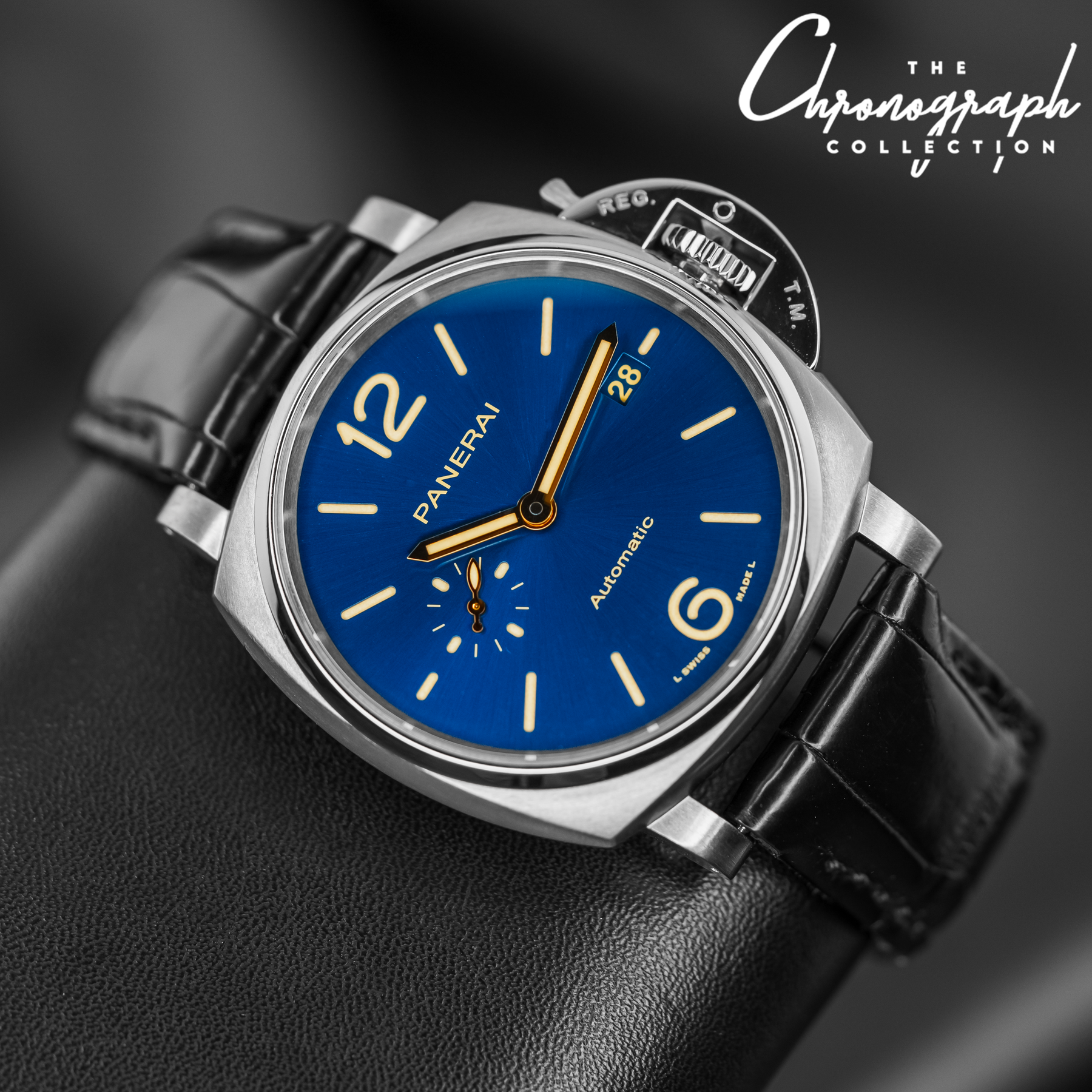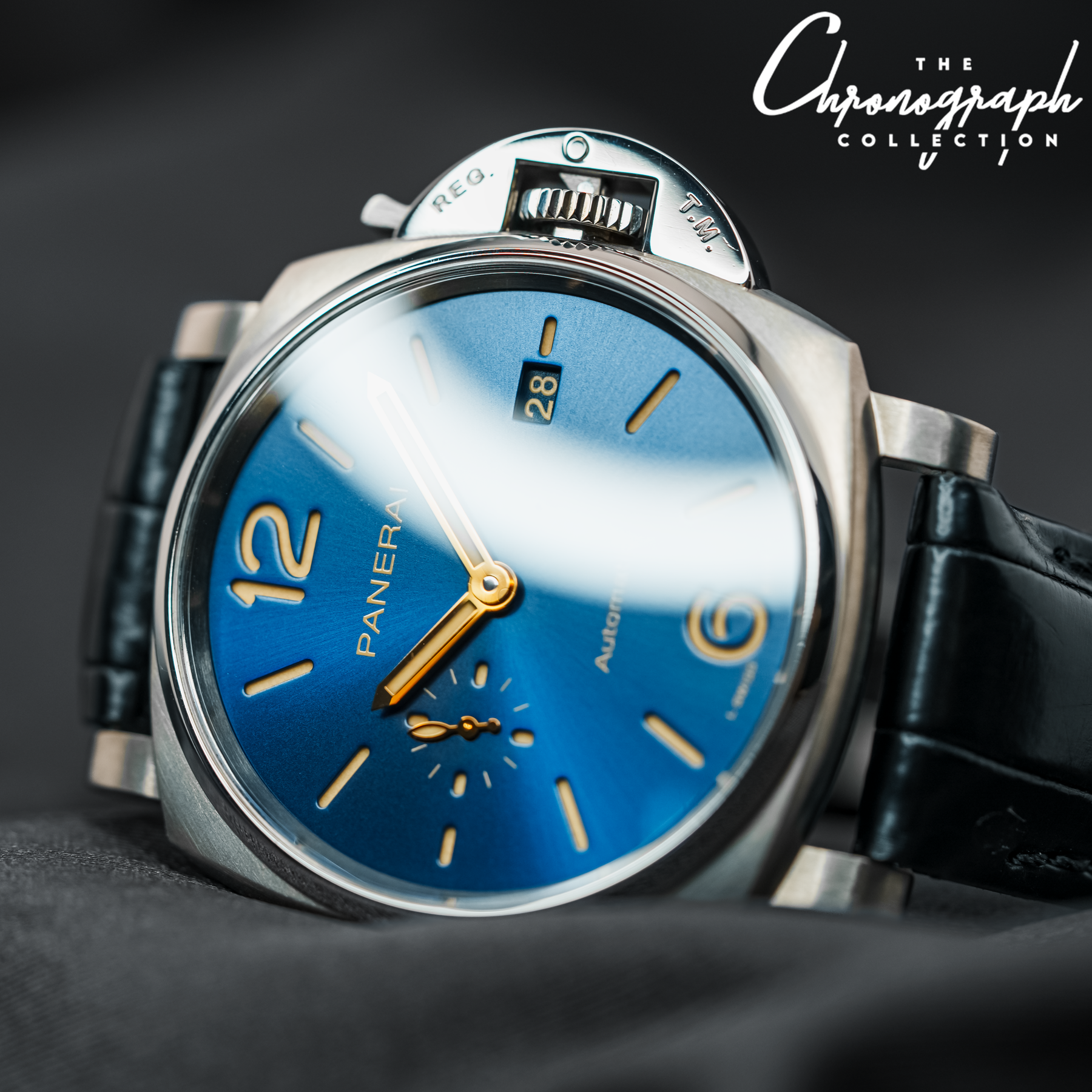 The PAM00927 is an elegantly designed and proportioned offering from the Panerai lineup. At 42mm, the titanium case is extremely wearable and comfortable. The sunburst blue dial features beige sandwich indices, a small seconds subdial at 9 o'clock, and date window at 3 o'clock, as well as a rose gold hand set. Inside the PAM00927 is Panerai's in-house Caliber P.900 automatic movement with 72 hours of power reserve.