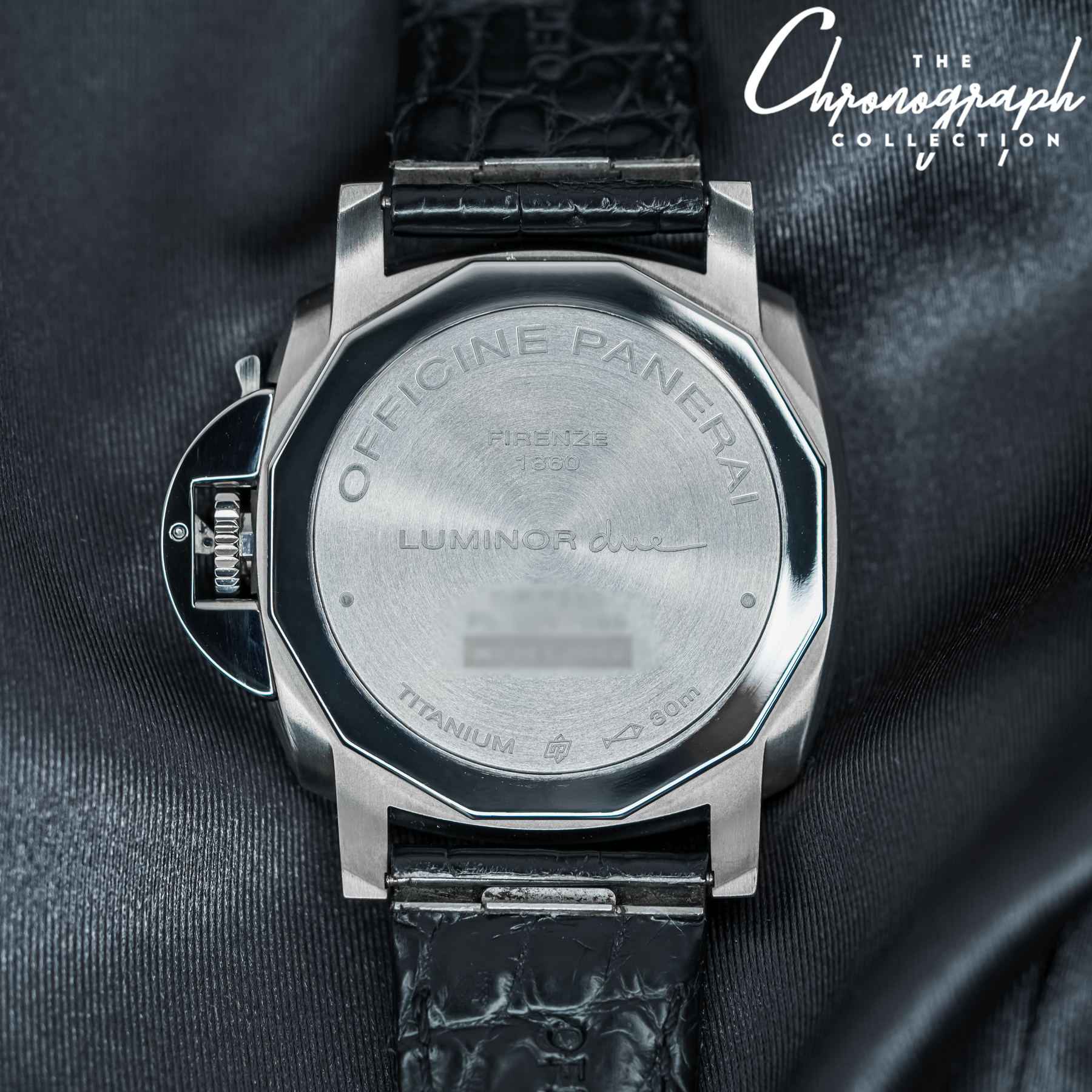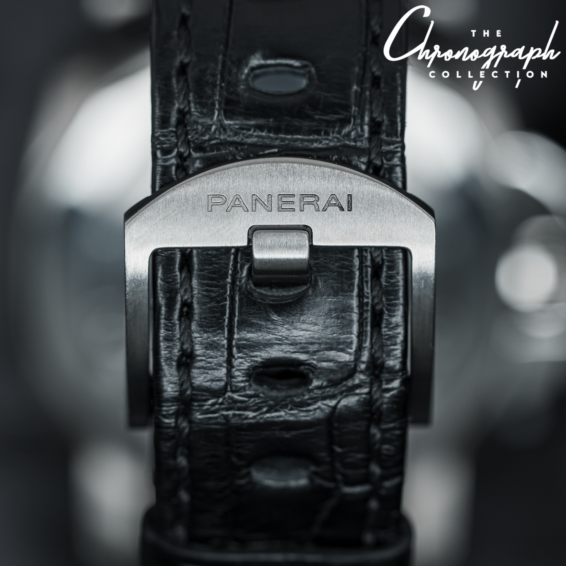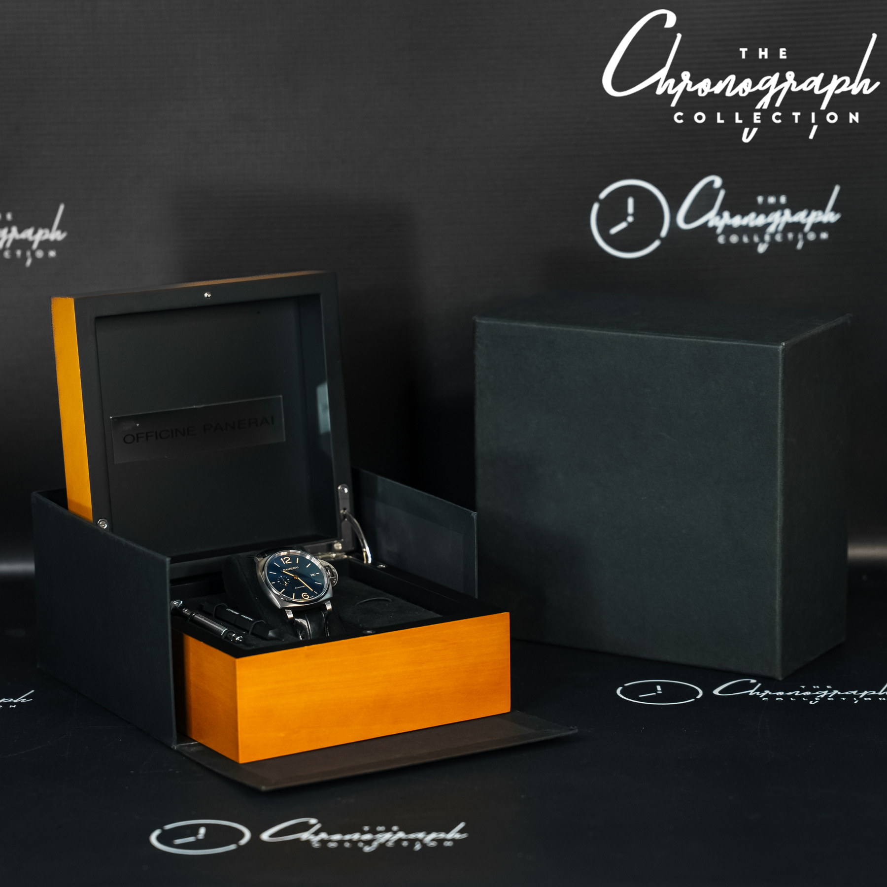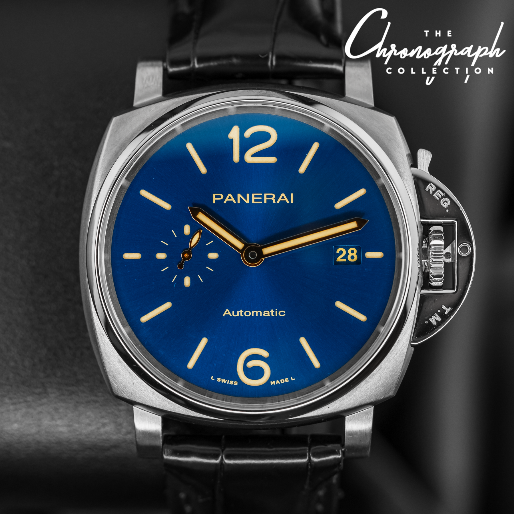 The PAM00927 is an elegantly designed and proportioned offering from the Panerai lineup. At 42mm, the titanium case is extremely wearable and comfortable. The sunburst blue dial features beige sandwich indices, a small seconds subdial at 9 o'clock, and date window at 3 o'clock, as well as a rose gold hand set. Inside the PAM00927 is Panerai's in-house Caliber P.900 automatic movement with 72 hours of power reserve.