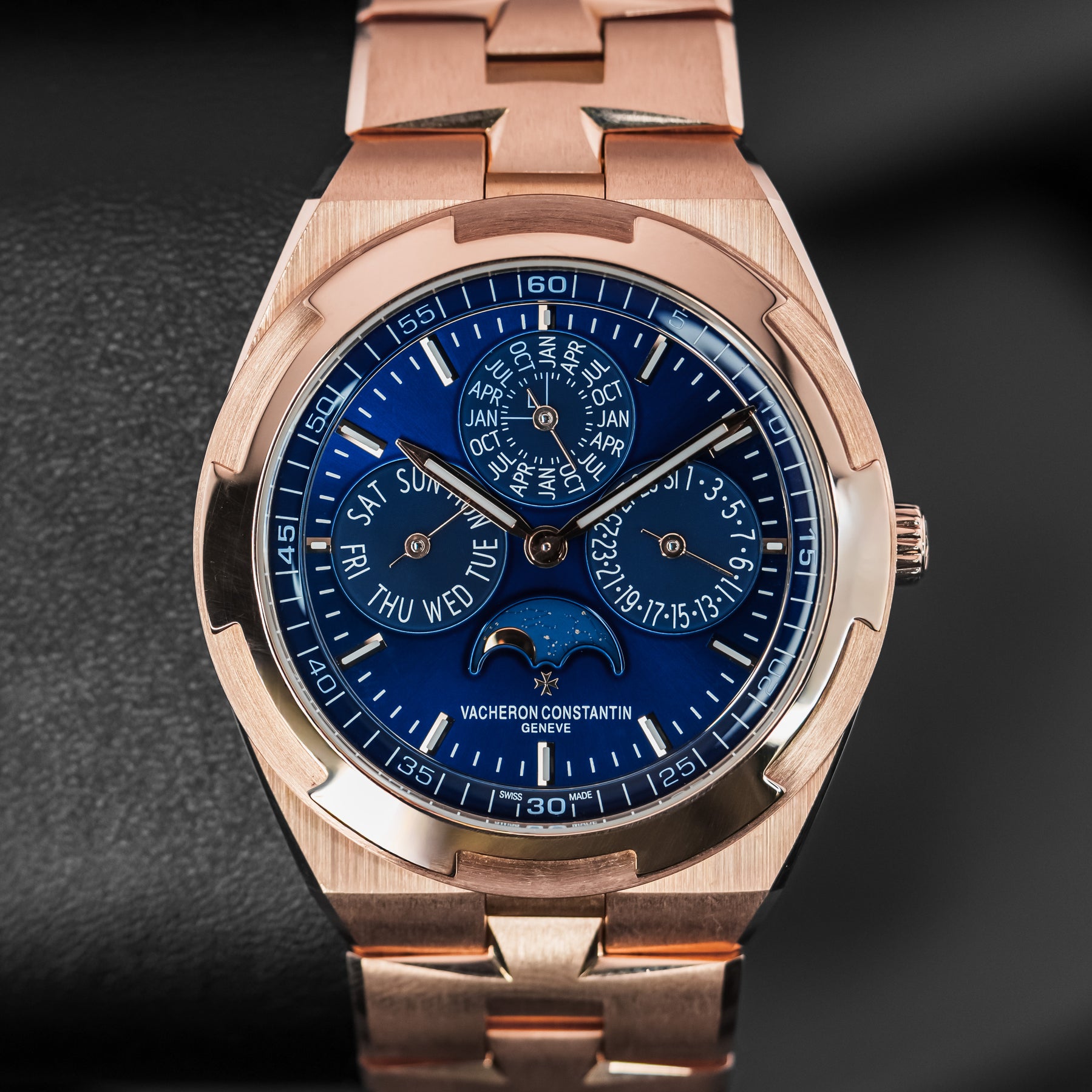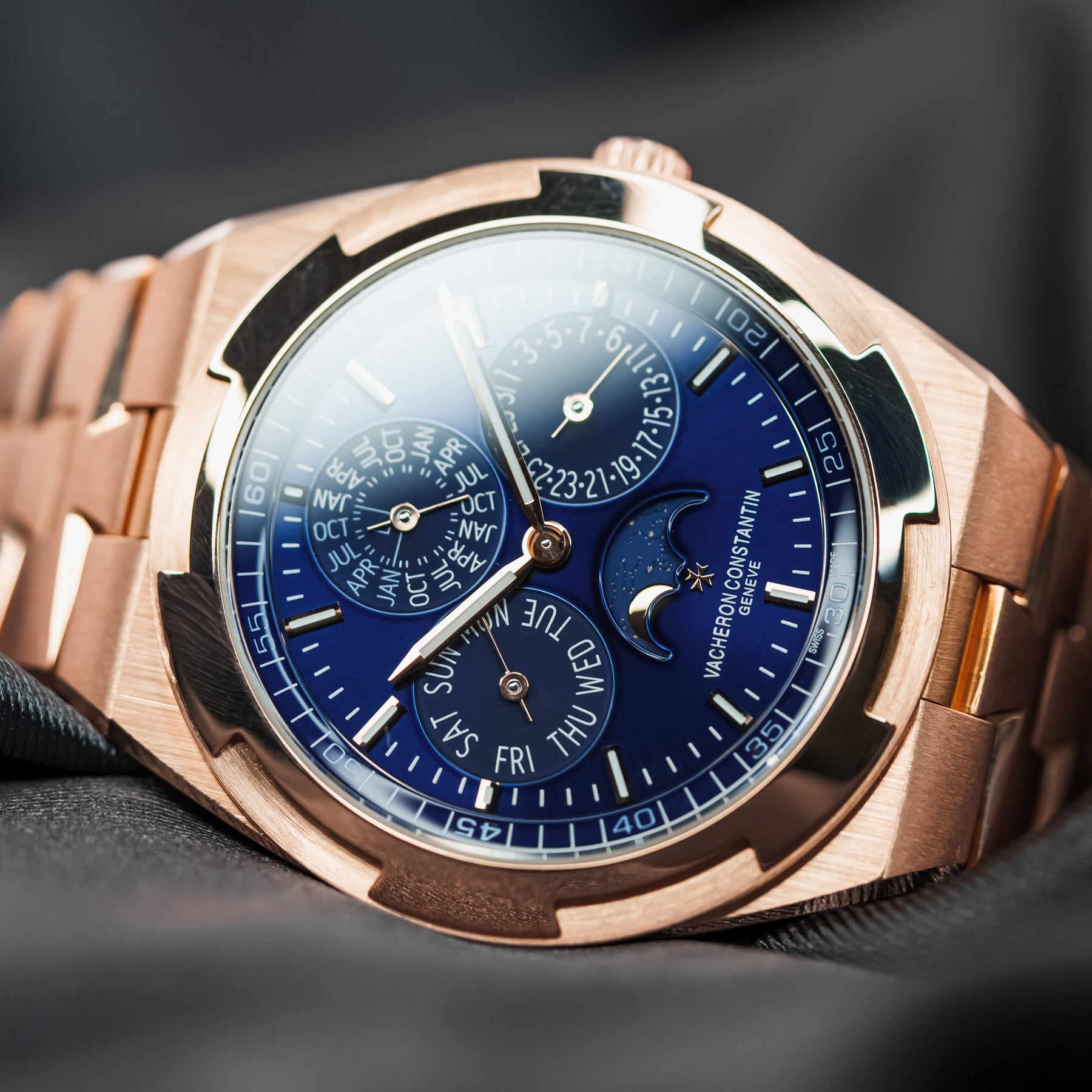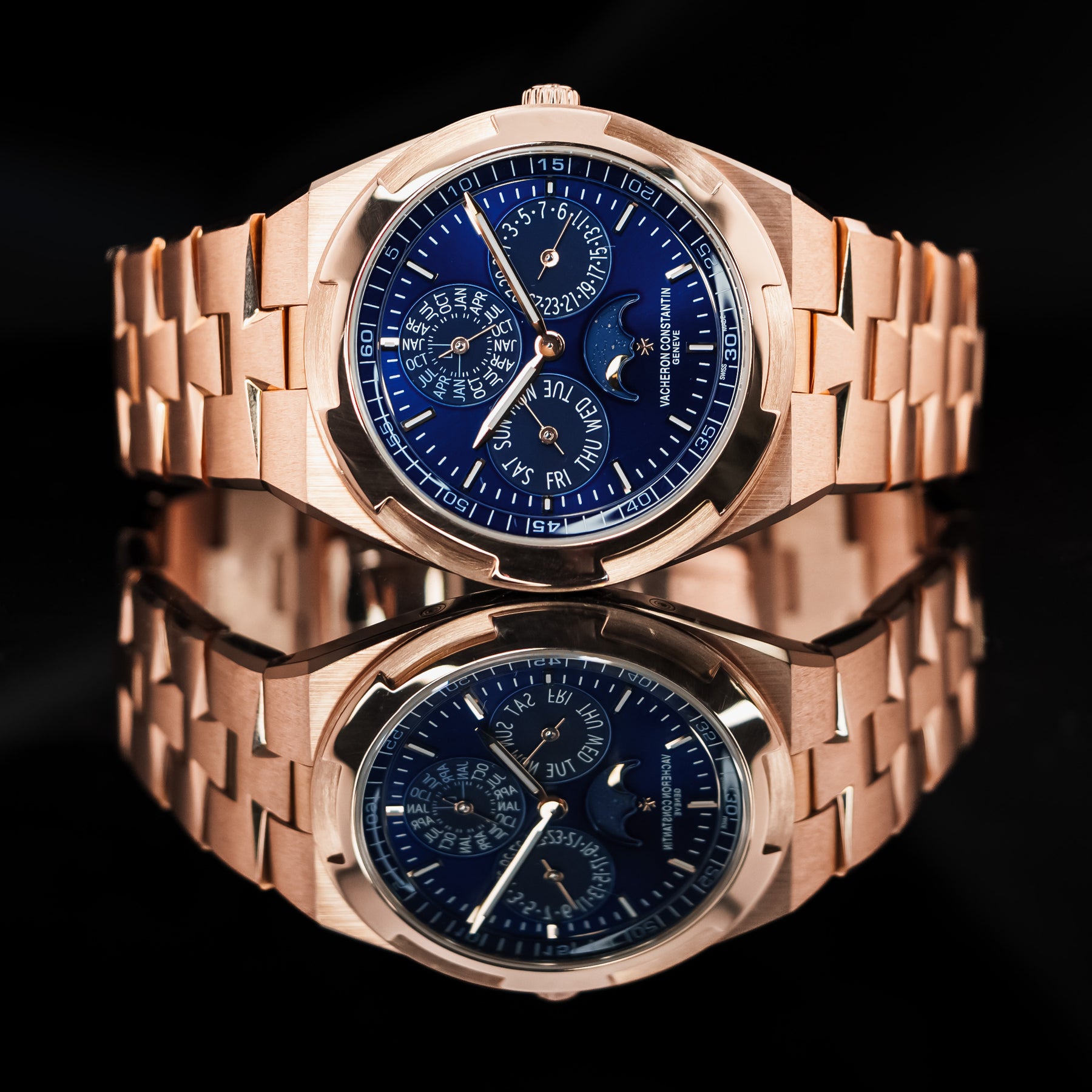 In many ways, the 4300V Ultra-Thin Perpetual Calendar in pink gold is as good as it gets – the ultimate grail. The 41.5mm case is a perfect size for almost any wrist, and Vacheron's ever-popular signature blue dial is one of the most desirable dial colors on the market. The case and quick-release integrated bracelet are made from Vacheron's own solid pink gold, stamped Au750. The dial of the 4300V is near perfection, featuring a month subdial at 12 o'clock (and a smaller leap year indicator within), a date subdial at 3 o'clock, a moonphase at 6 o'clock with the text "Vacheron Constantin Geneve" underneath, and a day of the week subdial at 9 o'clock. Even more astonishing is the fact that this five-complication watch is thinner than the 4300V's time-only counterpart, making it a feat of watchmaking engineering. Powering this watch is Vacheron's in-house Caliber 1120 QP/1 automatic movement with 40 hours of power reserve.