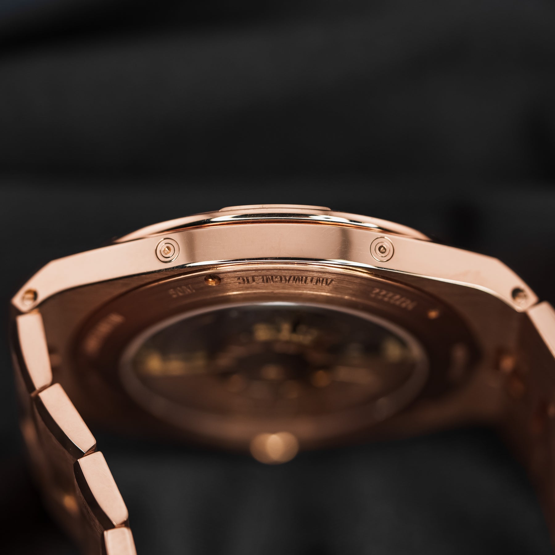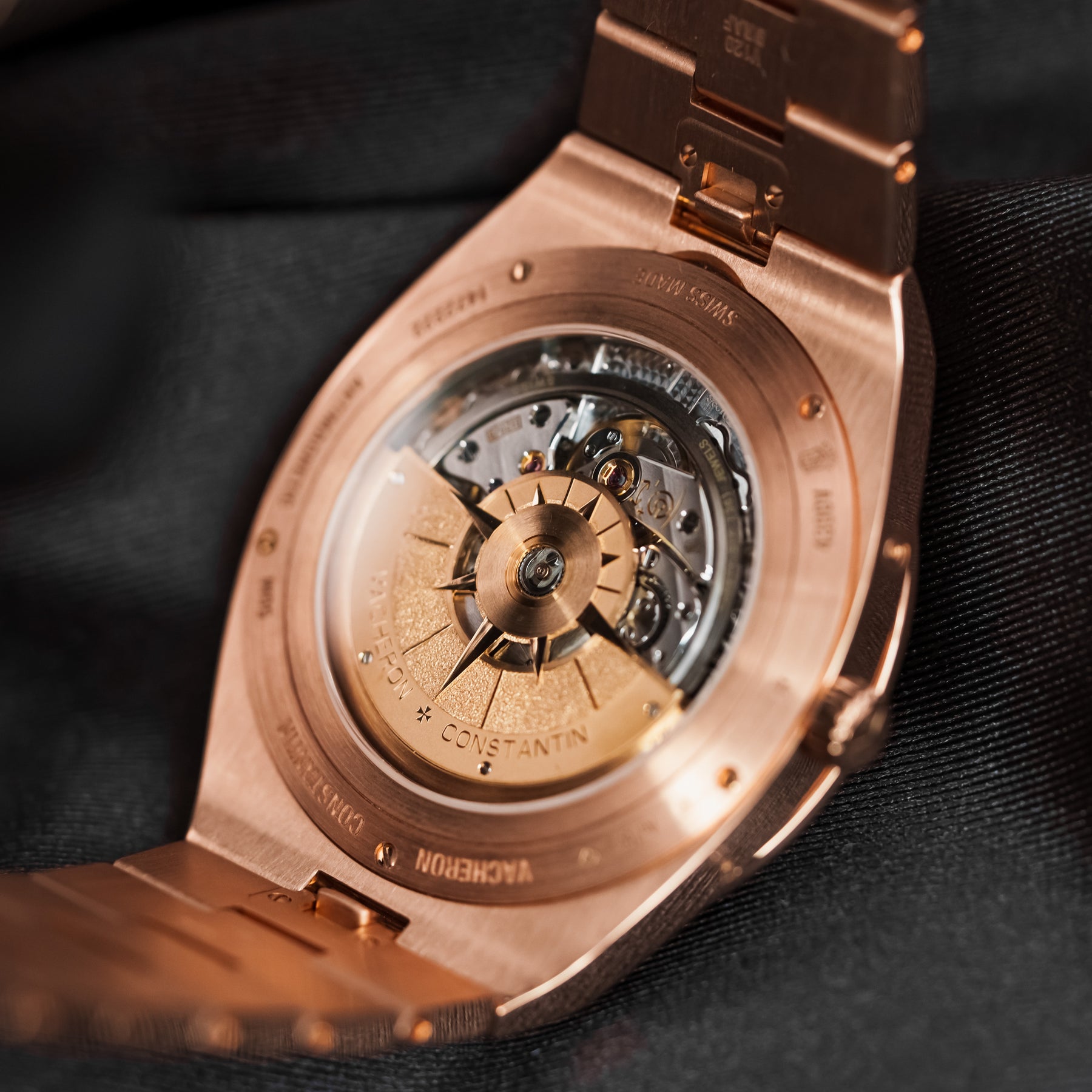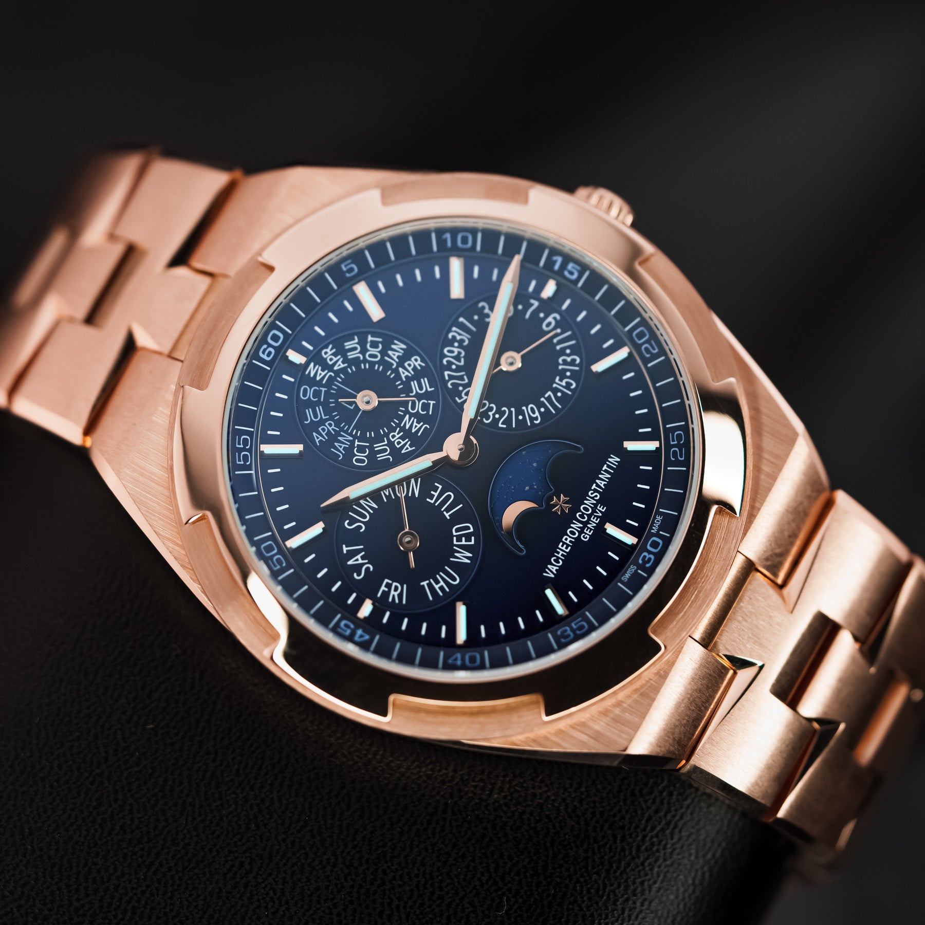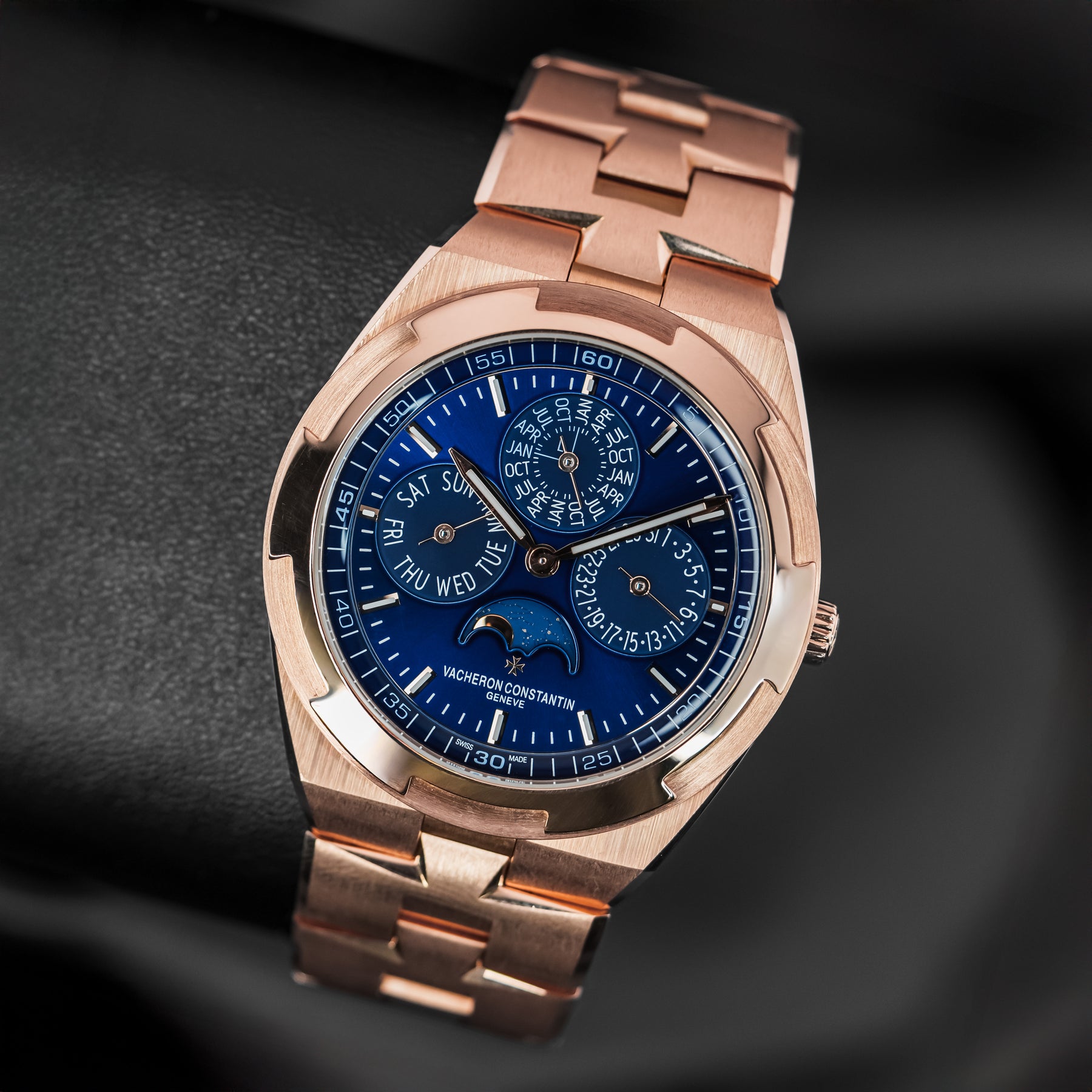 In many ways, the 4300V Ultra-Thin Perpetual Calendar in pink gold is as good as it gets – the ultimate grail. The 41.5mm case is a perfect size for almost any wrist, and Vacheron's ever-popular signature blue dial is one of the most desirable dial colors on the market. The case and quick-release integrated bracelet are made from Vacheron's own solid pink gold, stamped Au750. The dial of the 4300V is near perfection, featuring a month subdial at 12 o'clock (and a smaller leap year indicator within), a date subdial at 3 o'clock, a moonphase at 6 o'clock with the text "Vacheron Constantin Geneve" underneath, and a day of the week subdial at 9 o'clock. Even more astonishing is the fact that this five-complication watch is thinner than the 4300V's time-only counterpart, making it a feat of watchmaking engineering. Powering this watch is Vacheron's in-house Caliber 1120 QP/1 automatic movement with 40 hours of power reserve.