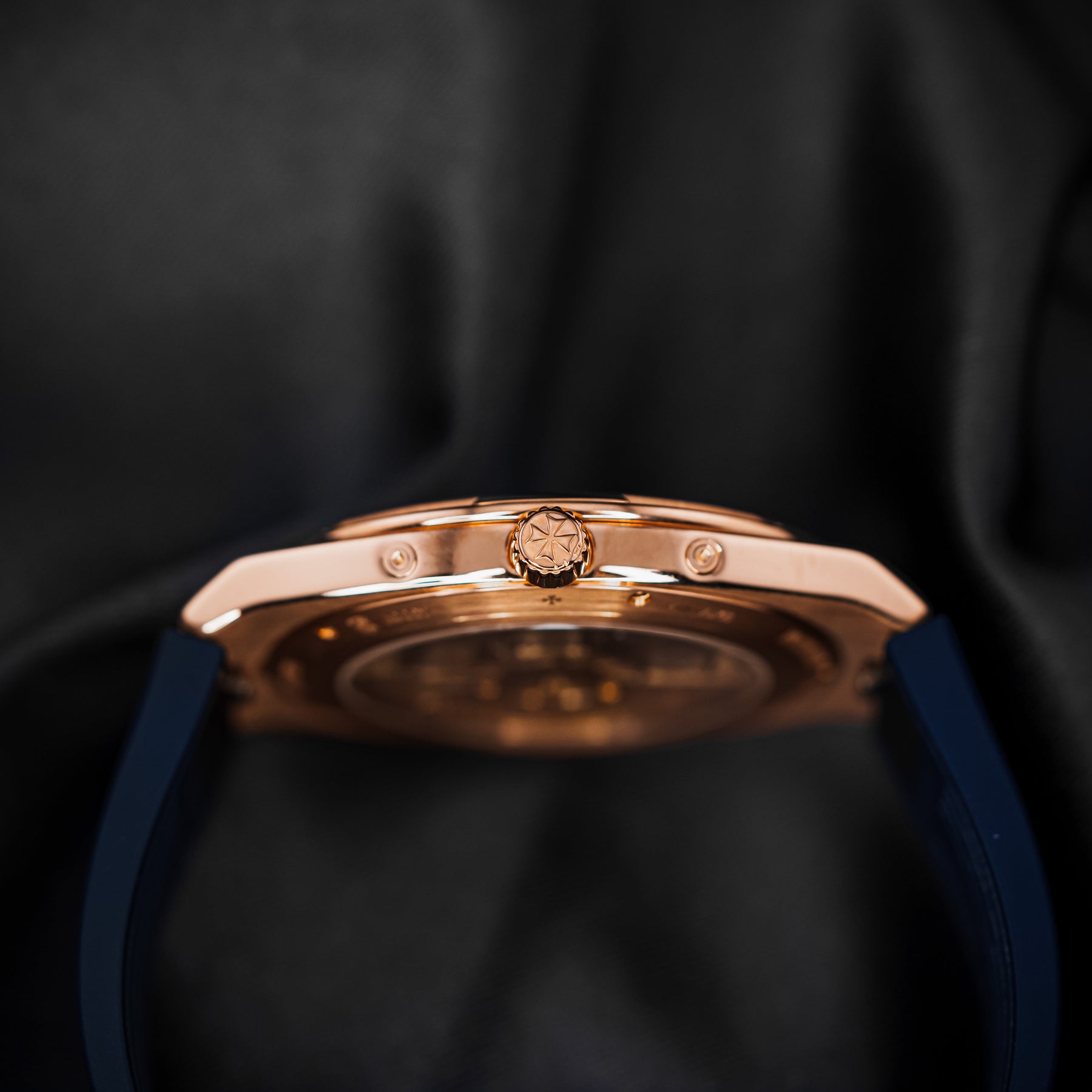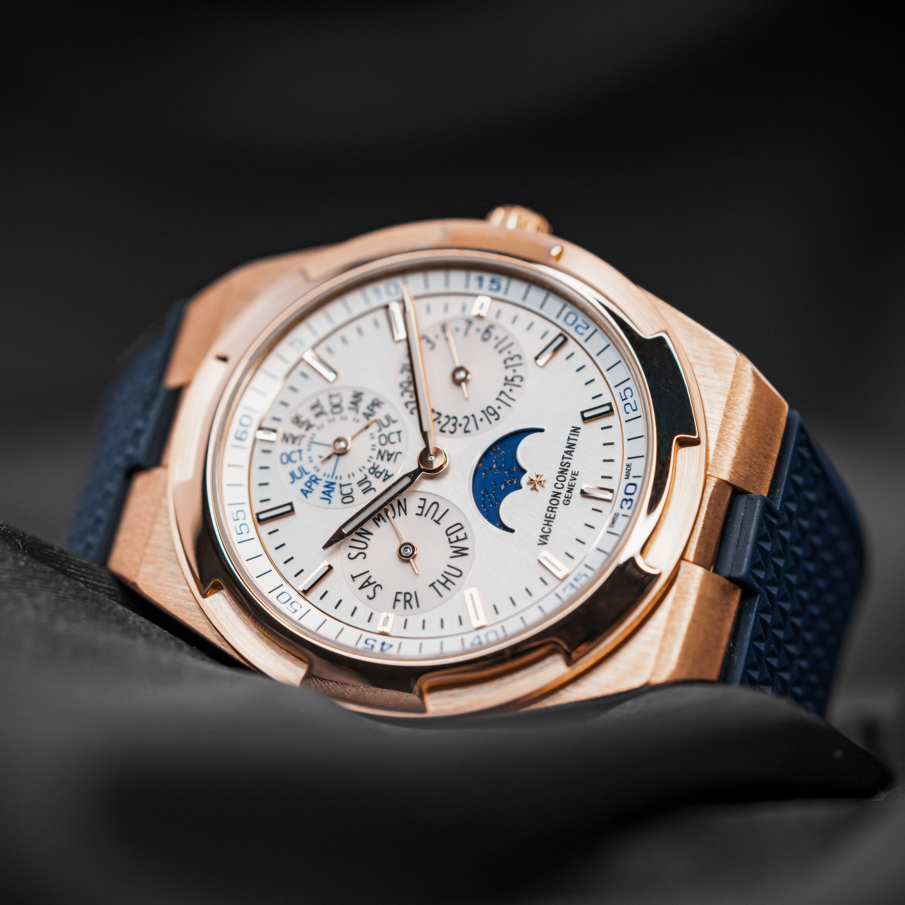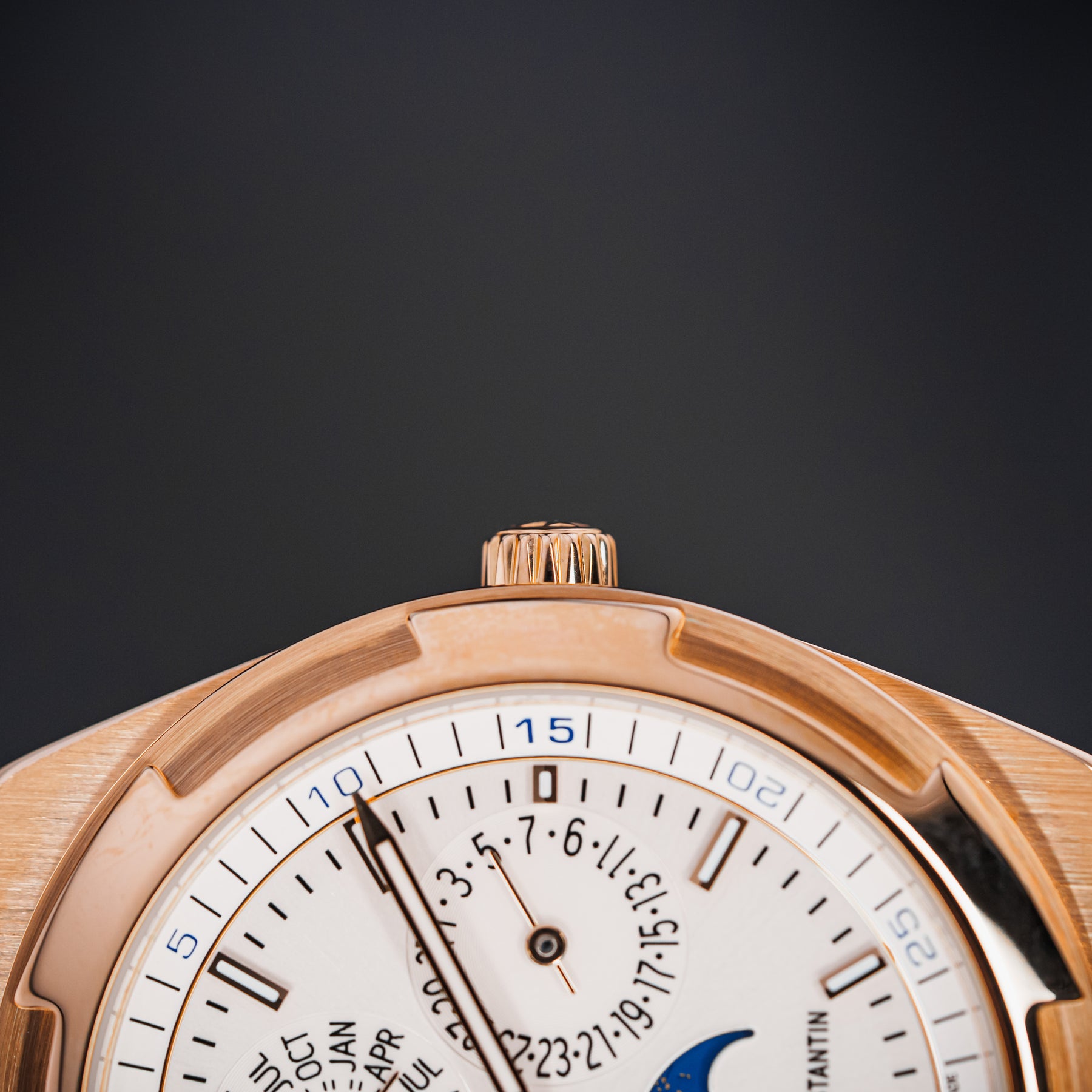 In many ways, the 4300V Ultra-Thin Perpetual Calendar in pink gold is as good as it gets – the ultimate grail. The 41.5mm case is a perfect size for almost any wrist, and Vacheron's beautiful white dial is one of the hottest combinations on the market. The case and quick-release integrated bracelet are made from Vacheron's own solid pink gold, stamped Au750. The dial of the 4300V is near perfection, featuring a month subdial at 12 o'clock (and a smaller leap year indicator within), a date subdial at 3 o'clock, a moonphase at 6 o'clock with the text "Vacheron Constantin Geneve" underneath, and a day of the week subdial at 9 o'clock. Even more astonishing is the fact that this five-complication watch is thinner than the 4300V's time-only counterpart, making it a feat of watchmaking engineering. Powering this watch is Vacheron's in-house Caliber 1120 QP/1 automatic movement with 40 hours of power reserve.