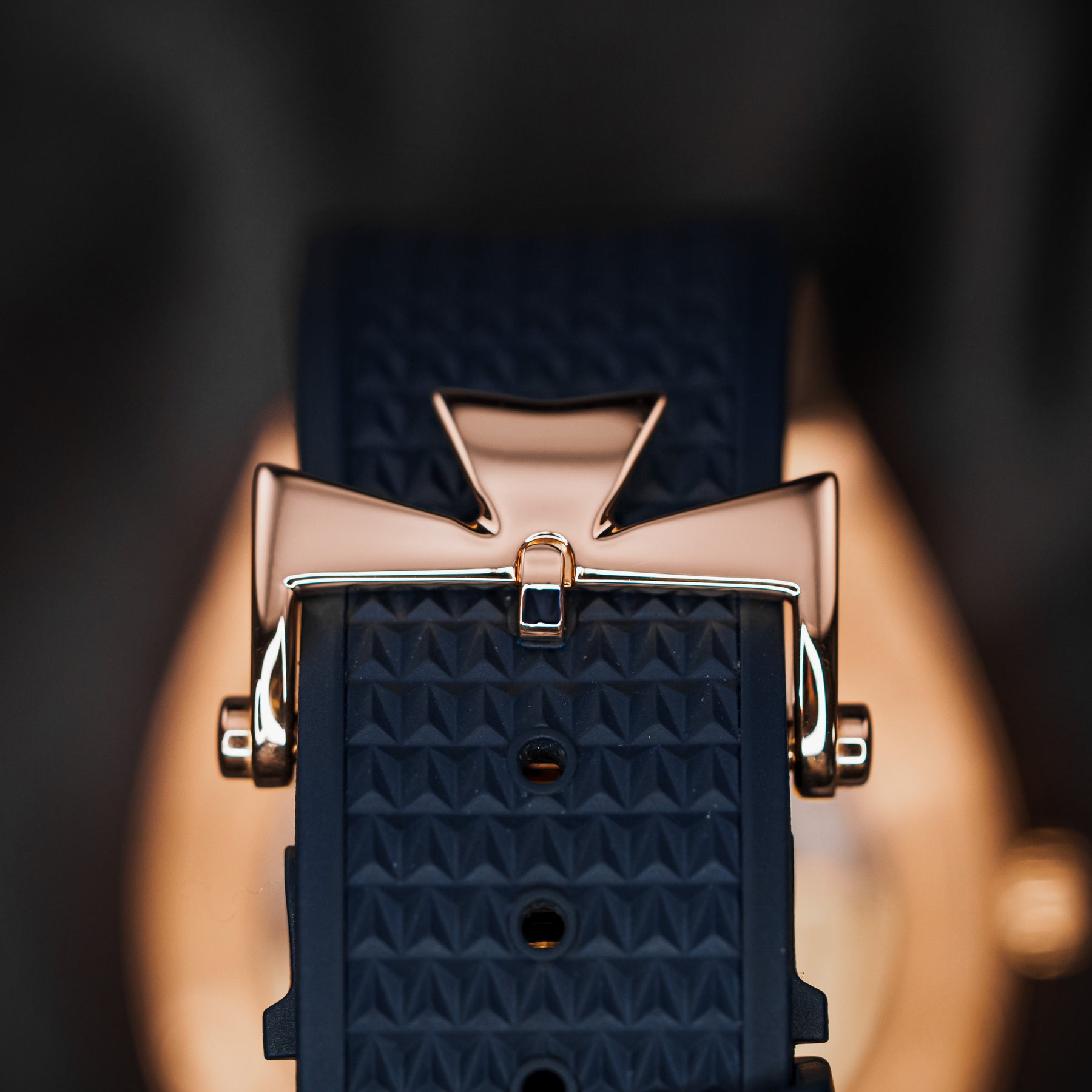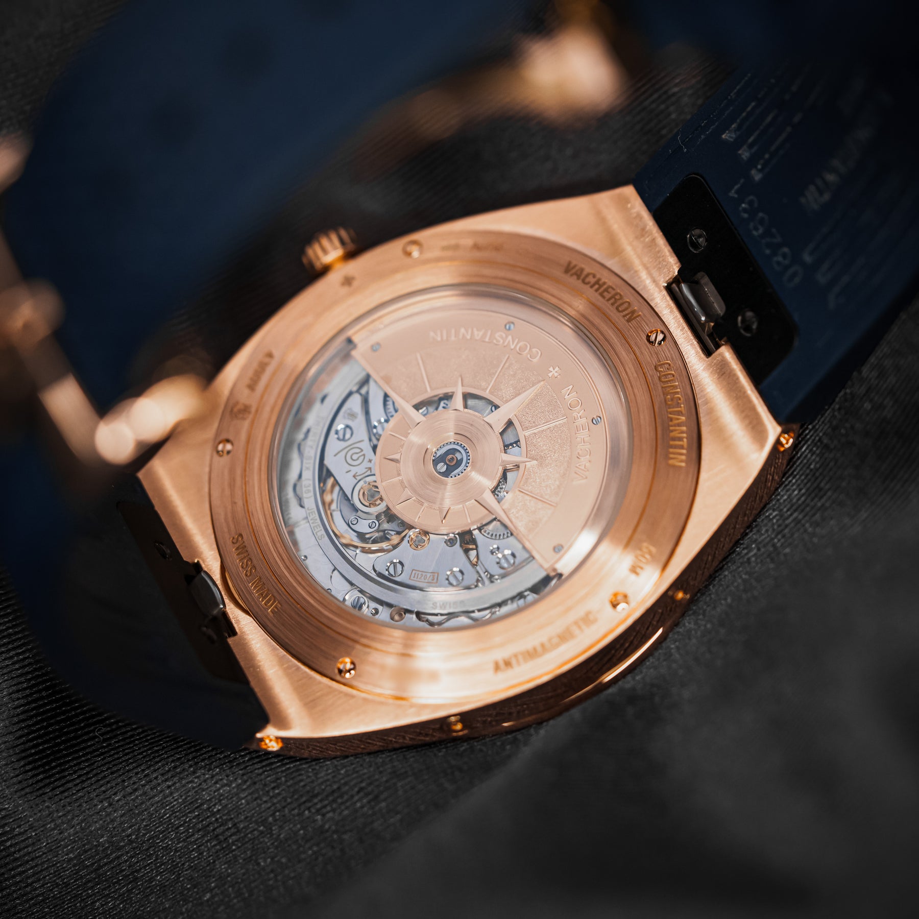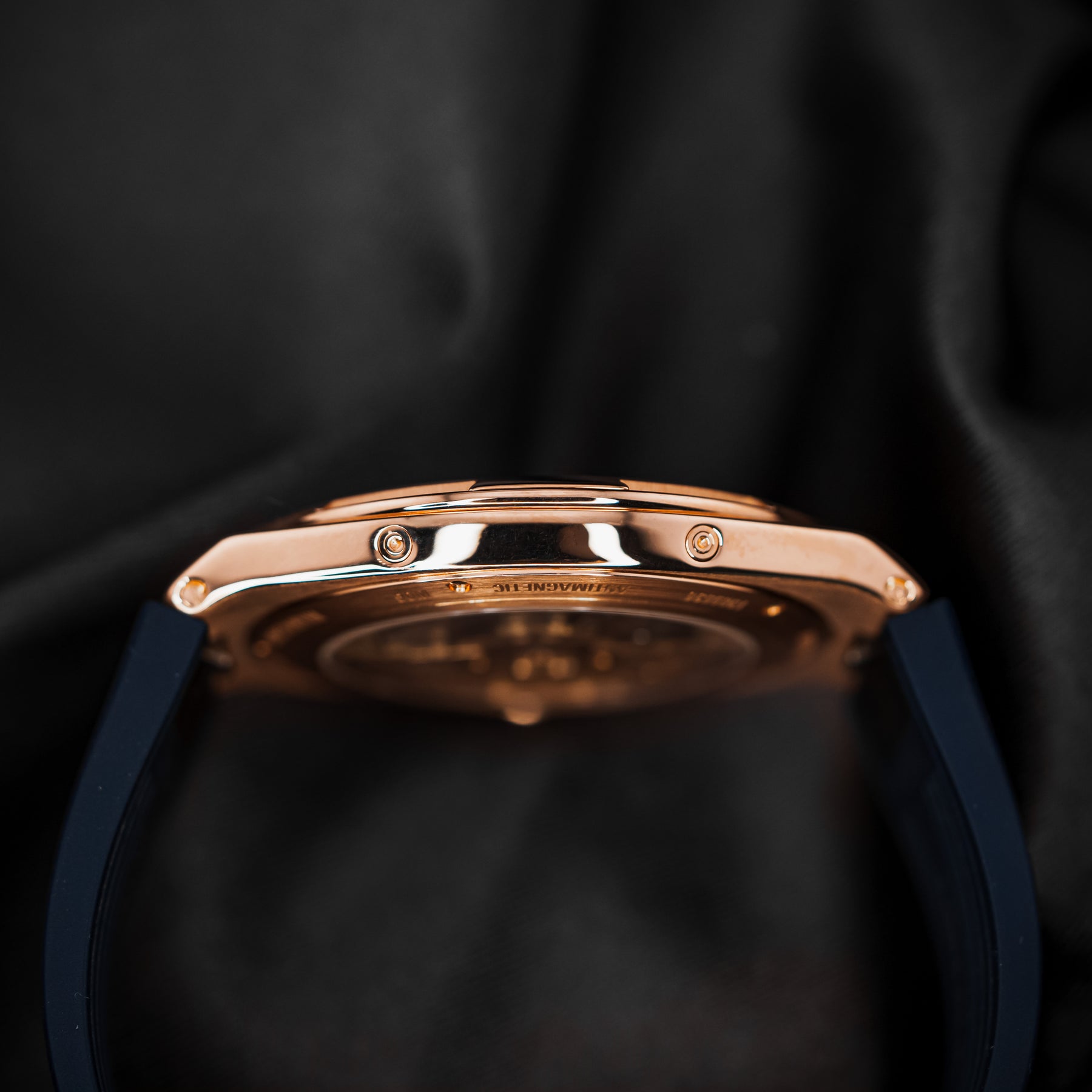 In many ways, the 4300V Ultra-Thin Perpetual Calendar in pink gold is as good as it gets – the ultimate grail. The 41.5mm case is a perfect size for almost any wrist, and Vacheron's beautiful white dial is one of the hottest combinations on the market. The case and quick-release integrated bracelet are made from Vacheron's own solid pink gold, stamped Au750. The dial of the 4300V is near perfection, featuring a month subdial at 12 o'clock (and a smaller leap year indicator within), a date subdial at 3 o'clock, a moonphase at 6 o'clock with the text "Vacheron Constantin Geneve" underneath, and a day of the week subdial at 9 o'clock. Even more astonishing is the fact that this five-complication watch is thinner than the 4300V's time-only counterpart, making it a feat of watchmaking engineering. Powering this watch is Vacheron's in-house Caliber 1120 QP/1 automatic movement with 40 hours of power reserve.